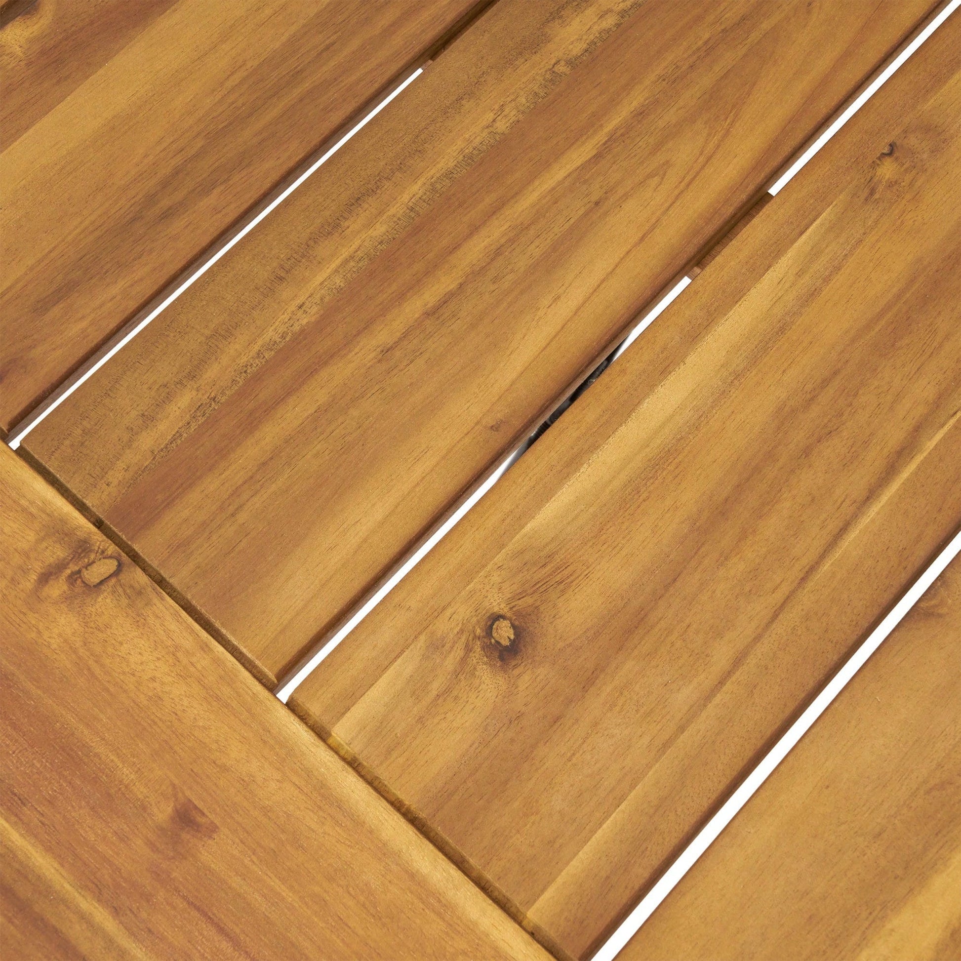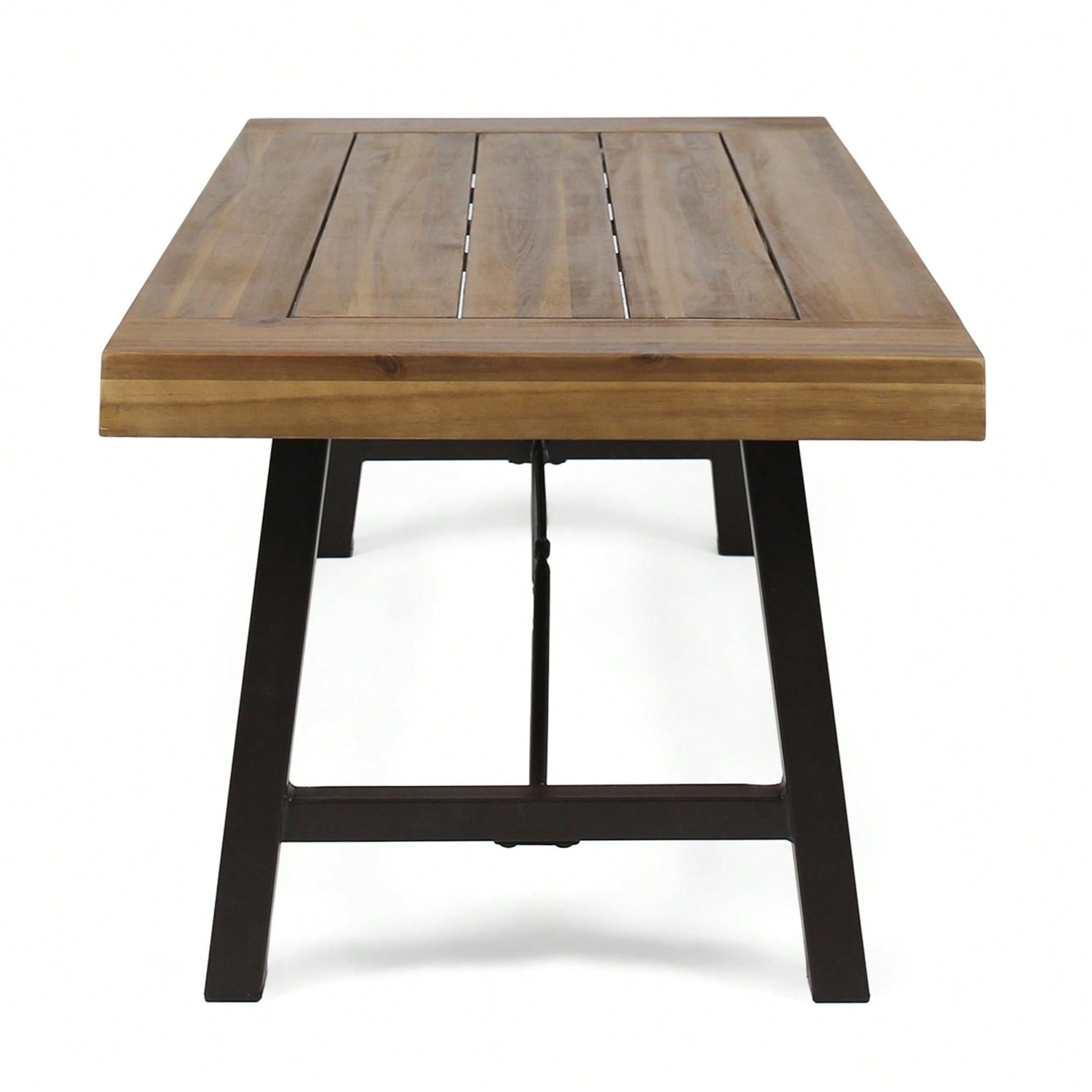 This outdoor coffee table combines a sleek powder-coated metal frame with rich acacia wood, creating a modern industrial aesthetic. The tabletop features sophisticated slat paneling, enhancing the table's elegant appearance. Designed to withstand outdoor conditions, the durable acacia wood maintains its beauty over time without darkening. This coffee table is a perfect addition to any outdoor space, providing both style and functionality.