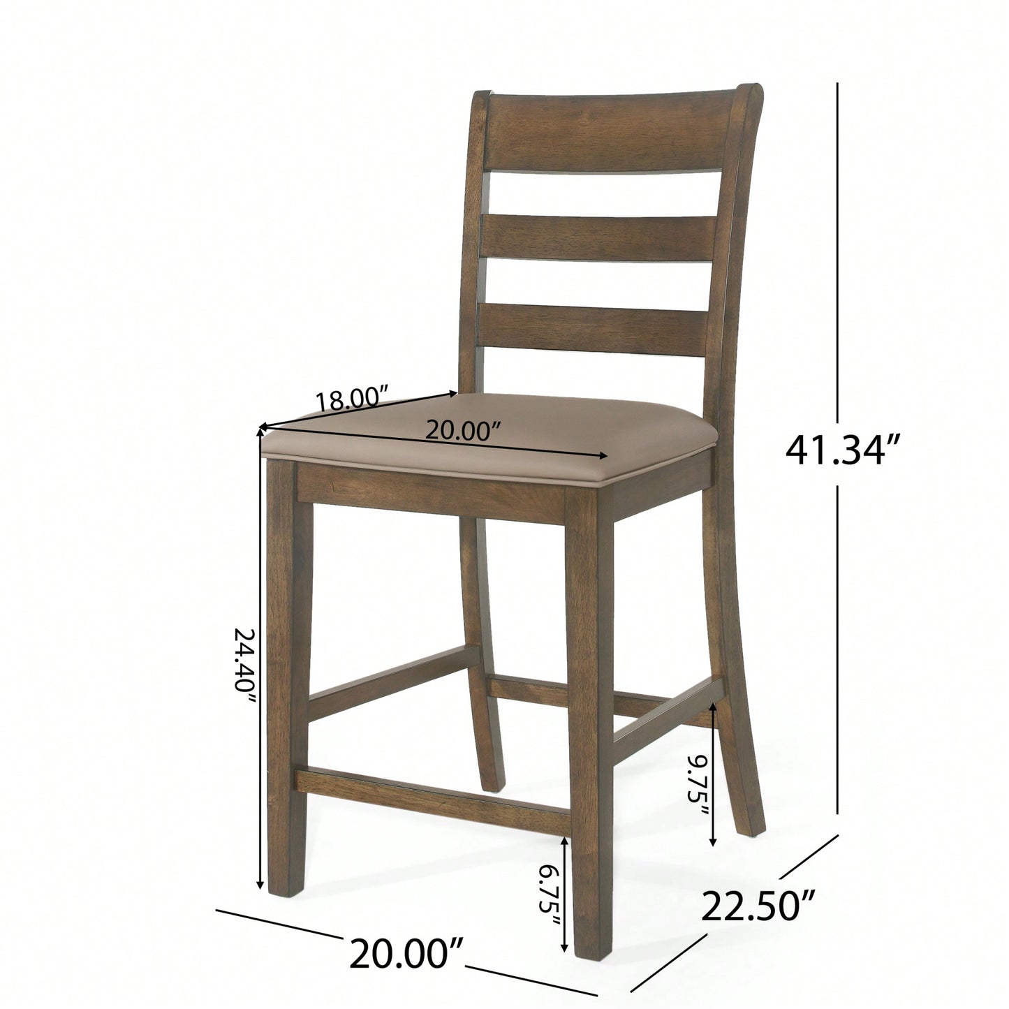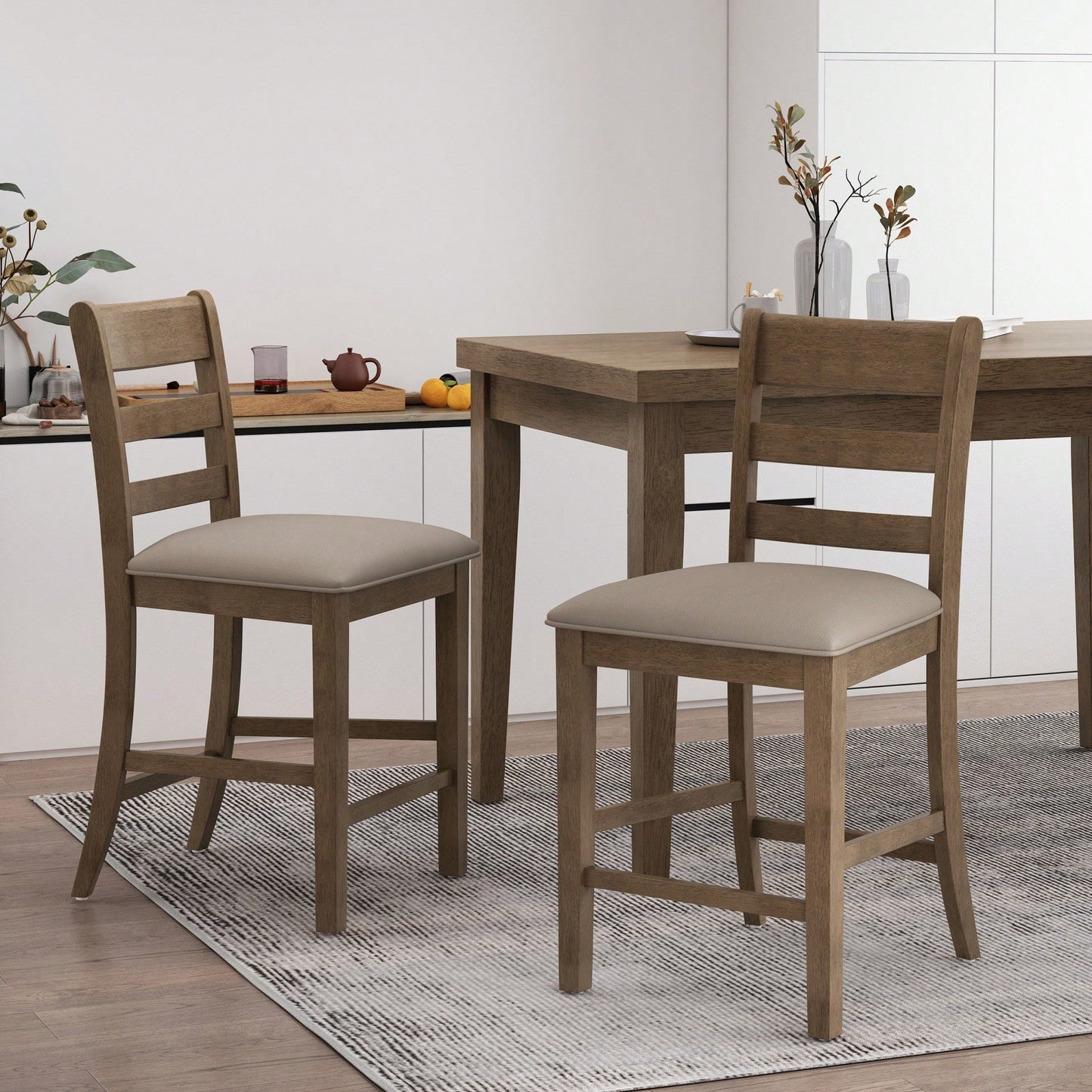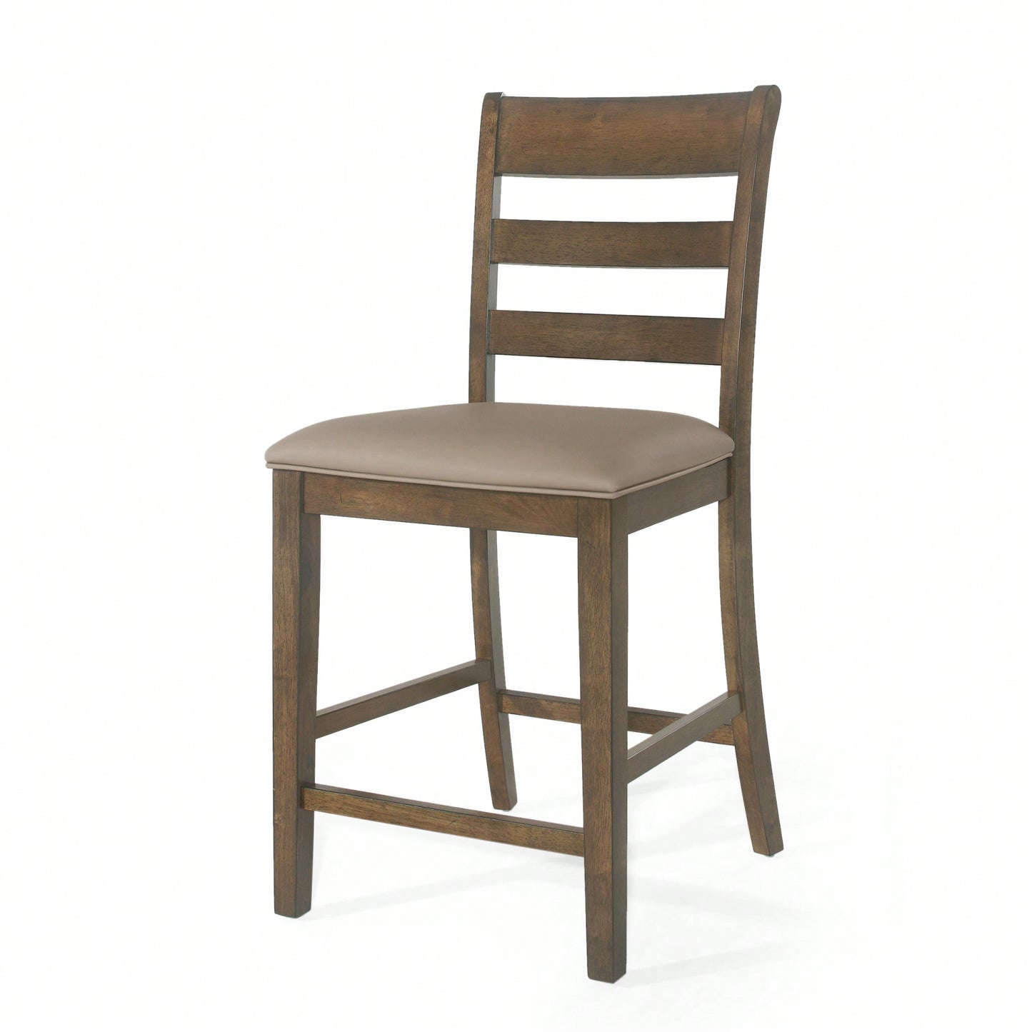 1. Features: - Set of 2 counter stools - Farmhouse style with charming simplicity - Classic ladder back design for a timeless look - Generously upholstered for comfort and elegance - Durable rubberwood frame with natural-grain finish 2. Product Description: Elevate your home bar or kitchen nook with this set of two counter stools that embody a rustic farmhouse vibe. The stools feature an open ladderback design that adds a classic touch, while the generously upholstered seating ensures comfort and a refined appearance. Crafted from durable rubberwood, these stools not only provide stability but also showcase a beautiful natural-grain look that enhances any living space. Perfect for adding a homey atmosphere to your dining area, these stools combine functionality with style. Specifications: - Material: Rubberwood - Style: Farmhouse - Design: Ladder back - Upholstery: Generously upholstered seating - Assembly: Required