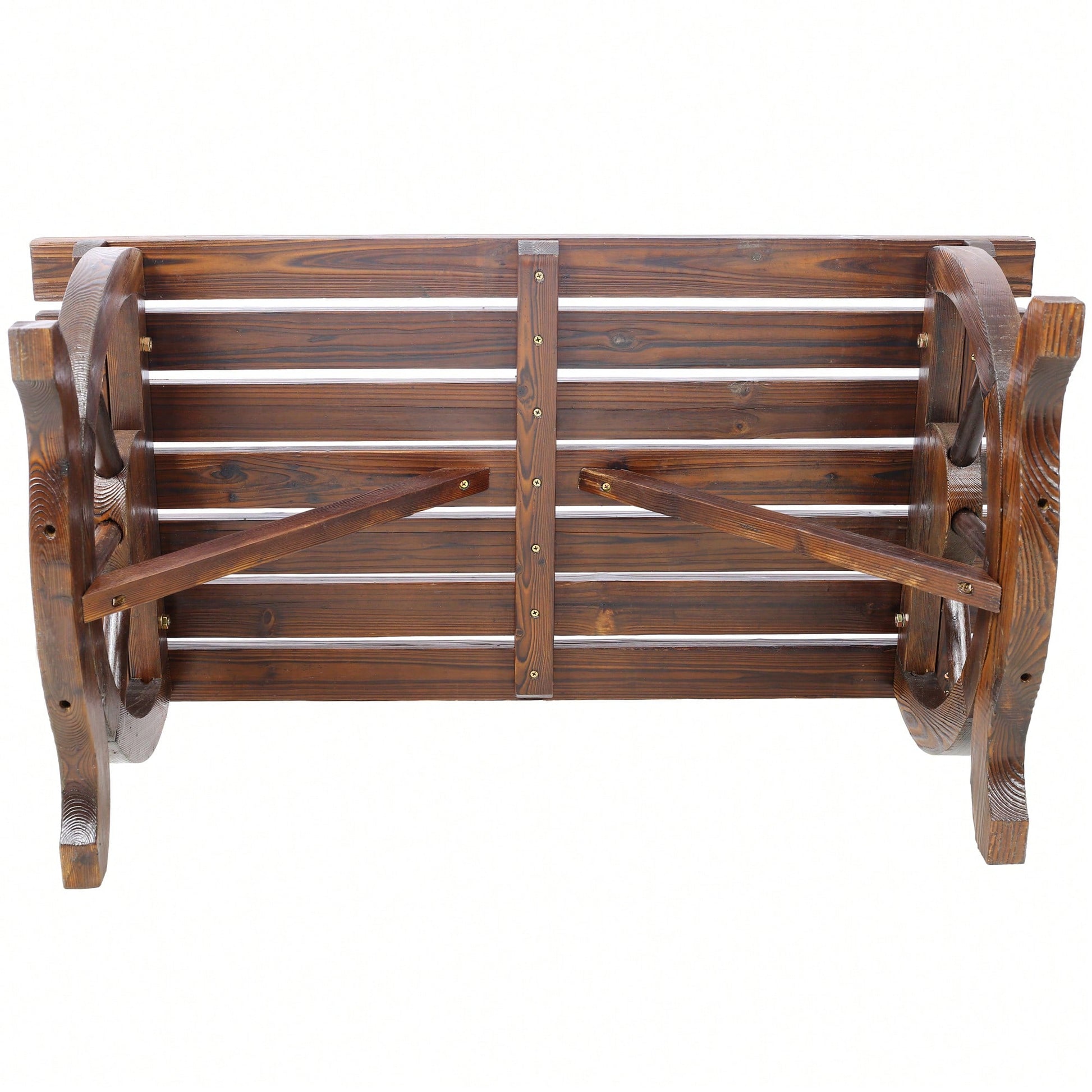 Rustic Wooden Outdoor Bench With Wagon Wheel Legs For Garden Patio Lawn And Porch Seating For Two