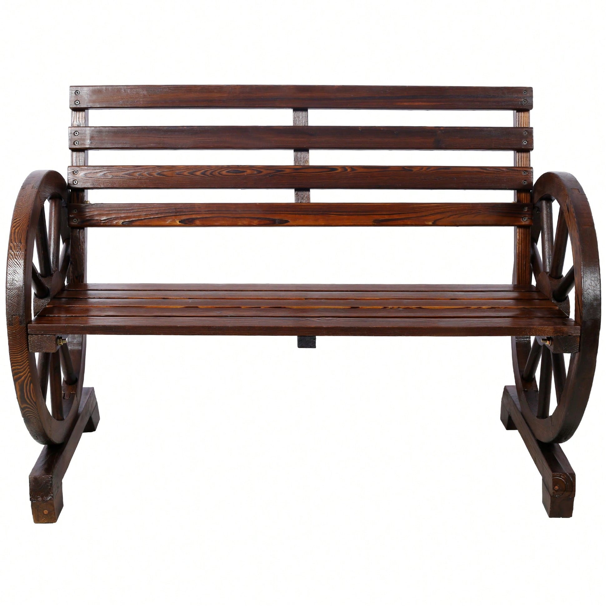Rustic Wooden Wagon Wheel Bench For Outdoor Patio Garden With Slatted Seat And Backrest - Brown