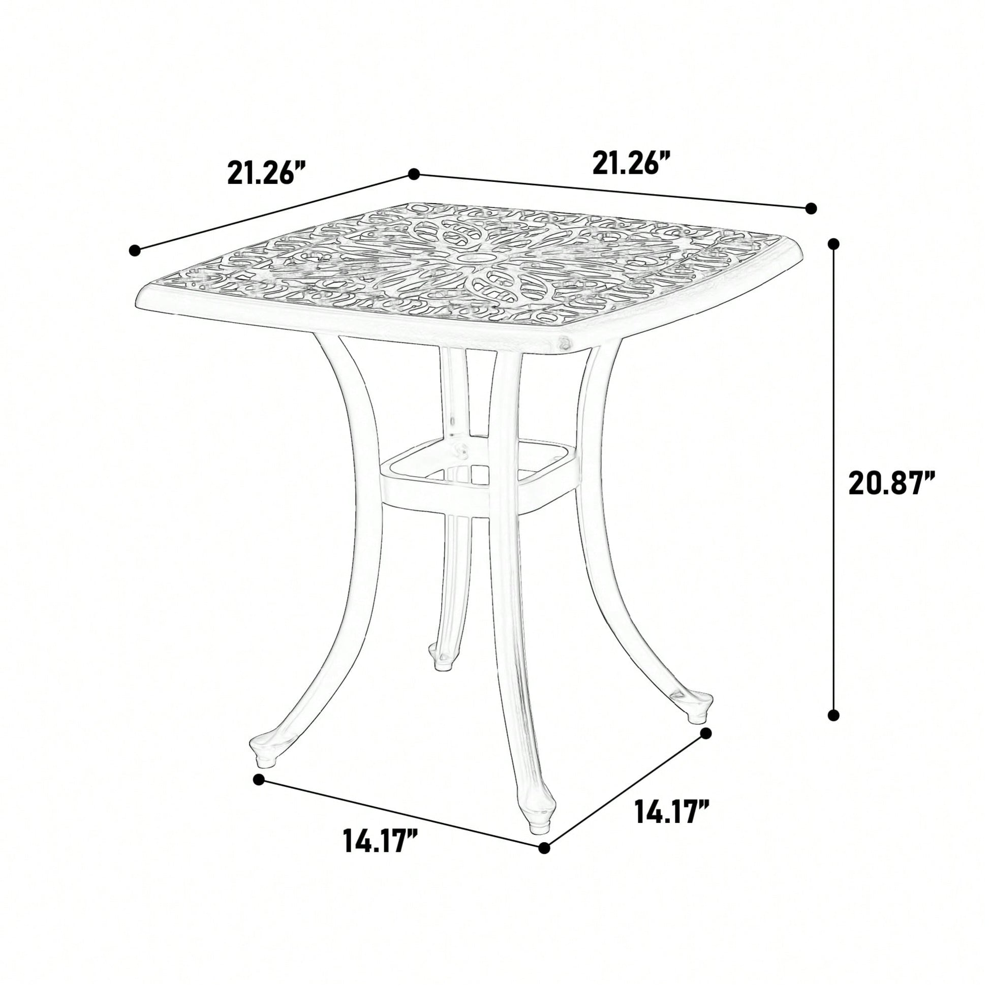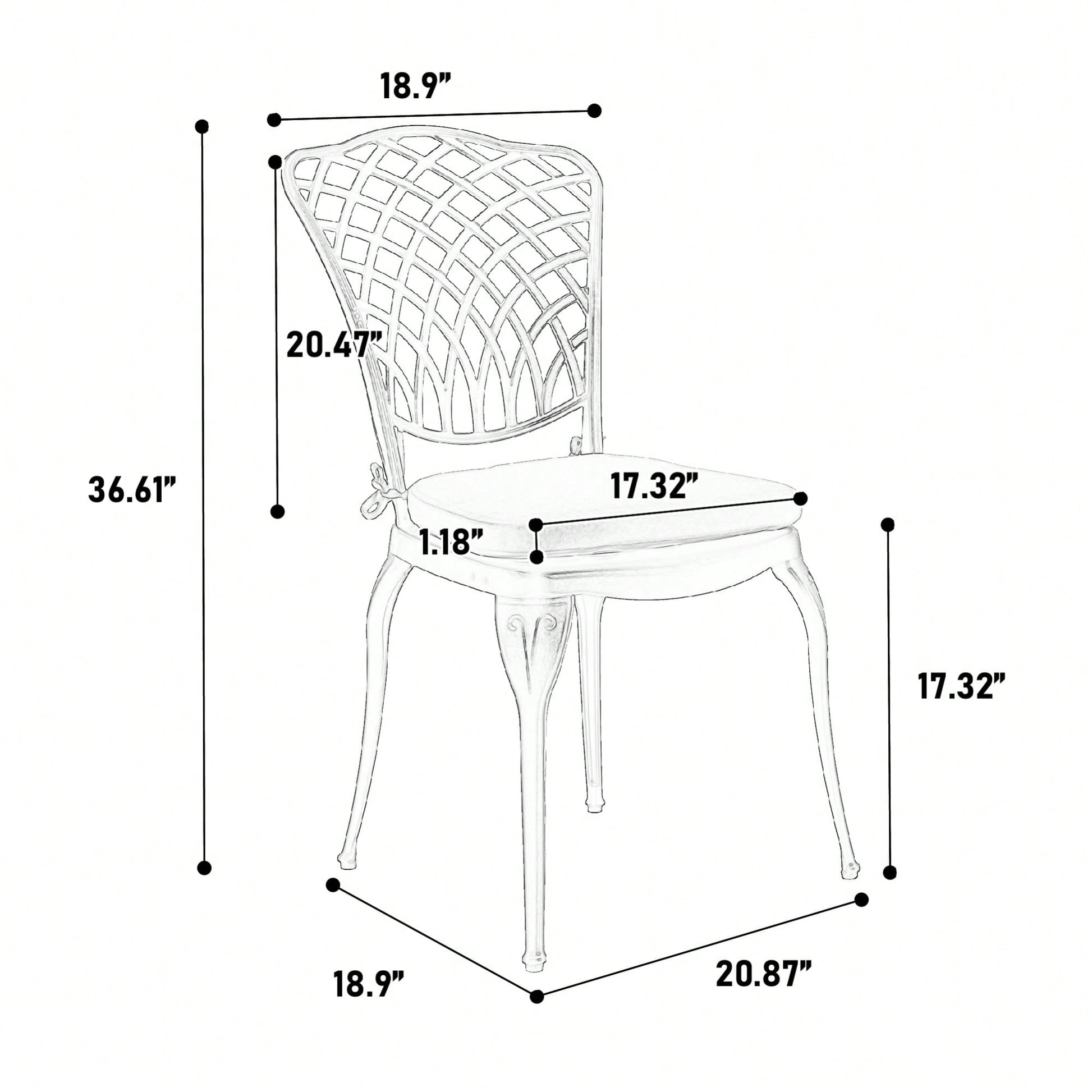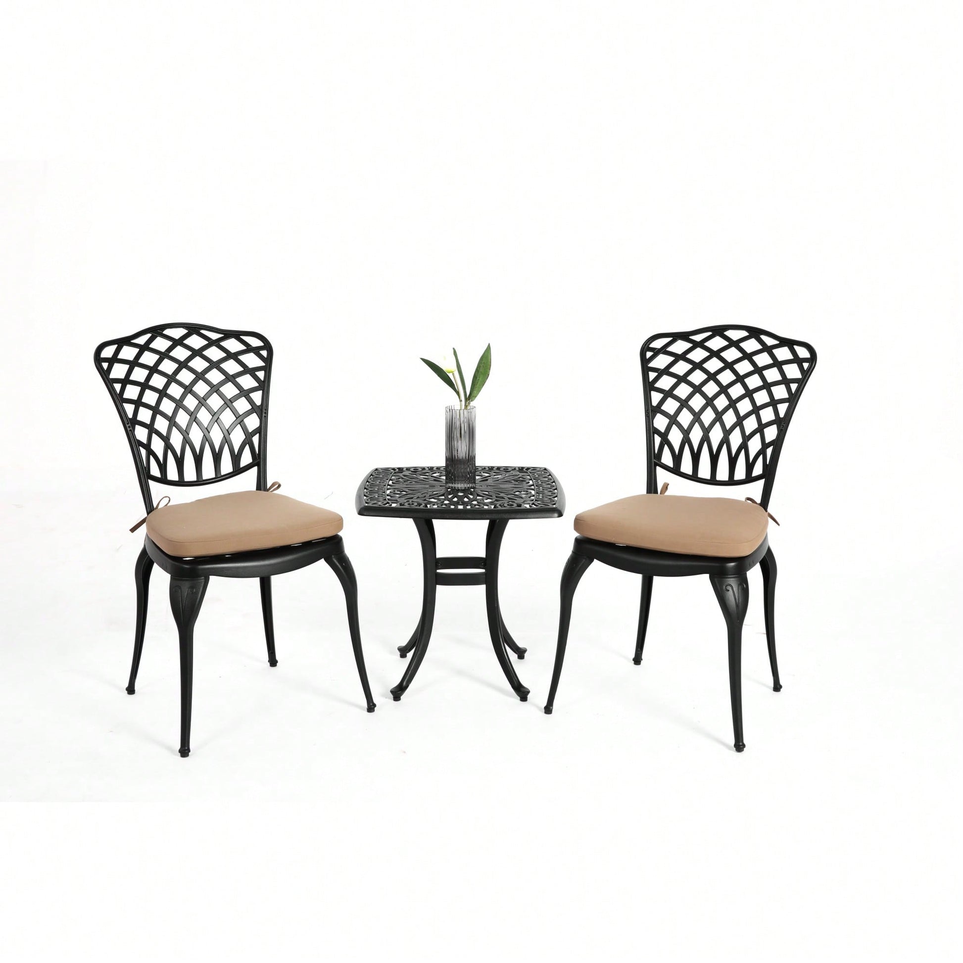1. Key Features - 3-piece set includes 2 chairs and 1 round table - Constructed from rustproof cast aluminum for durability - Classical design suitable for outdoor, garden, or balcony use - Cushions included for added comfort - Easy to assemble with minimal tools required 2. Product Description This 3-piece patio furniture set features a timeless classical design, perfect for enhancing your outdoor space. Made from rustproof cast aluminum, it promises long-lasting durability and resistance to the elements. The set includes two comfortable chairs with cushions and a stylish round table, making it ideal for enjoying meals or drinks outdoors. Assembly is straightforward, allowing you to quickly set up your new furniture and start enjoying your patio, garden, or balcony. Specifications - Material: Cast aluminum - Number of pieces: 3 (2 chairs, 1 table) - Cushion included: Yes - Assembly required: Yes