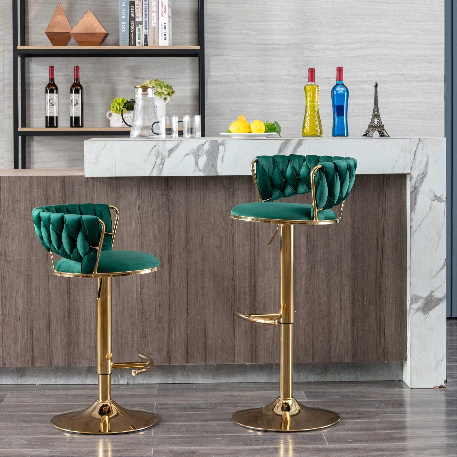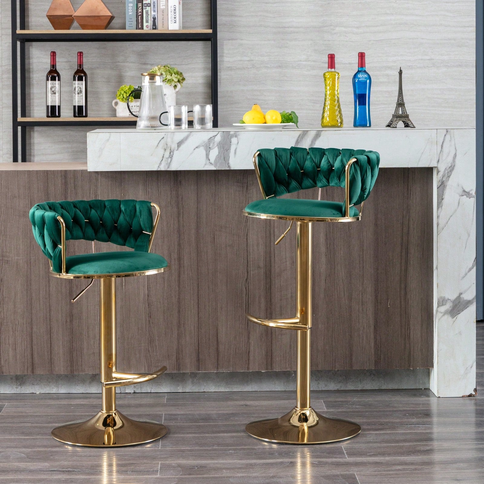 Set Of 2, Bar Stools, Chrome Footrest Swivel Height Adjustable Mechanical Lifting Velvet + Golden Leg Simple Bar Stool - Green