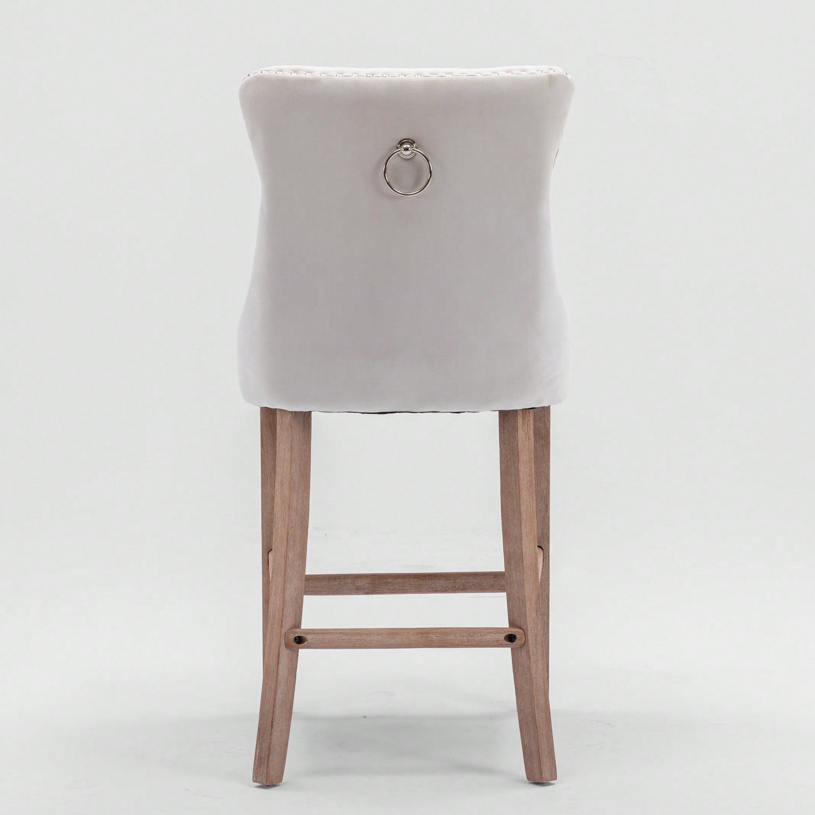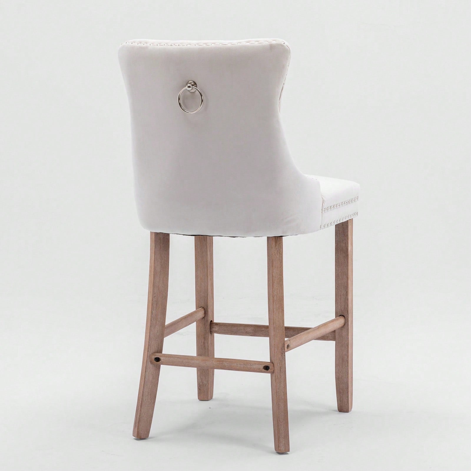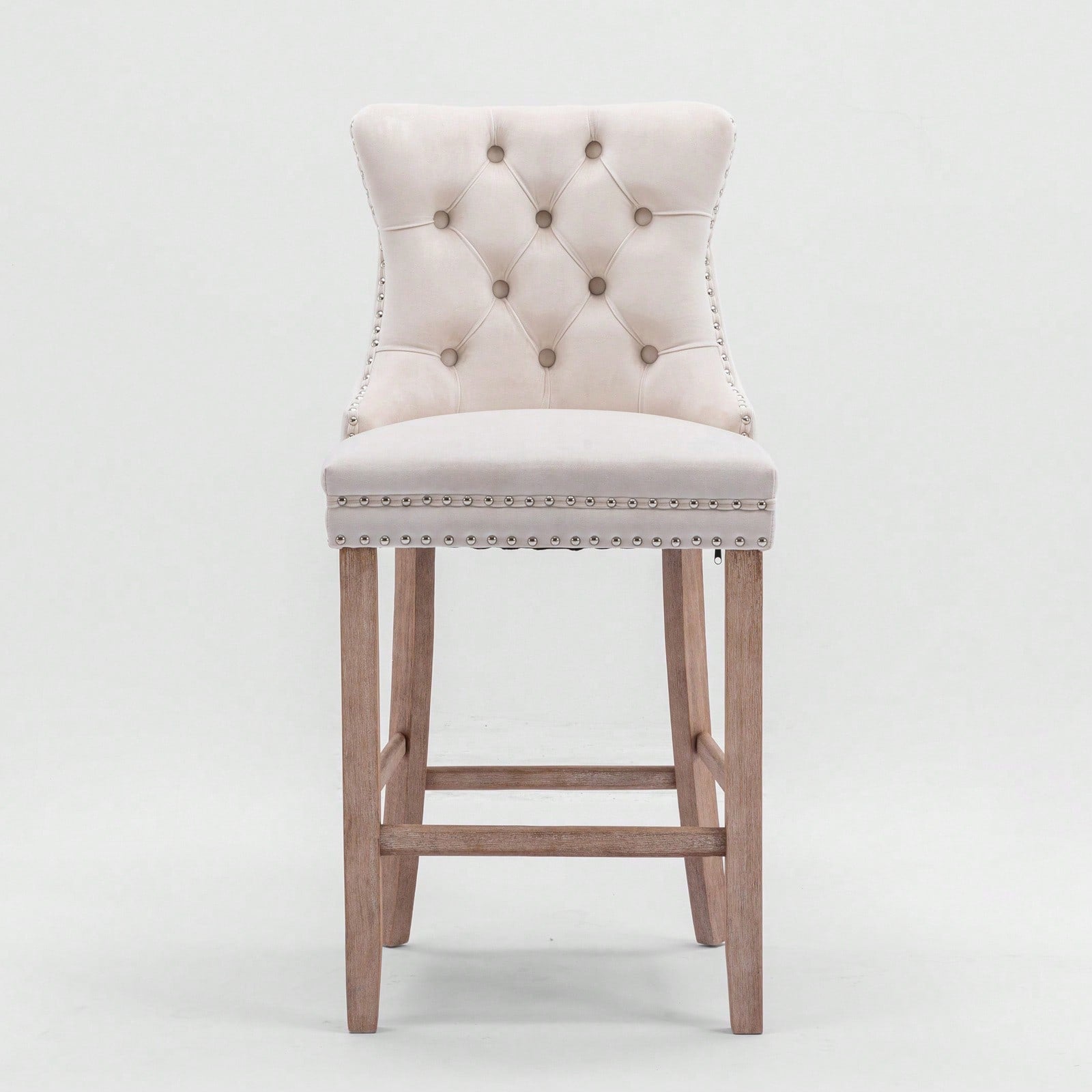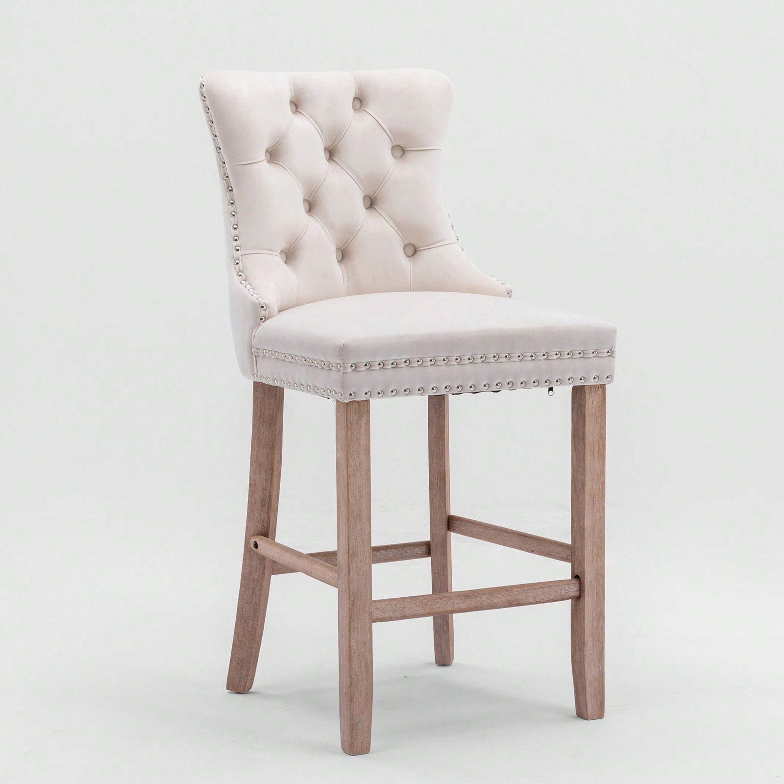 This set of two bar stools offers a luxurious and comfortable seating experience. The stools are upholstered in a soft, plush velvet fabric that is pleasant to the touch and adds a sophisticated feel. Designed with a mid-century modern aesthetic, the stools feature a high backrest with button tufting for added visual appeal and excellent back support. The seat cushion is filled with high-elasticity foam and multilayer board, providing a comfortable and supportive seat. The frame and legs of the stools are constructed from sturdy wood, ensuring stability and durability.