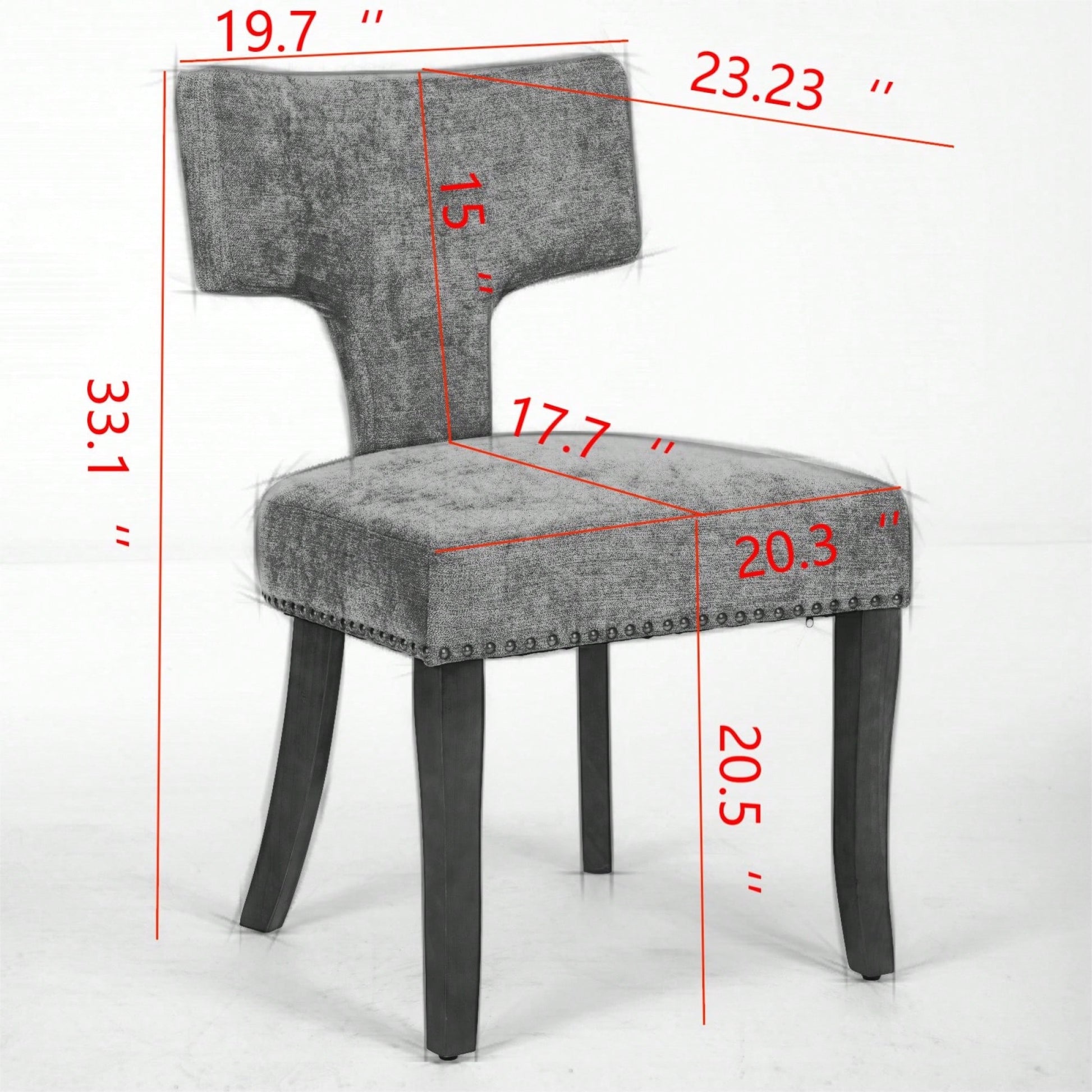 This dining chair set features a beautifully curved backrest embellished with copper nails, enhancing its sophisticated appeal. Upholstered with high-density foam and supported by a steel spring structure, the chairs provide a cozy and inviting seating experience. The walnut-colored solid wood legs not only add a touch of warmth but also come with adjustable balance studs for stability on any floor surface. The armless design and ergonomic structure further maximize comfort, allowing for extended use without feeling cramped. Ideal for dining rooms, living spaces, or apartments, these chairs bring a warm atmosphere to your decor. Assembly is straightforward with included instructions and tools, and the robust frame ensures that each chair can support up to 300 pounds. Adjustable pegs on the legs allow for customized height to suit your needs.