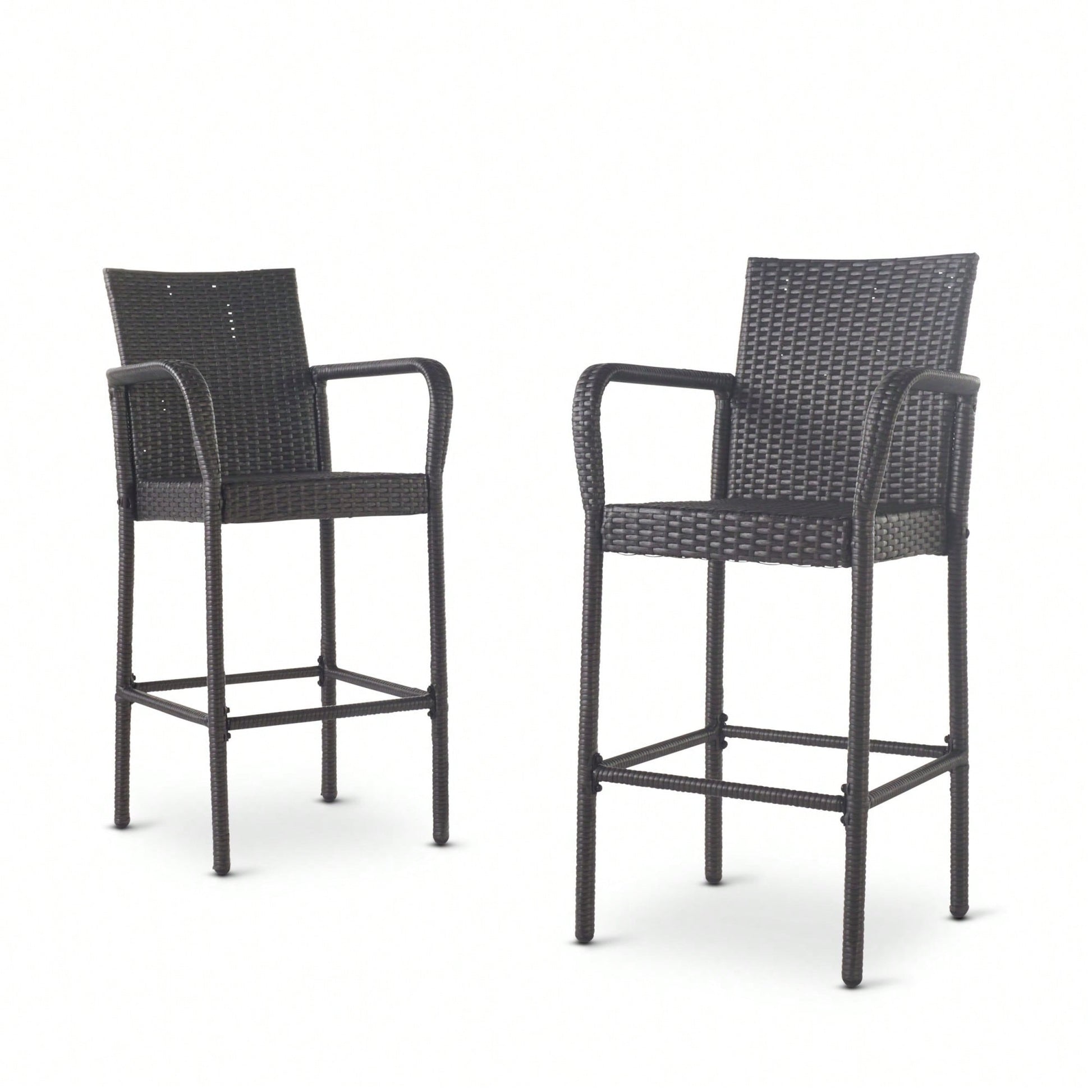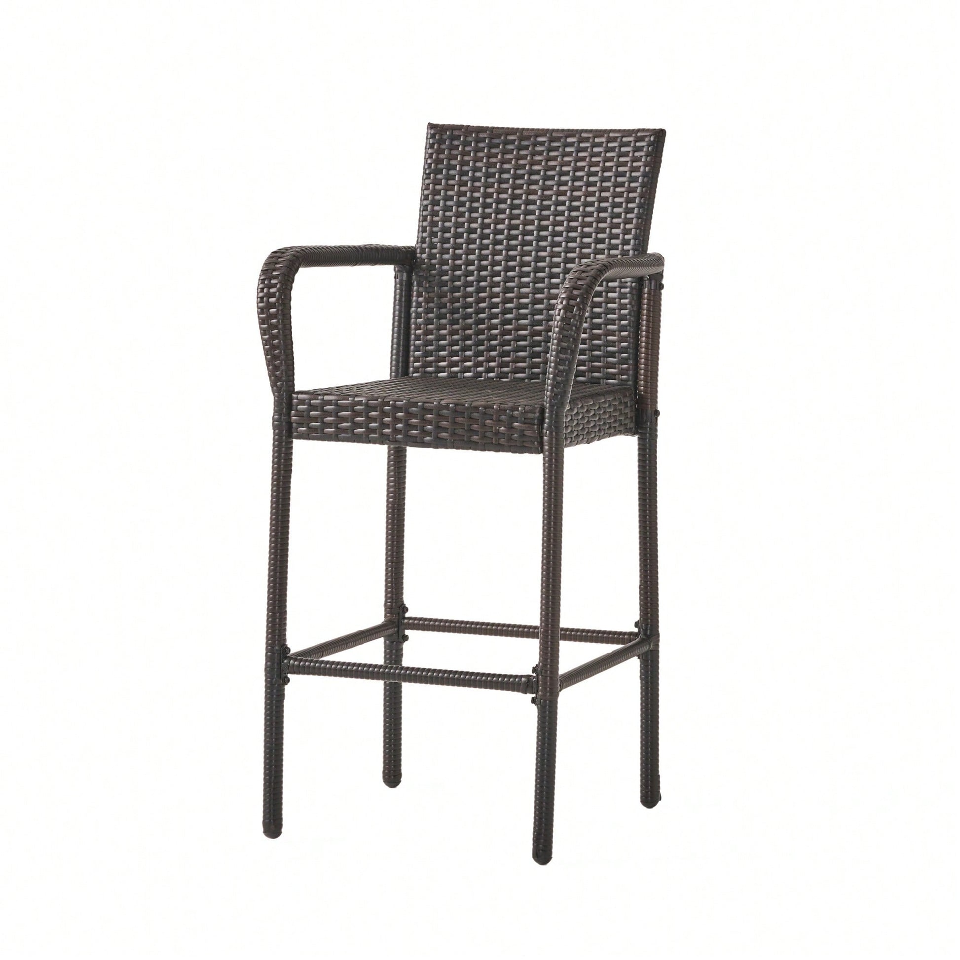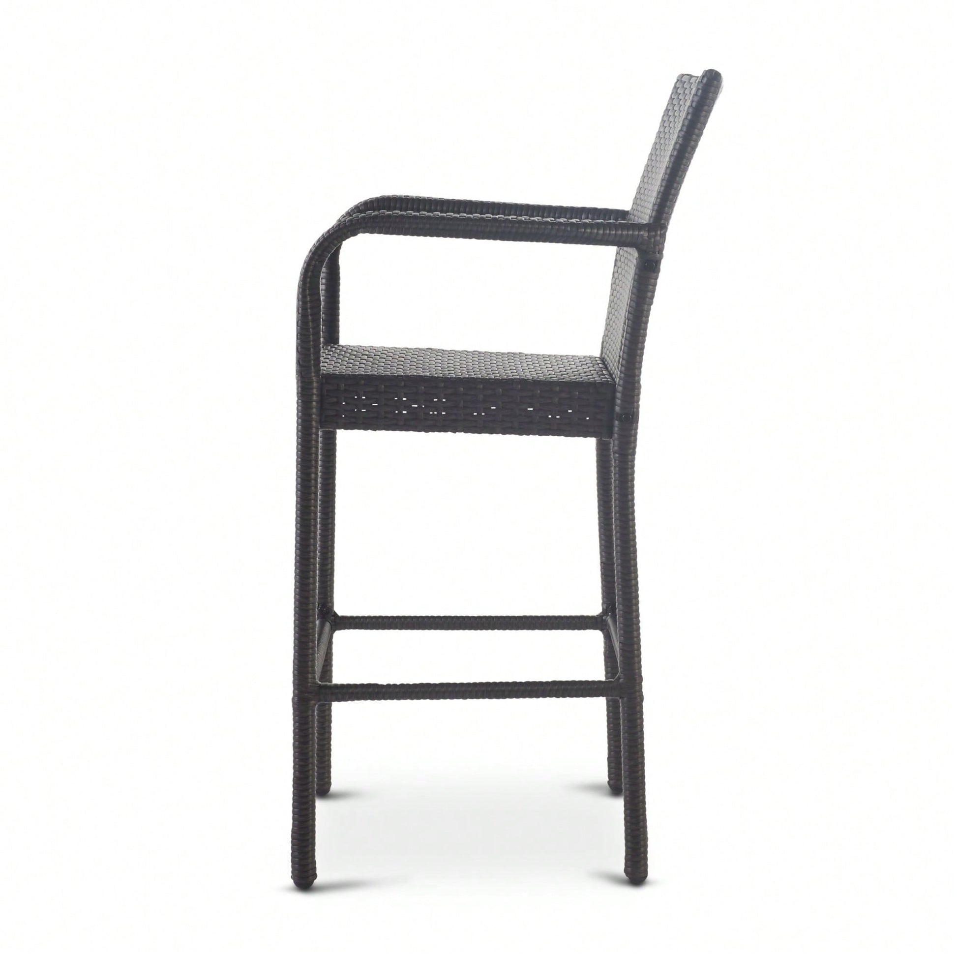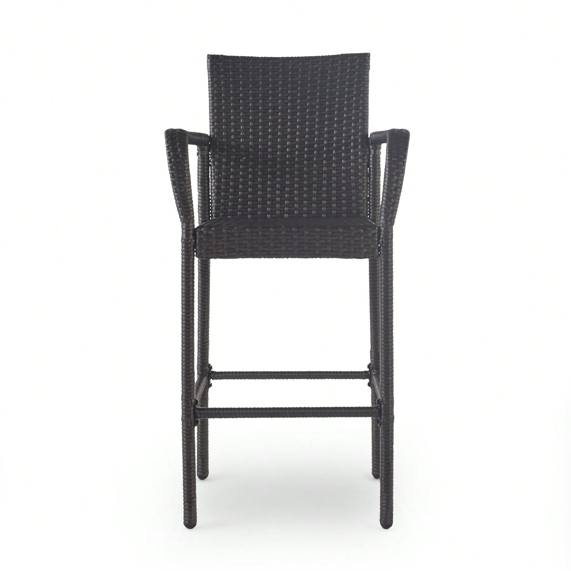 This bar stool is the perfect modern accessory for your outdoor area, featuring a chic, minimalistic look with a flared structure. The long-lasting woven finish of the polyethylene rattan ensures durability while allowing the stool to blend seamlessly with your outdoor decor. Constructed with a robust powder-coated metal frame, this piece is designed to withstand heavy use. While it is weather resistant, it is recommended to cover or store the stool during heavy or prolonged exposure to the elements.