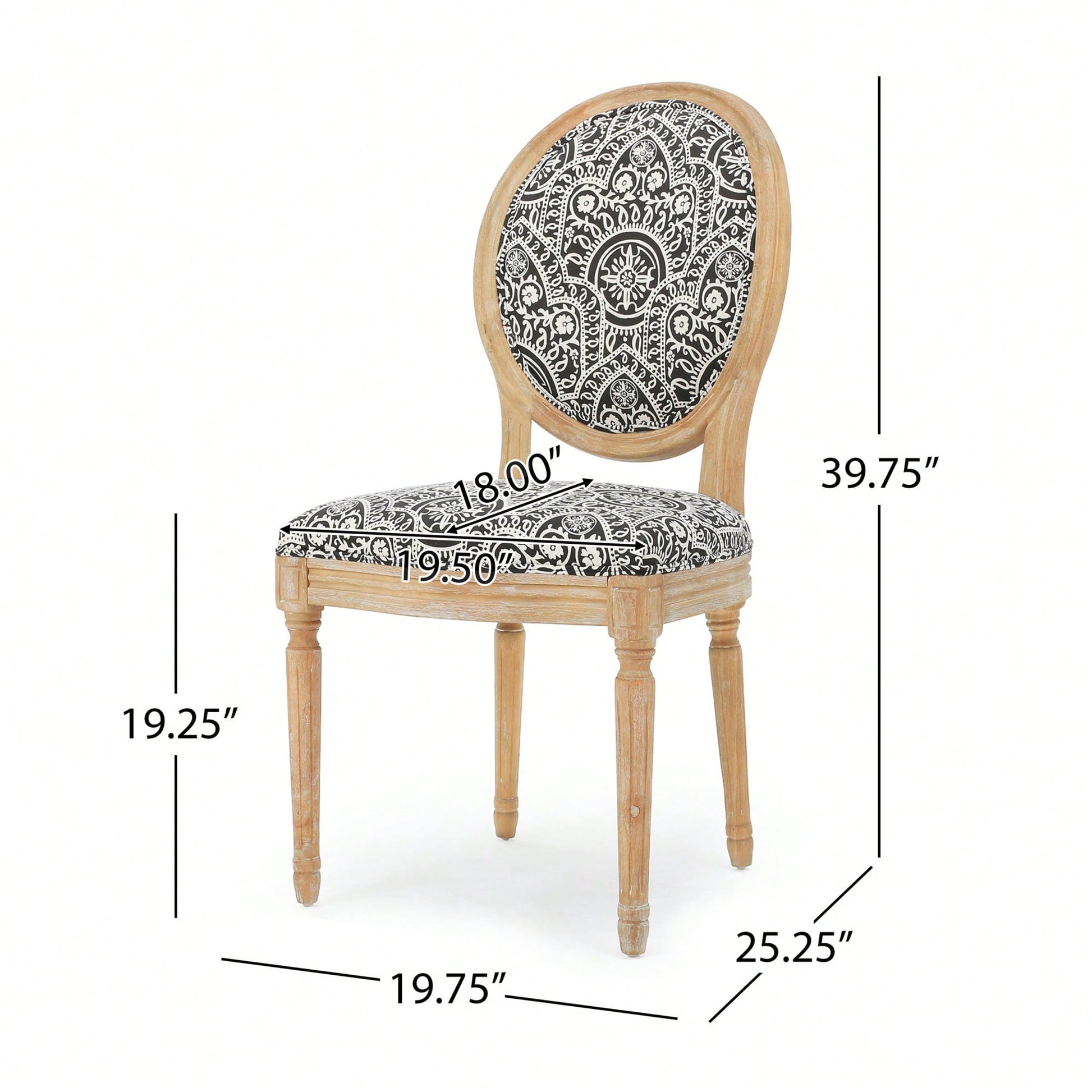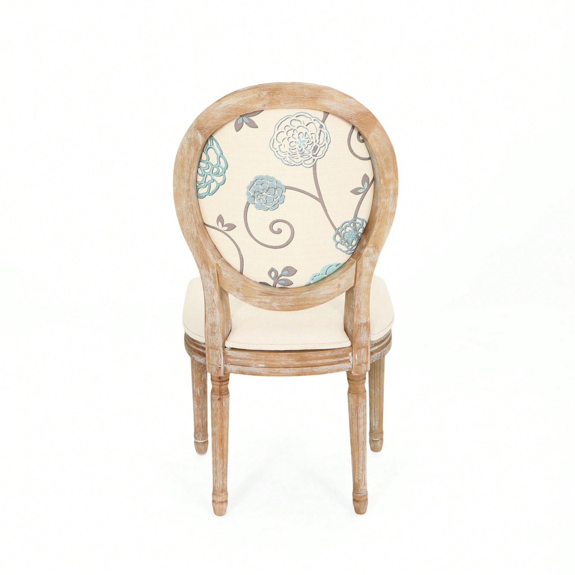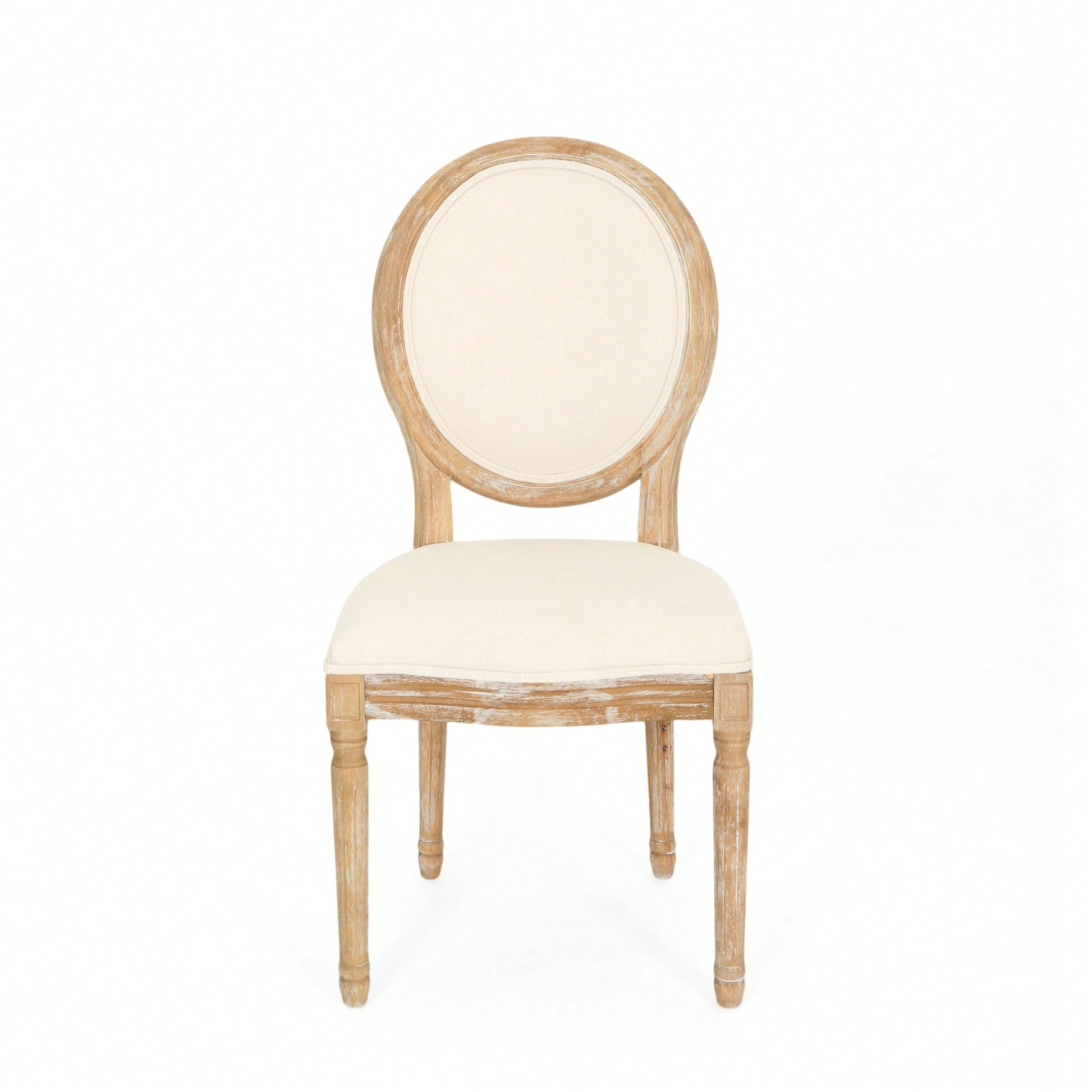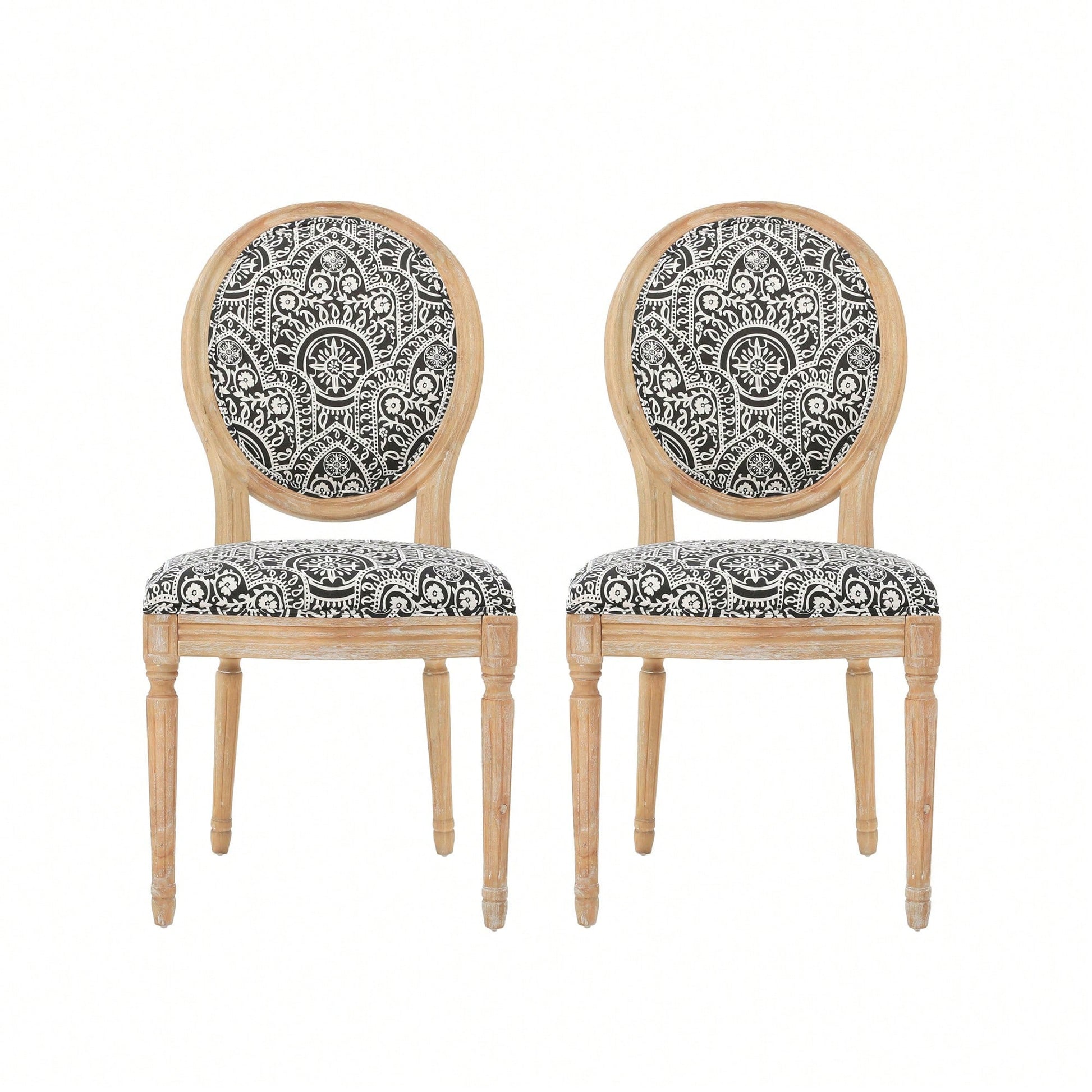 This 2-piece set of upholstered dining chairs enhances your modern farmhouse dining room with its classic silhouette and vintage-inspired aesthetics. Each chair is made from solid rubberwood, featuring a natural brown hue that is distressed for an antique feel. The design showcases a traditional King Louis back and four slender fluted legs, embodying French country inspiration. The chairs are generously upholstered, providing a smooth texture and exceeding comfort, making them a refined addition to any space.