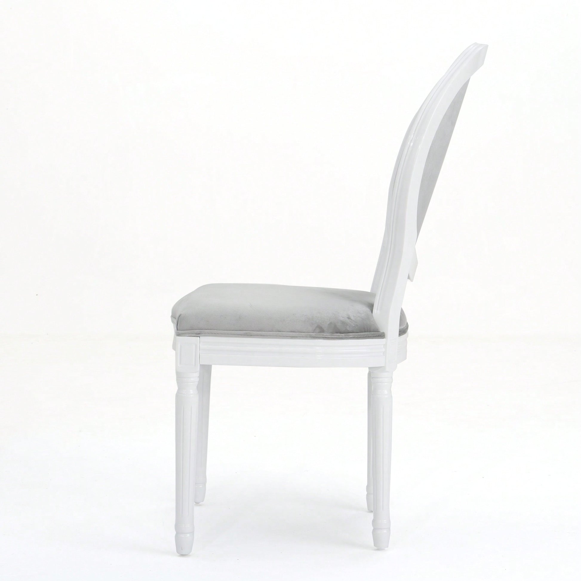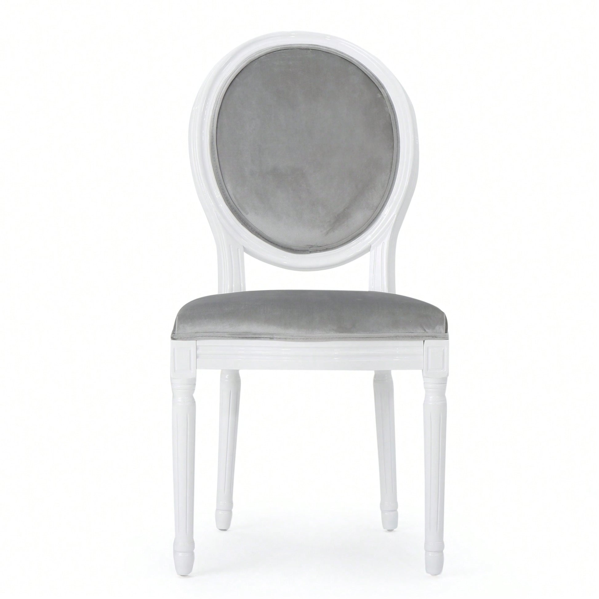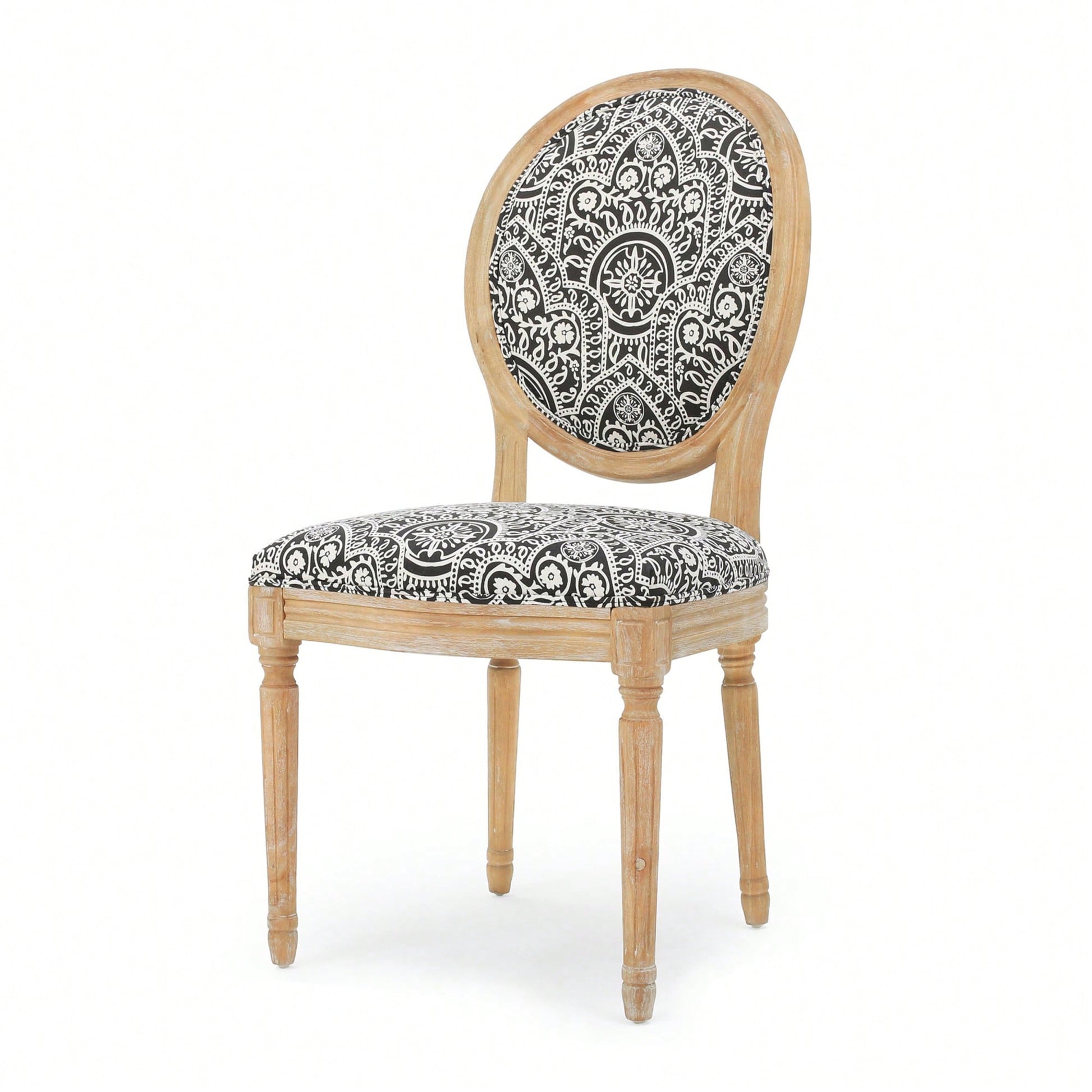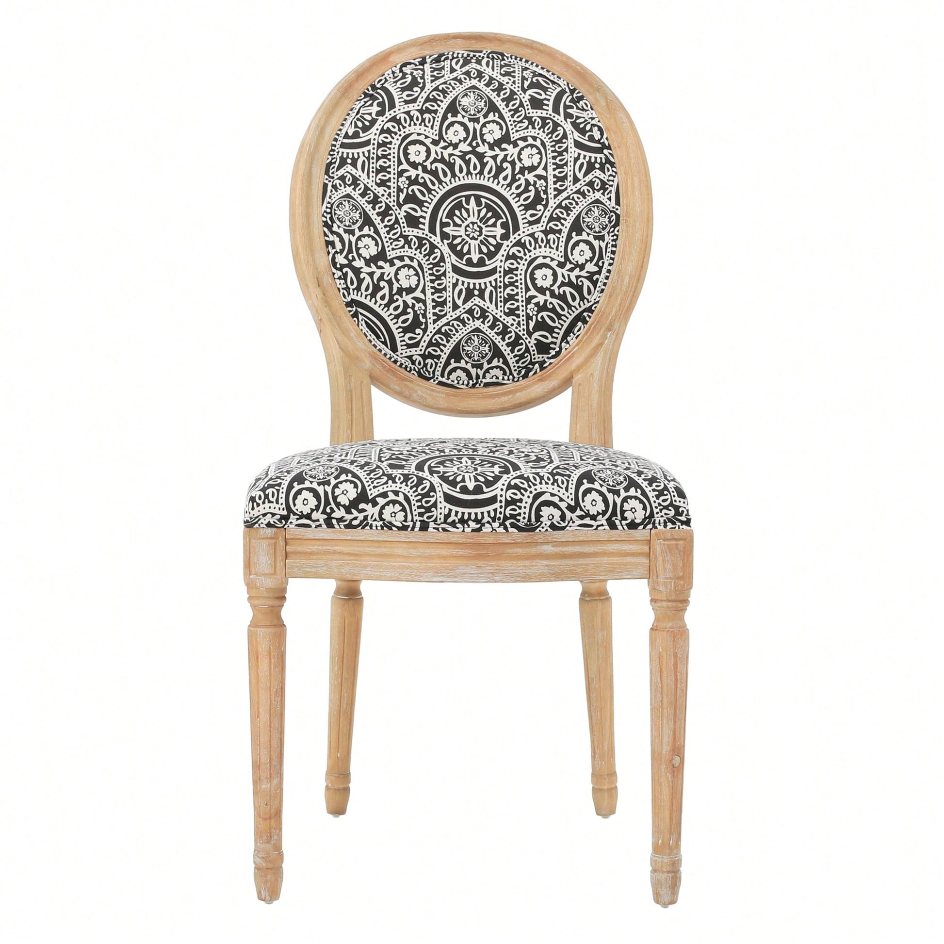 This 2-piece set of upholstered dining chairs enhances your modern farmhouse dining room with its classic silhouette and vintage-inspired aesthetics. Each chair is made from solid rubberwood, featuring a natural brown hue that is distressed for an antique feel. The design showcases a traditional King Louis back and four slender fluted legs, embodying French country inspiration. The chairs are generously upholstered, providing a smooth texture and exceeding comfort, making them a refined addition to any space.