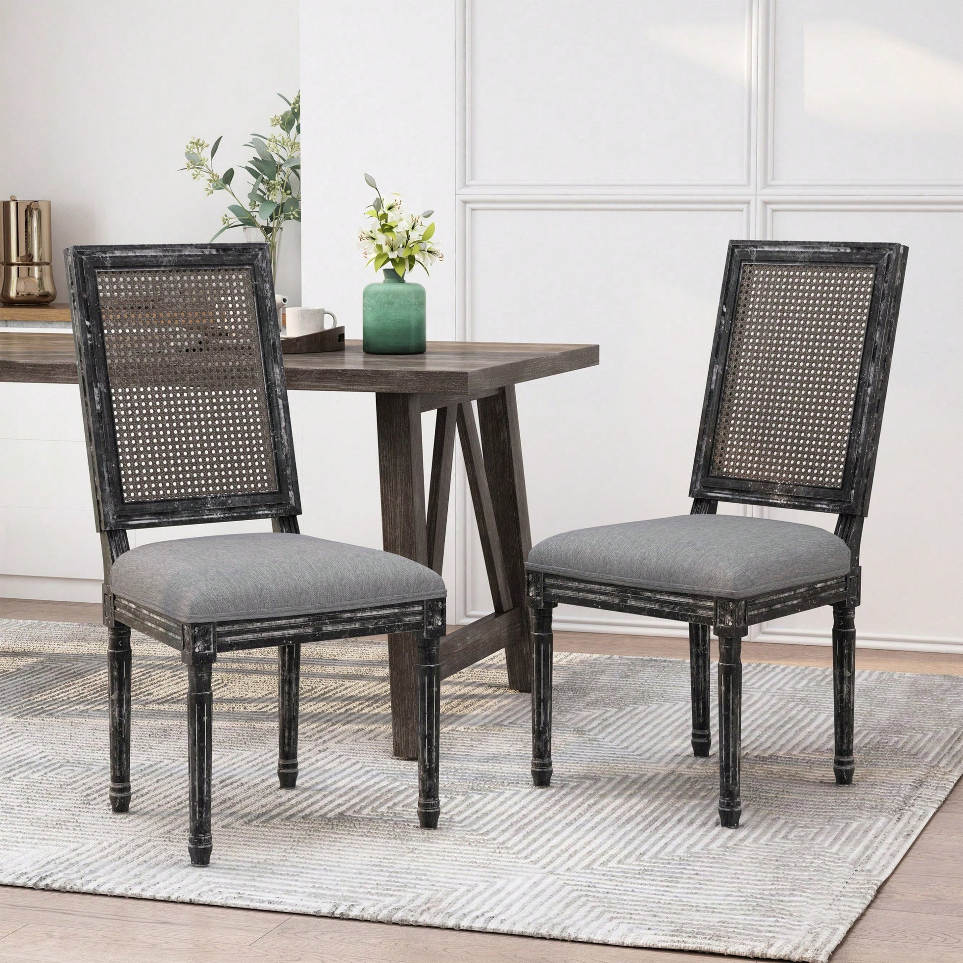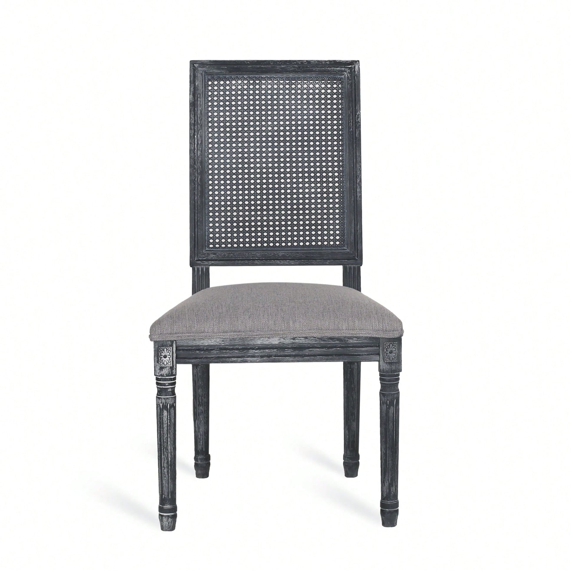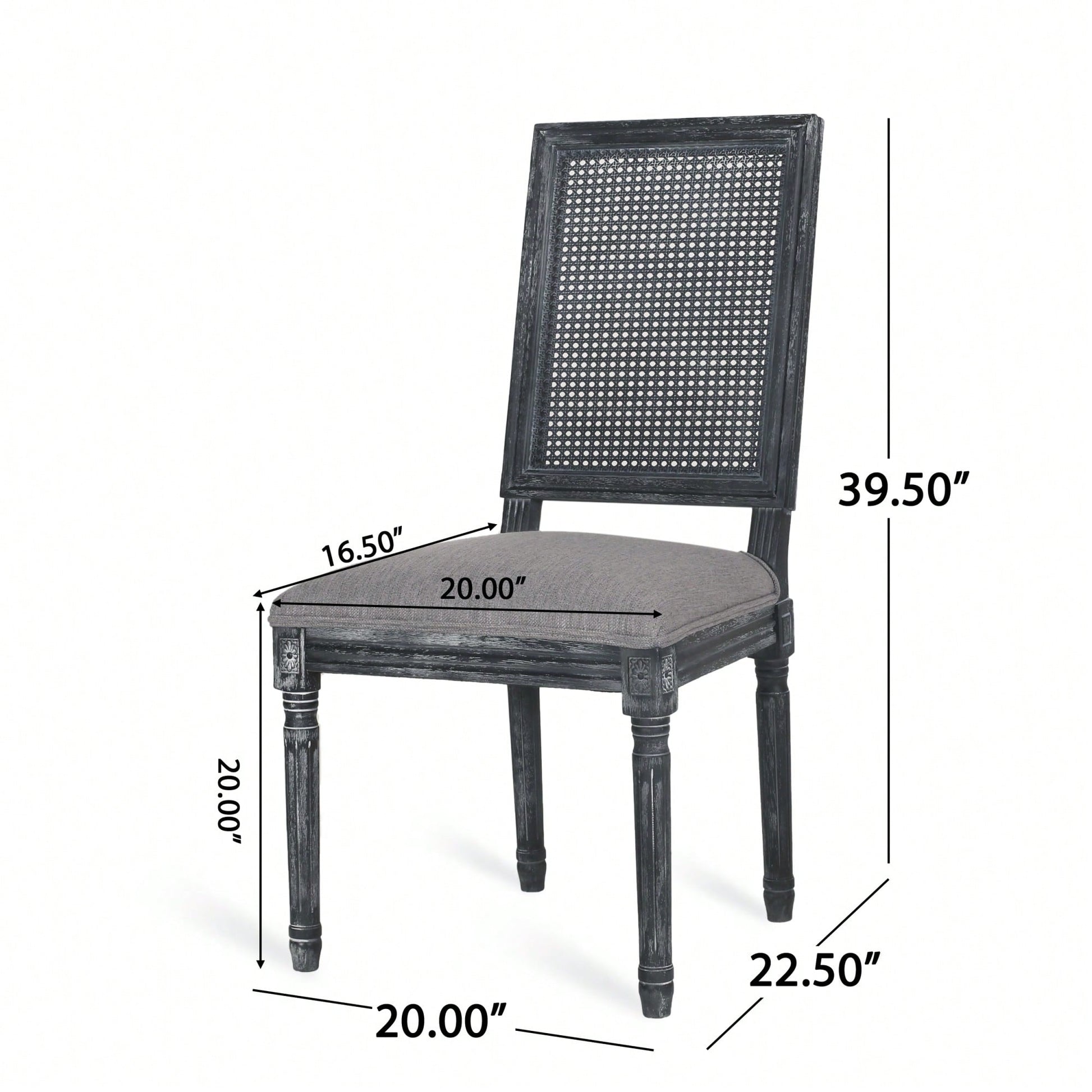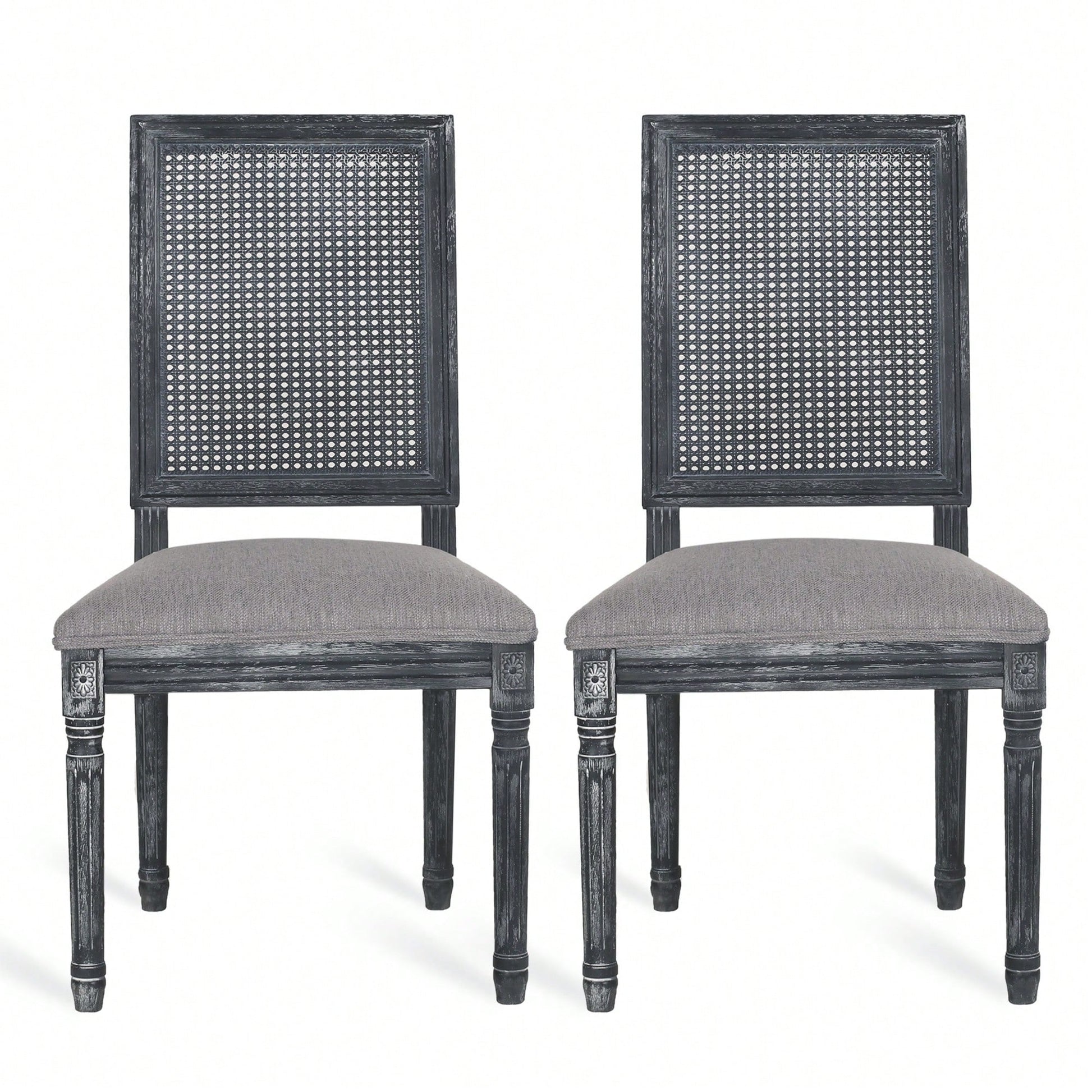 These finely crafted dining chairs elevate your dining space into a masterpiece. With a design that draws from French country inspiration, the understated rectangular backrest made of cane complements the smooth upholstered seating, ensuring both elegance and comfort. The fluted legs provide a distinctive flair while maintaining the chairs' old-fashioned roots. Perfect for those looking to add a touch of sophistication to their home.