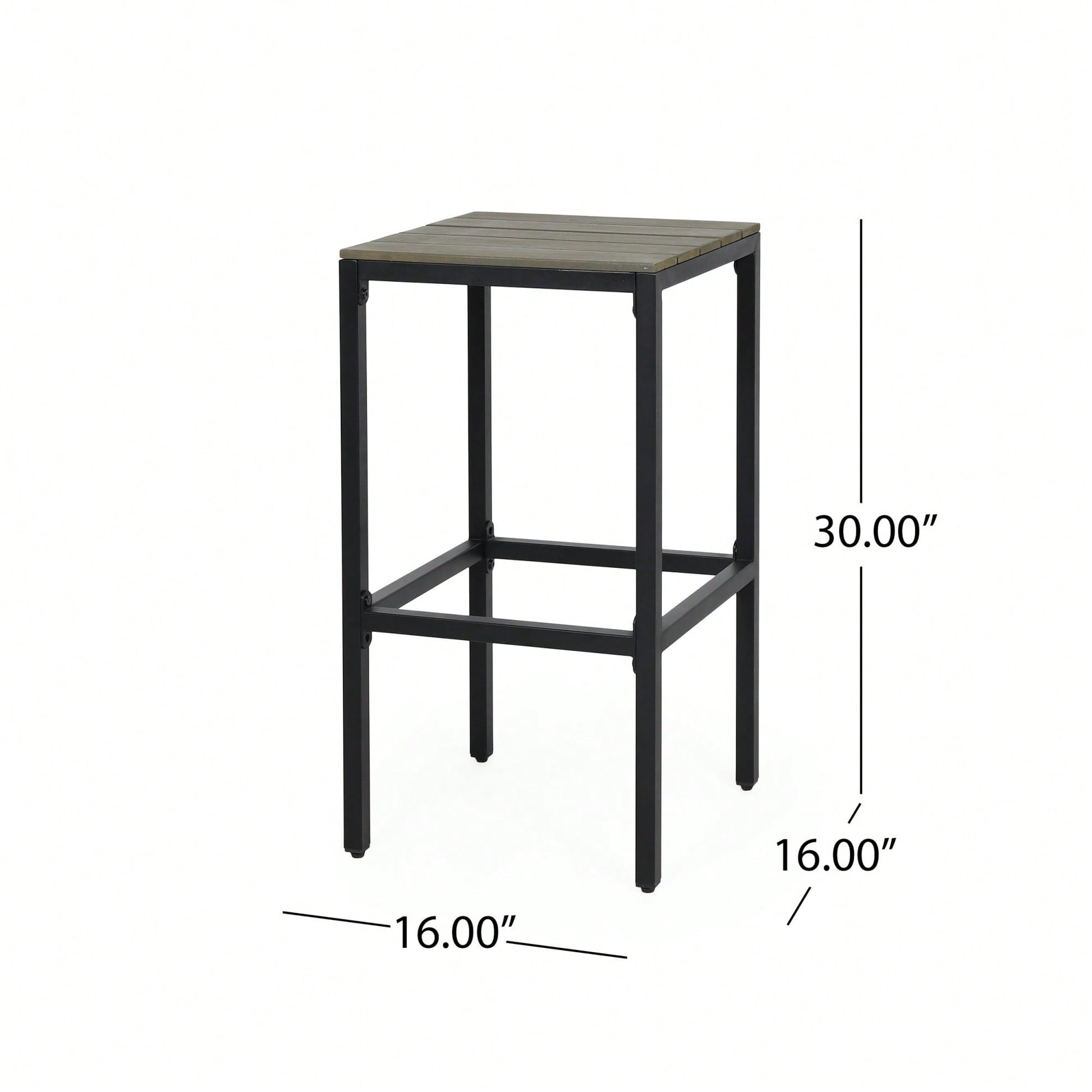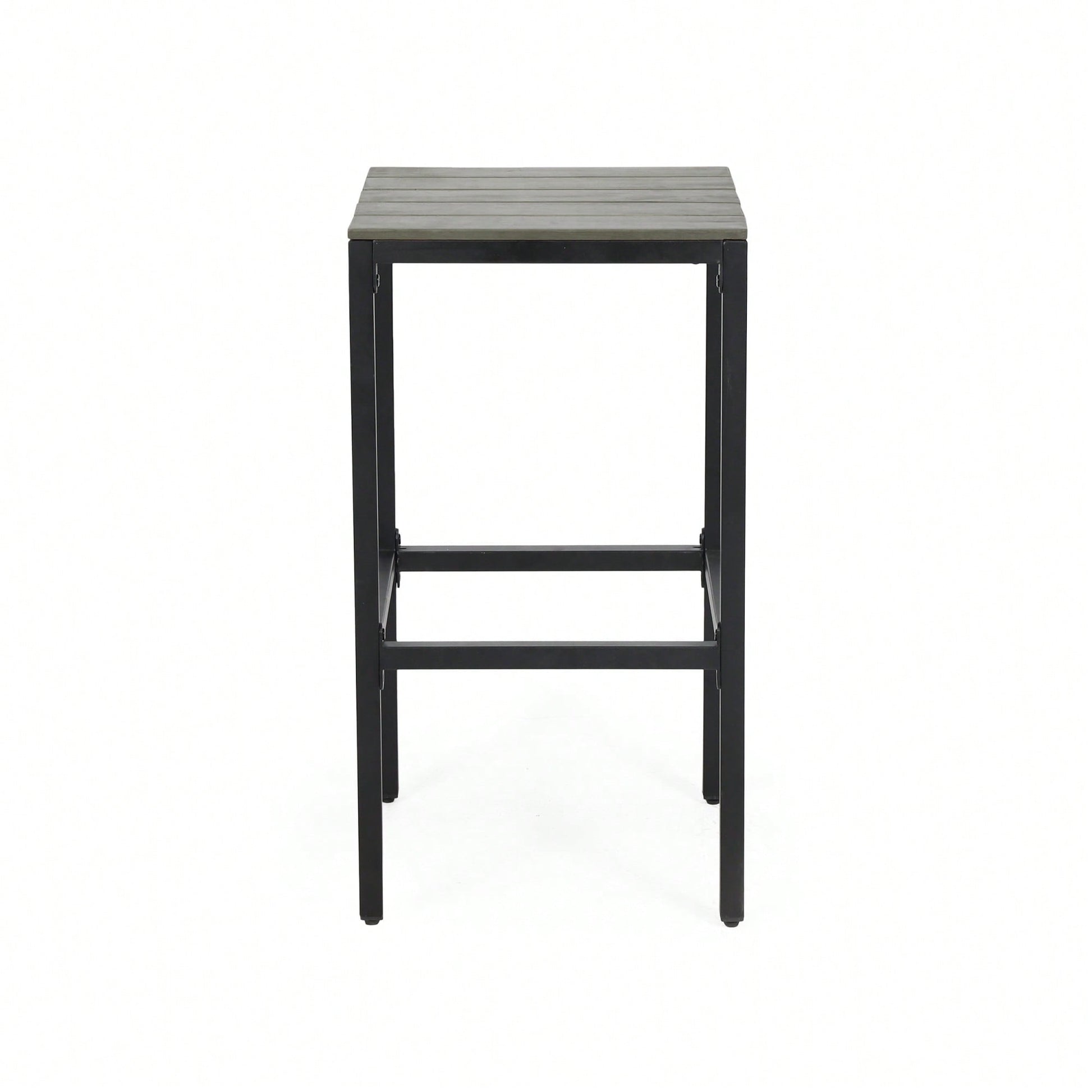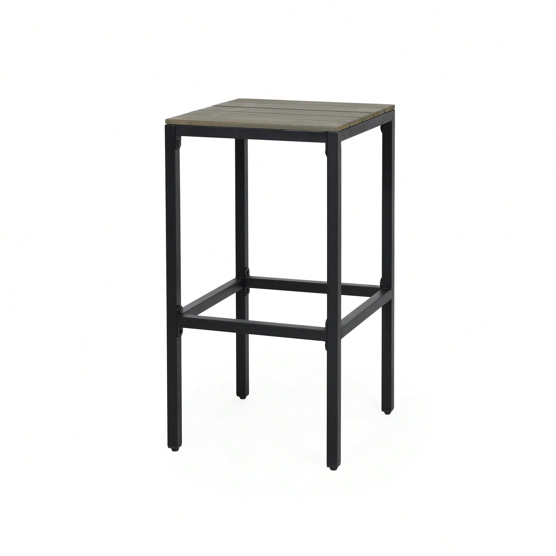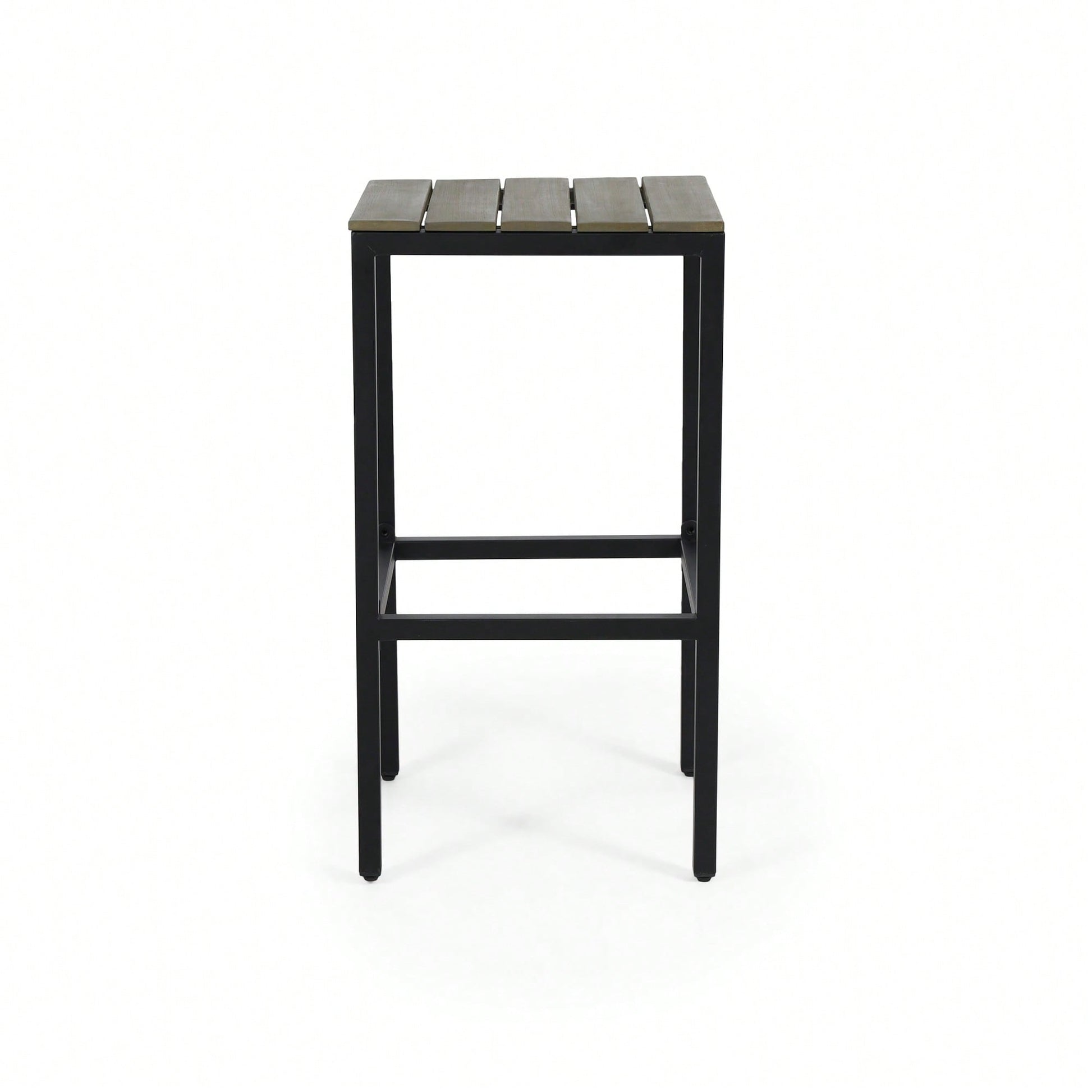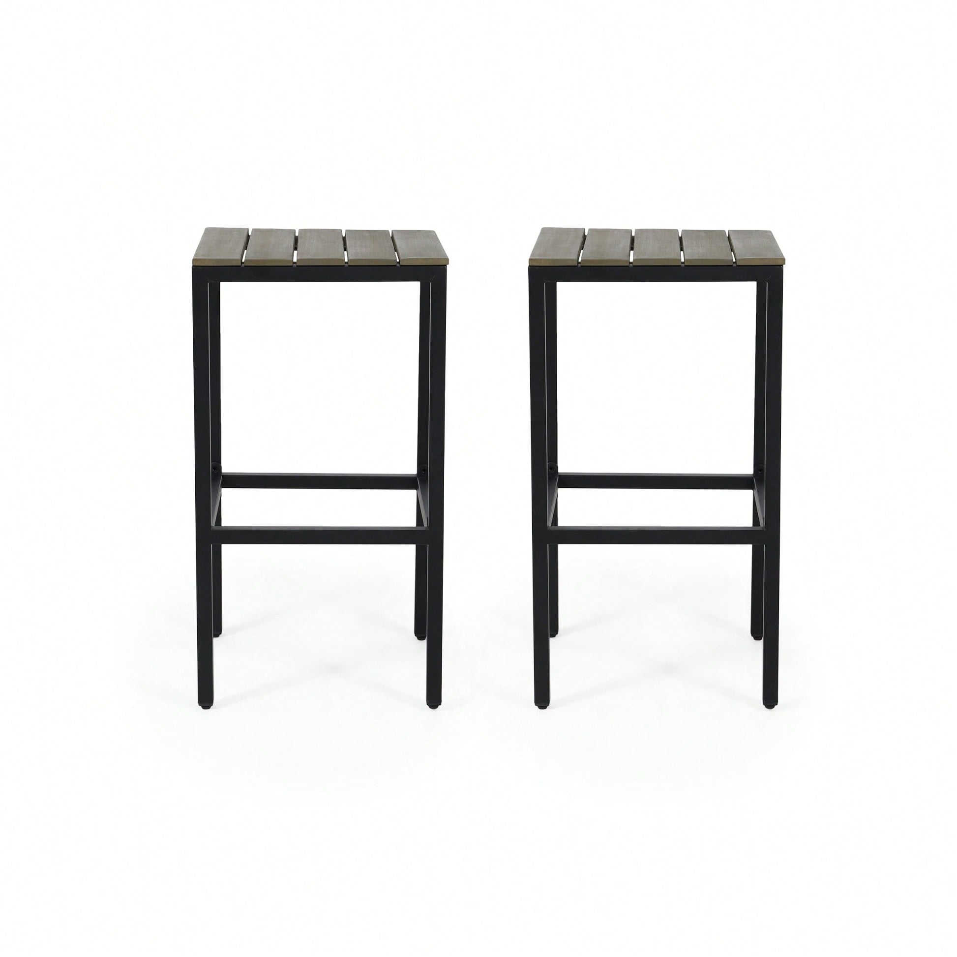 These bar stools feature a modern industrial design, combining a powder-coated frame with sleek wooden slats for a chic aesthetic suitable for any outdoor space. Crafted from durable acacia wood, these stools naturally resist outdoor elements and maintain their color over time. The slat paneling on the top adds a sophisticated touch, while the matte finish of the iron frame enhances the industrial feel. Perfect for transforming your space with style and functionality.
