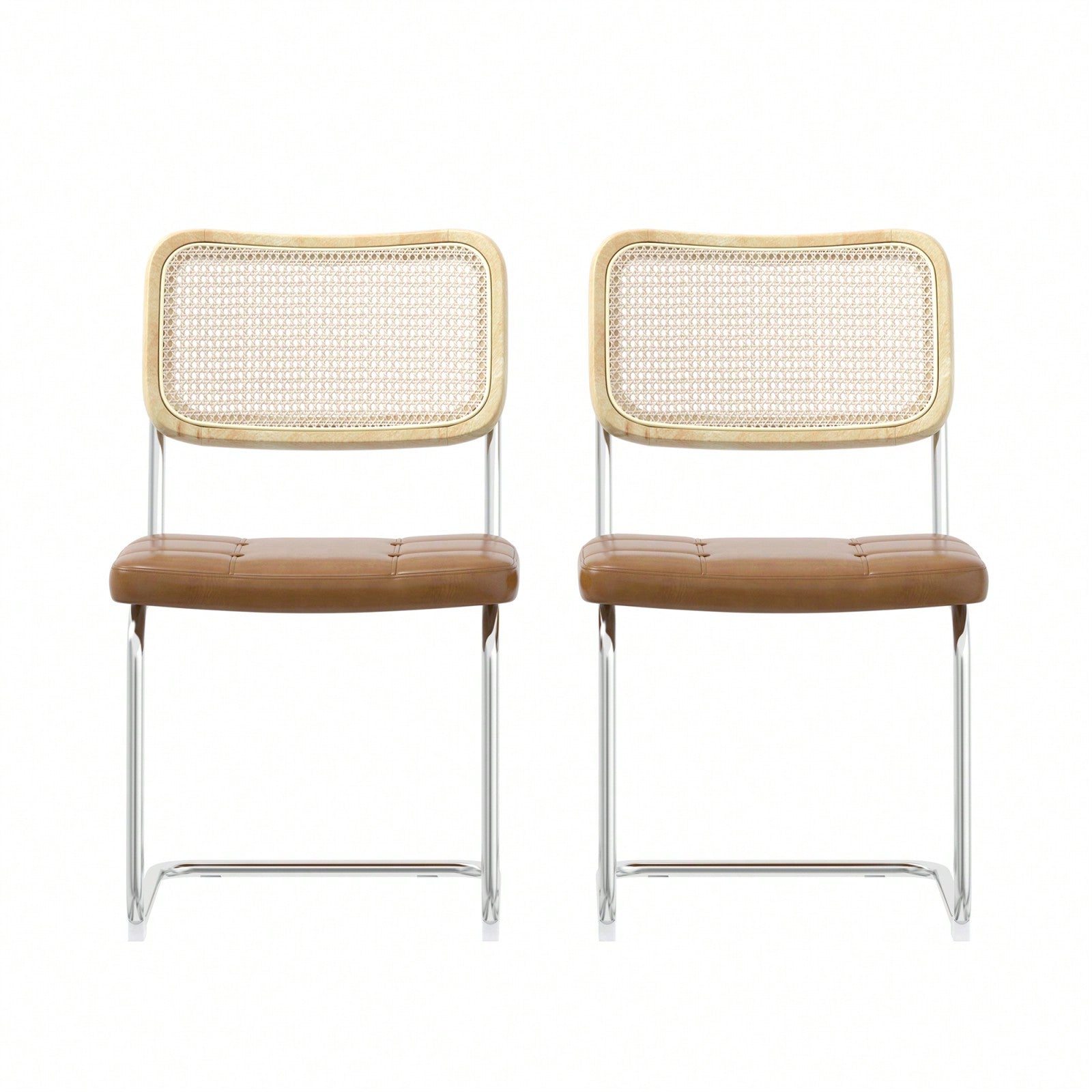 Elevate your dining room, living room, or bedroom with this set of 2 leather dining chairs. The chairs boast a contemporary design with a touch of sophistication, featuring a rattan backrest and brown PU leather cushioned seat. The high-density sponge filling ensures comfort and support during long meals or gatherings. These chairs are built to last with an oak wood frame and electroplated legs for added durability. Easy to assemble with the included tools and manual, these chairs are both stylish and functional additions to any home.