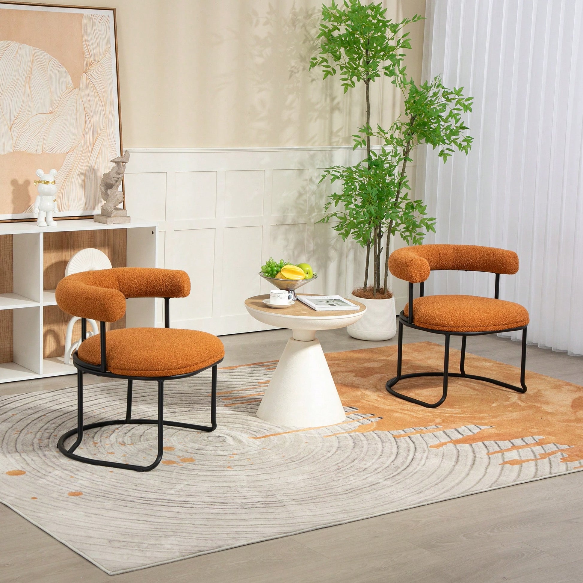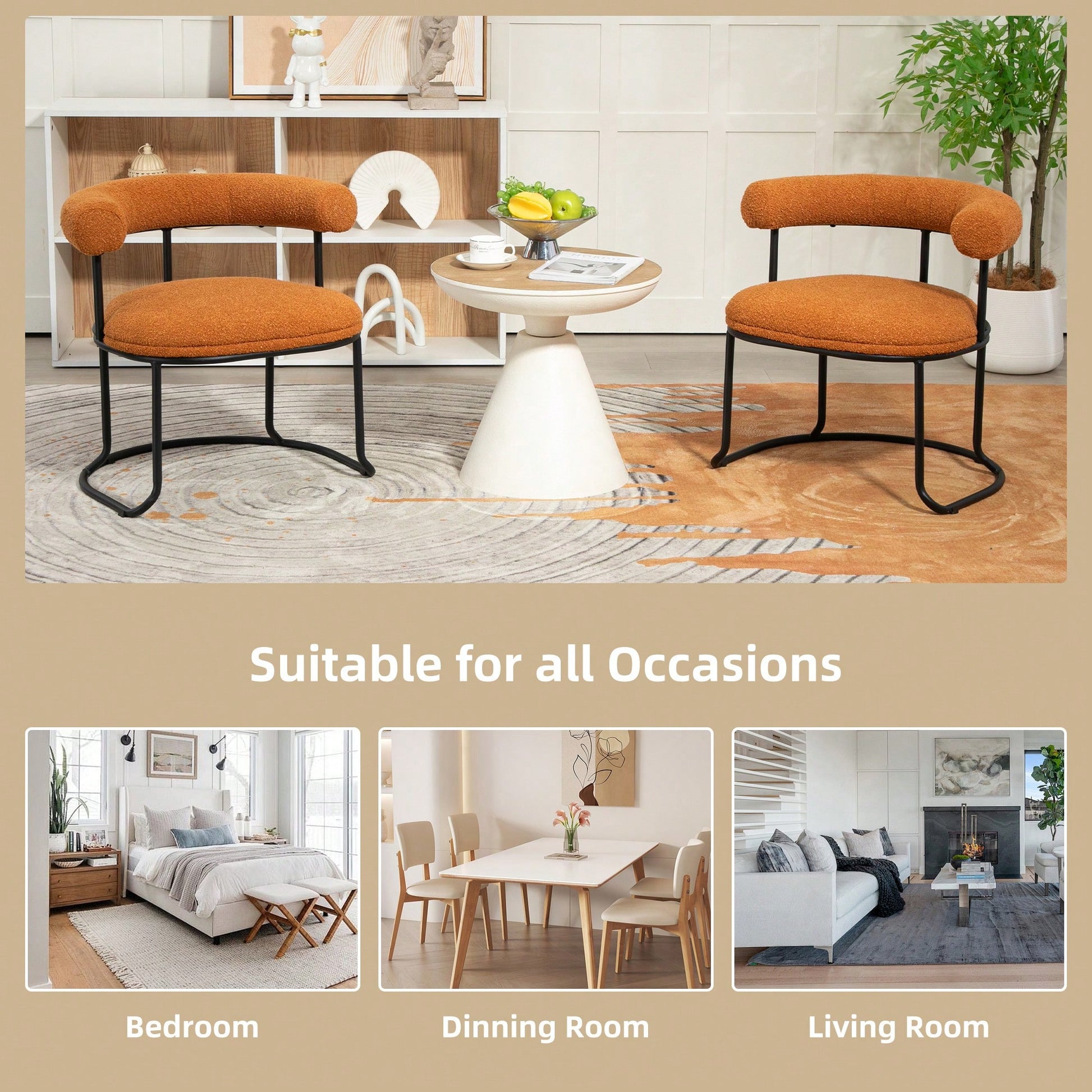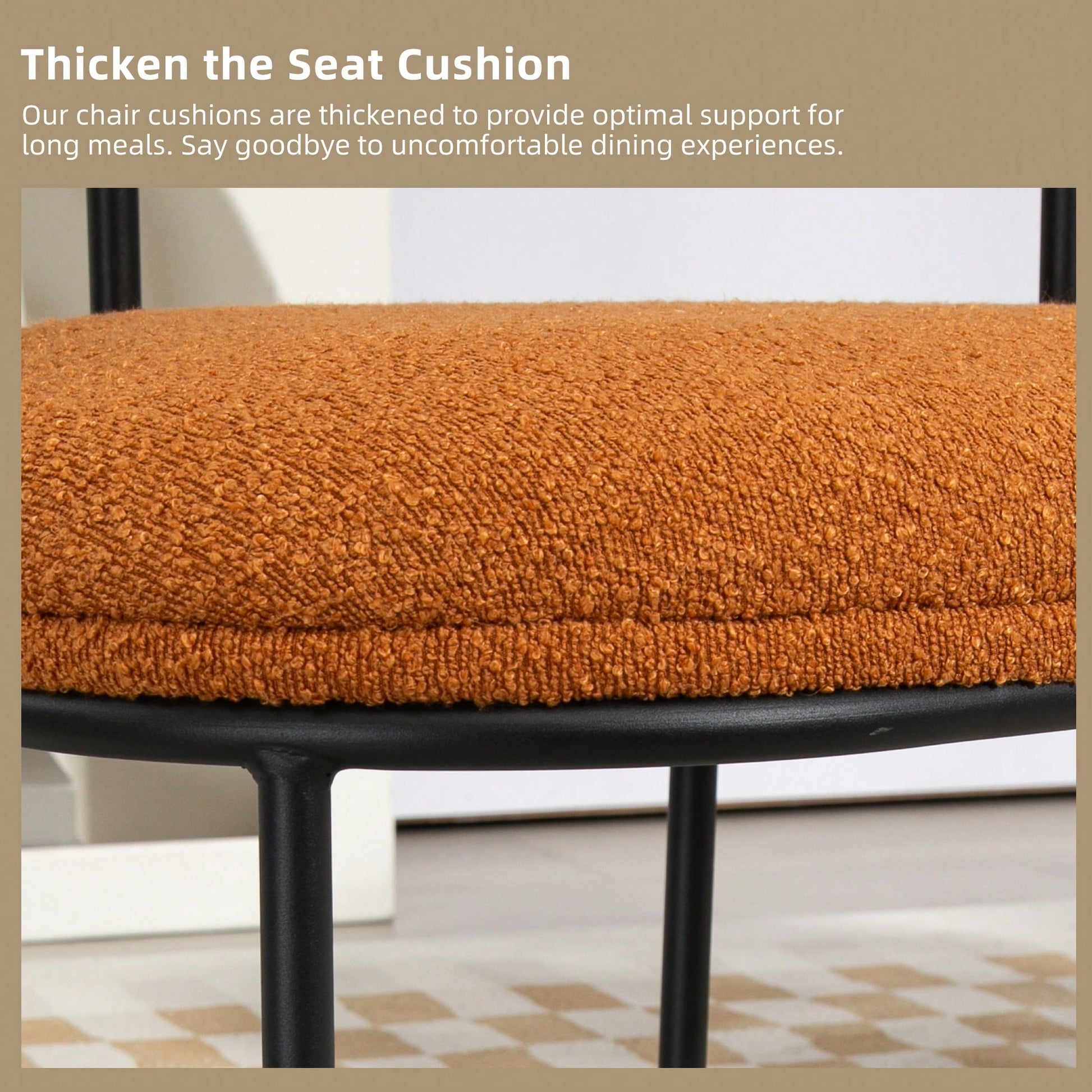 Set Of 2 Mid-Century Modern Curved Back Dining Chairs With Orange Boucle Upholstery, Stylish Round Backrest Kitchen Seating