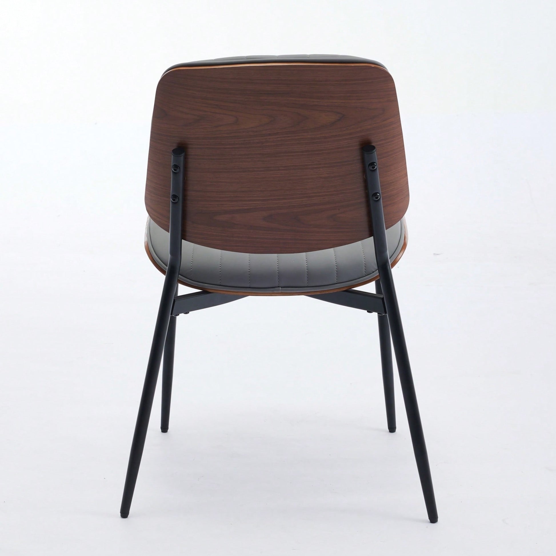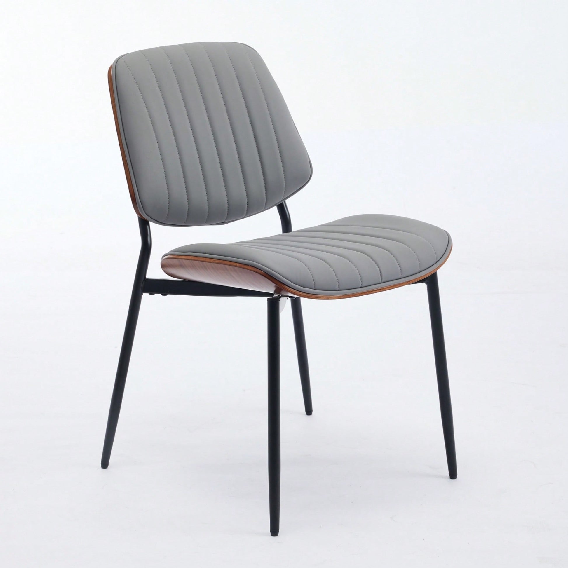 This mid-century modern dining chair set combines style and comfort in an elegant design. The soft backrest features a unique curved wrap and is designed with a scientific leaning angle, promoting an ergonomic seating experience. The walnut backrest and seat plate highlight the natural grain of the wood, adding a touch of classic sophistication to any space. With wider and deeper leg spacing, the chairs provide enhanced stability, making them perfect for dining rooms or offices. The durable construction includes a faux leather upholstery paired with metal tapered legs, ensuring longevity and resilience.