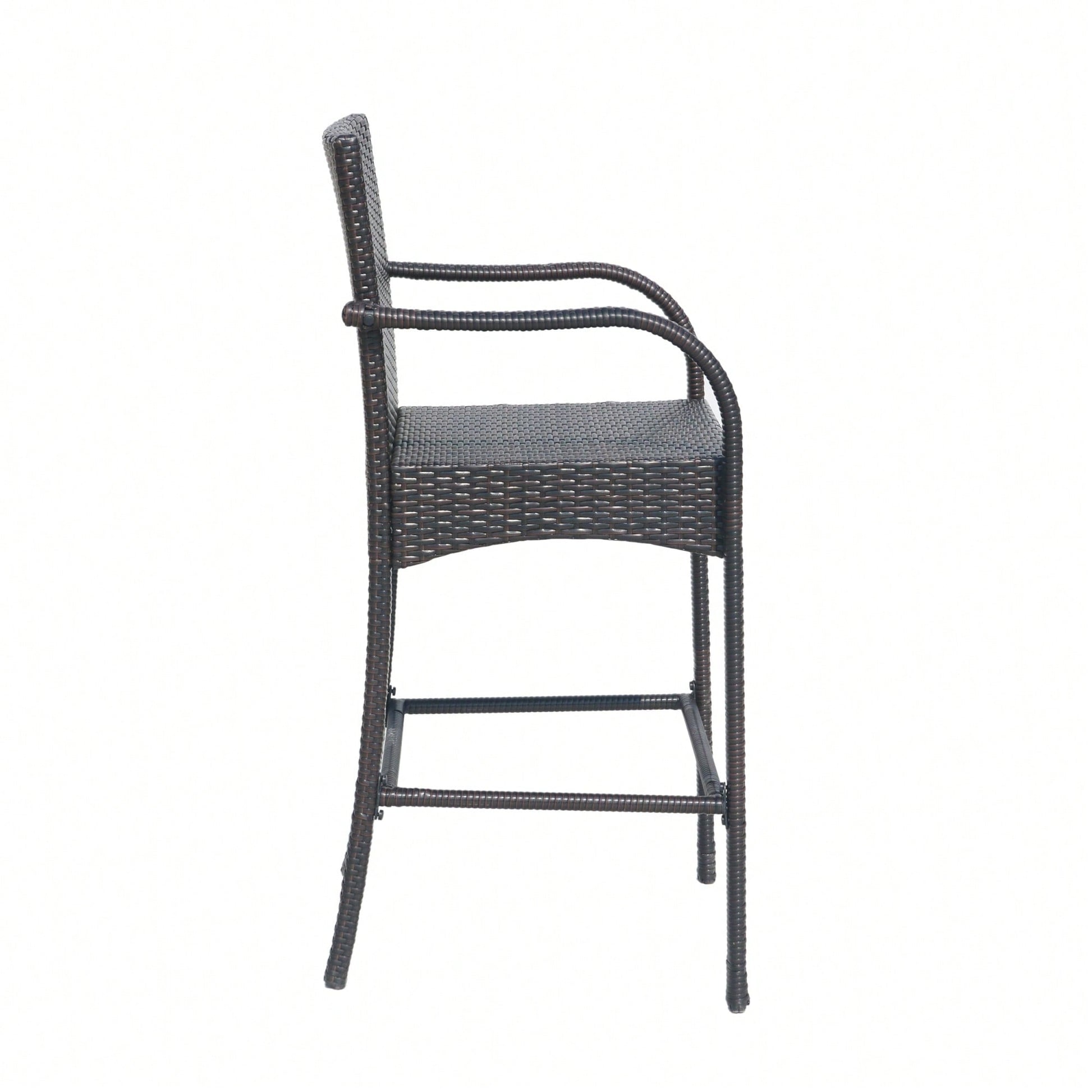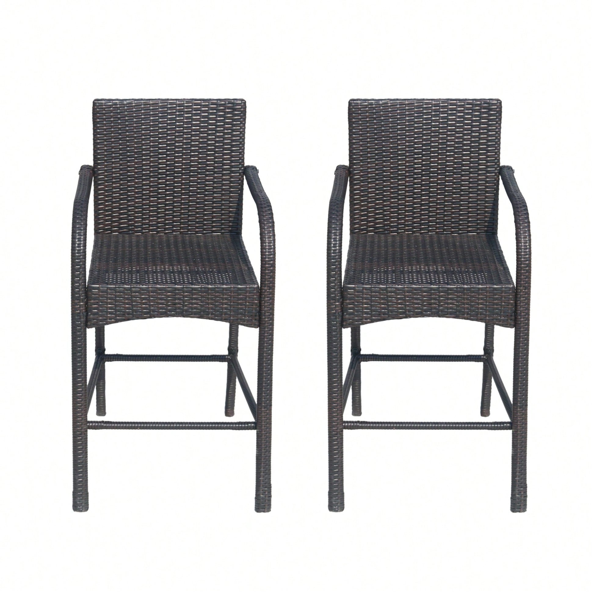 This barstool set features a contemporary design that enhances any outdoor space with its simple yet functional style. The tall armrests and beautiful wicker weave add exceptional design elements while ensuring durability. Made from long-lasting polyethylene rattan, these stools blend seamlessly with various outdoor decors. The sturdy powder-coated metal frame guarantees that the barstools can withstand heavy use, making them ideal for outdoor bars or bistro settings. Assembly is required, and all necessary instructions and tools are included.