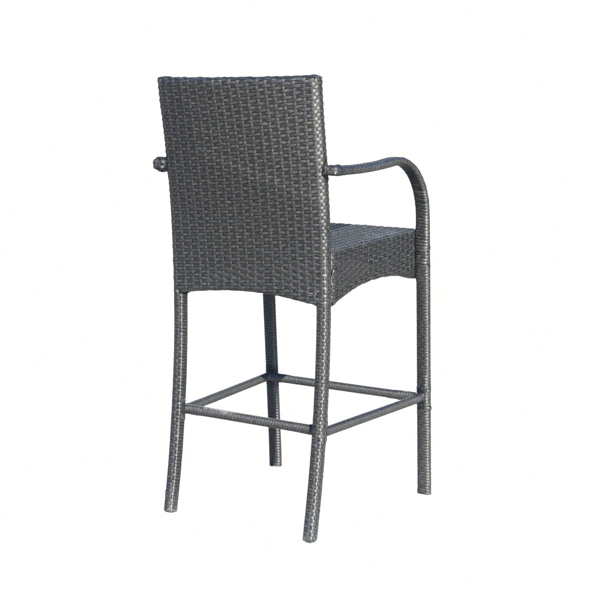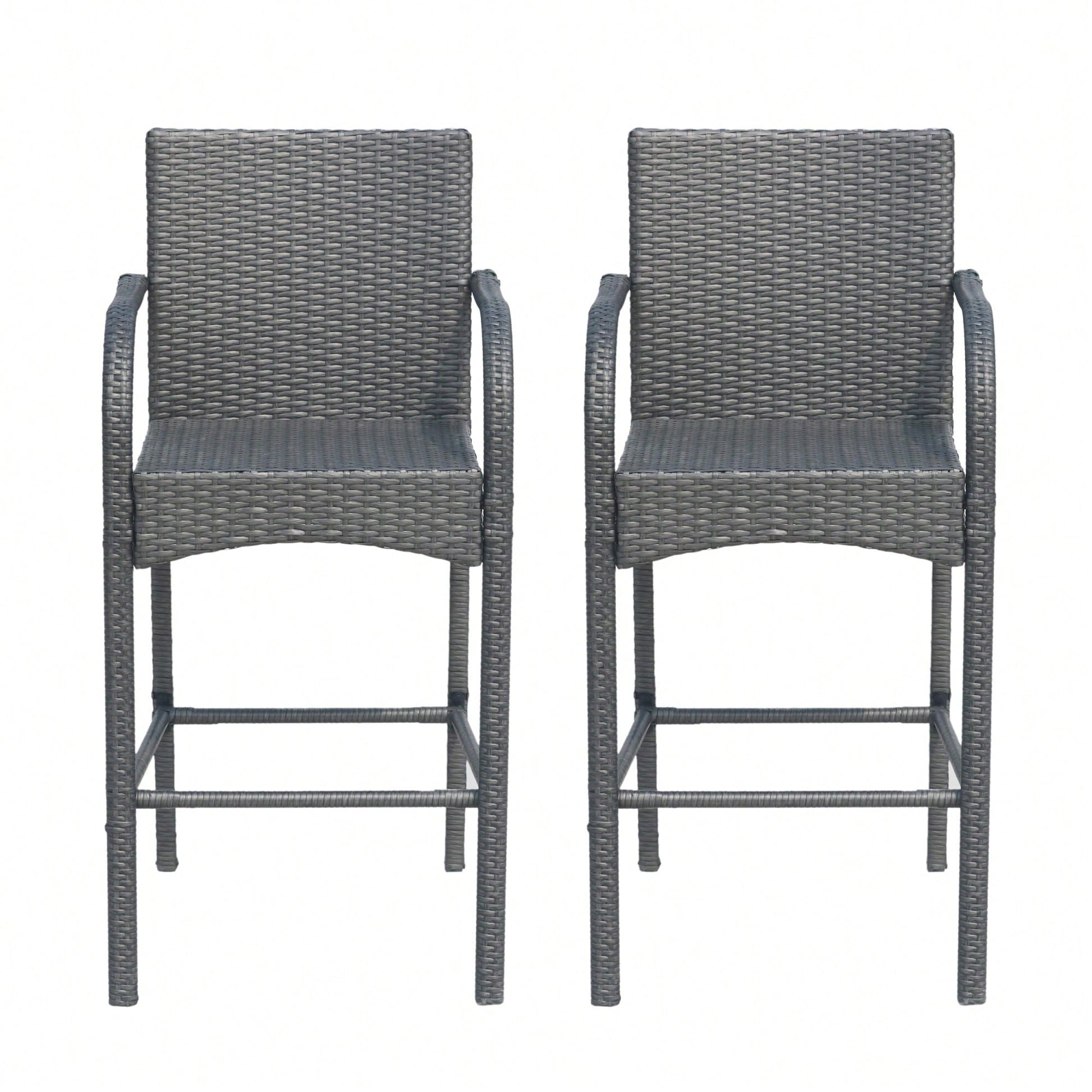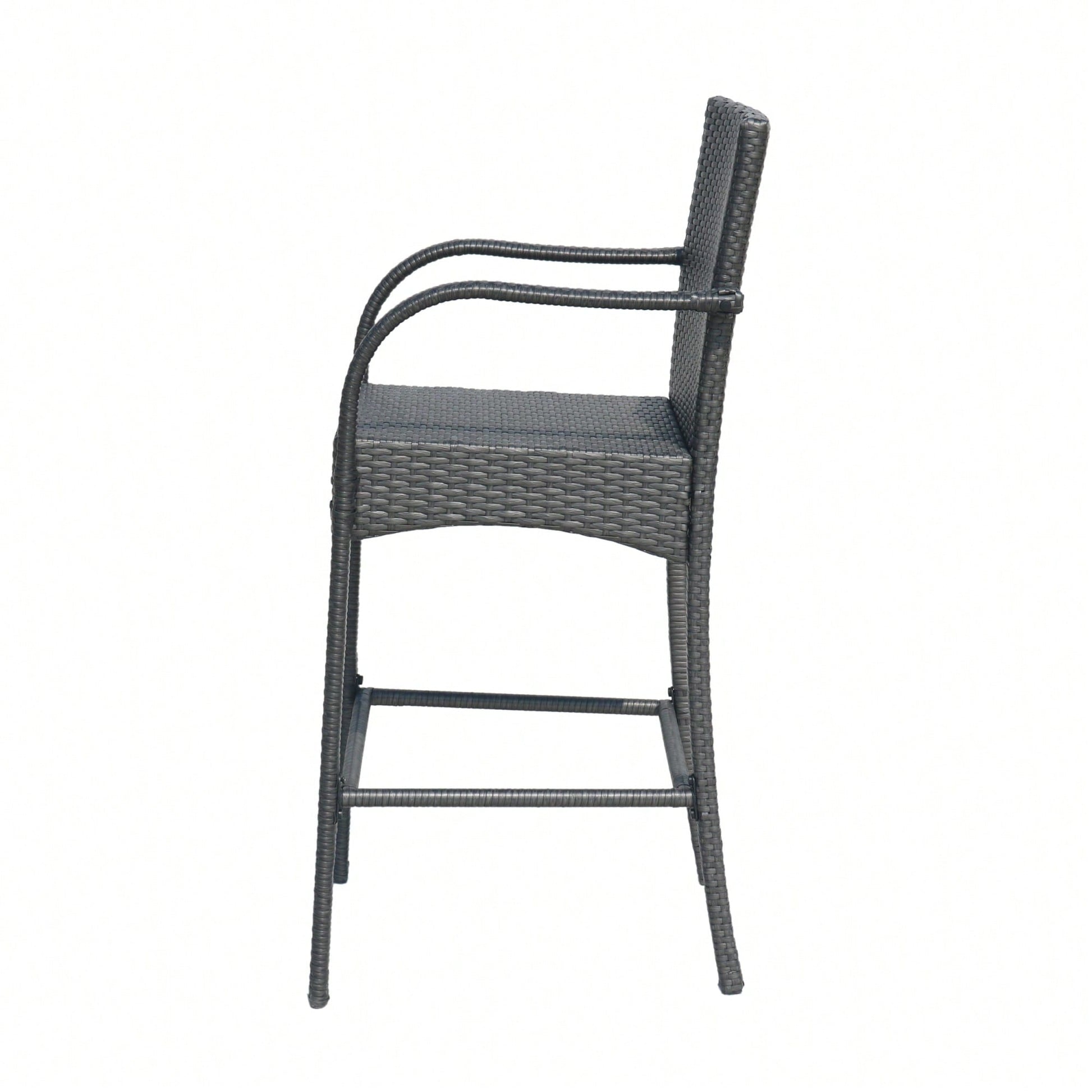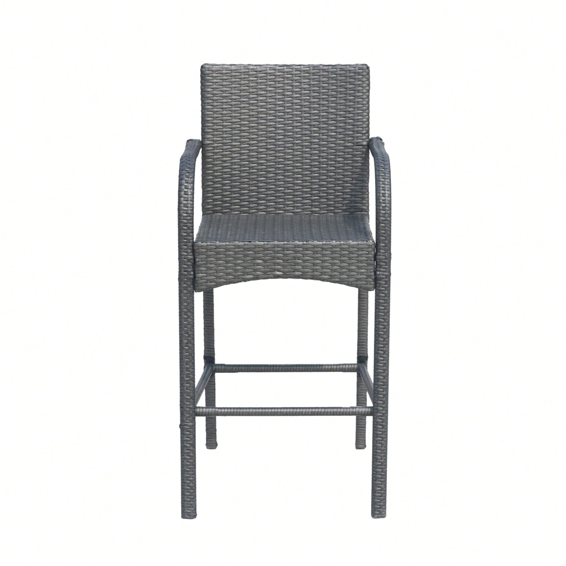 This barstool set features a contemporary design that enhances any outdoor space with its simple yet functional style. The tall armrests and beautiful wicker weave add exceptional design elements while ensuring durability. Made from long-lasting polyethylene rattan, these stools blend seamlessly with various outdoor decors. The sturdy powder-coated metal frame guarantees that the barstools can withstand heavy use, making them ideal for outdoor bars or bistro settings. Assembly is required, and all necessary instructions and tools are included.