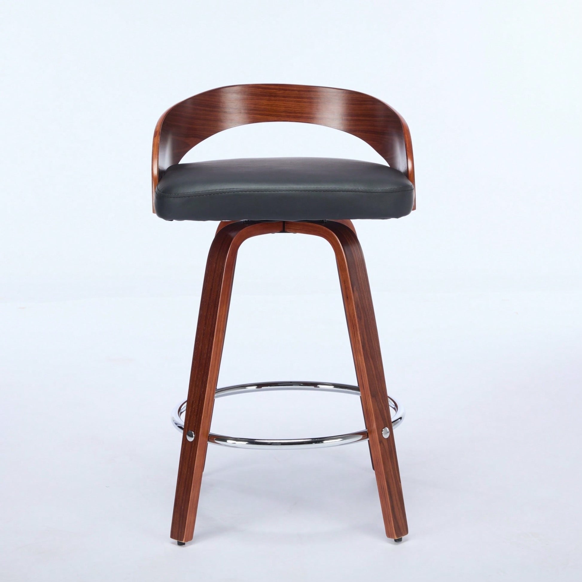 This set of bar stools combines style and comfort with its mid-century modern aesthetic. The wooden back and legs are finished in a rich walnut tone that complements a variety of decors. Equipped with plush faux leather upholstery, these stools not only provide a sophisticated look but are also practical, as they are easy to maintain. The seating features high-density sponge cushioning, measuring 2.6 inches thick, ensuring a pleasant seating experience. With the added benefit of a 360-degree swivel seat, users can enjoy increased mobility, making these stools perfect for social gatherings or casual dining. The wide, sloping feet design offers excellent stability, while adjustable plastic pads at the base protect your floors from scratches and ensure a balanced stance.