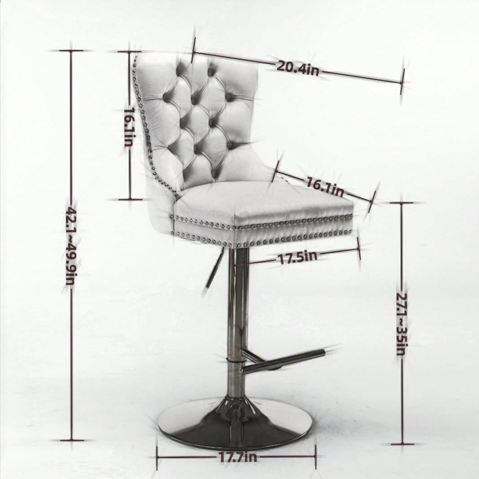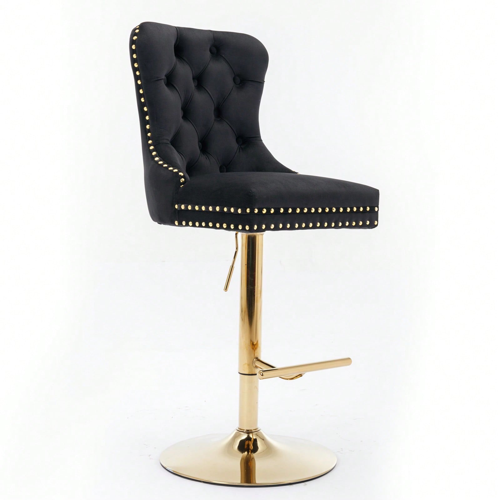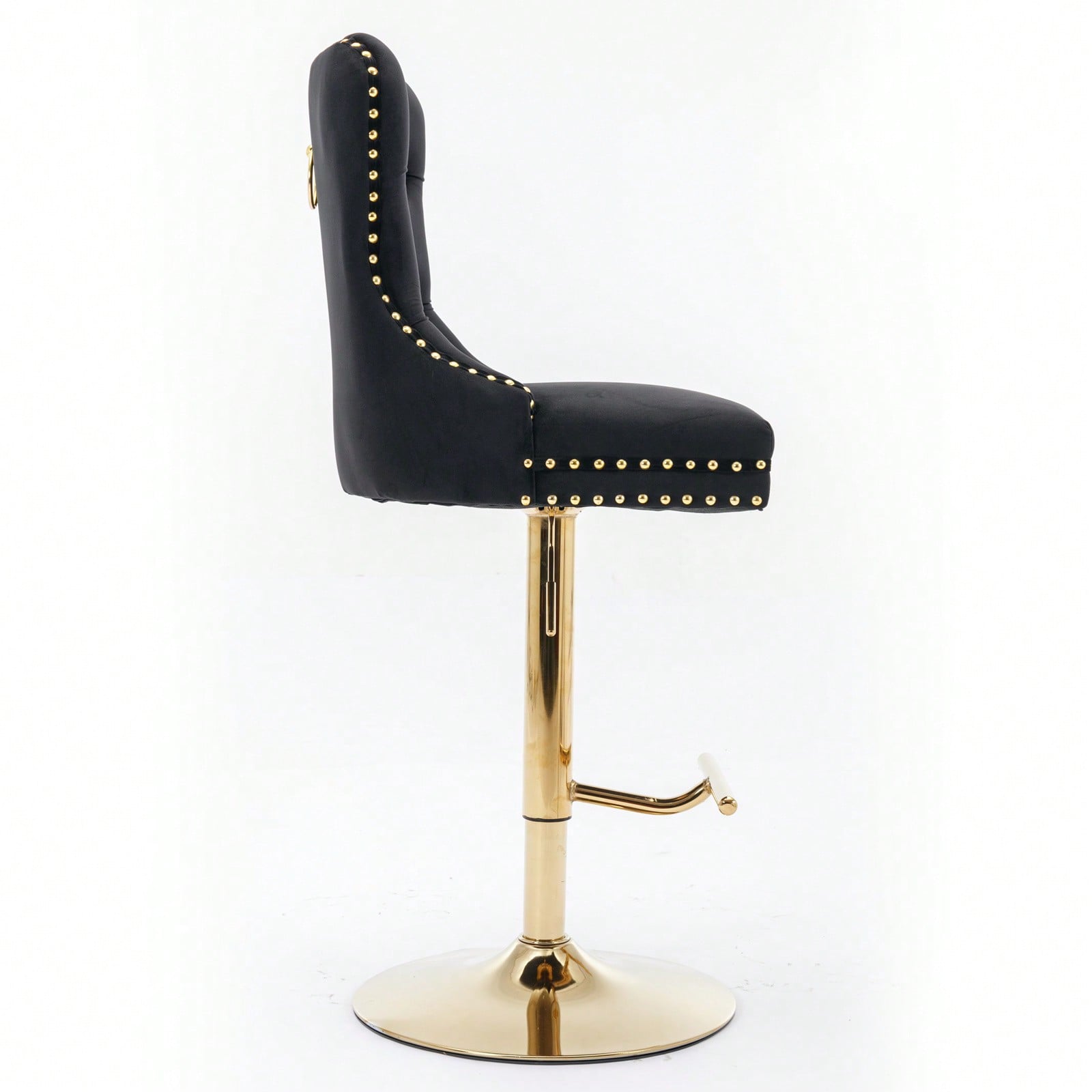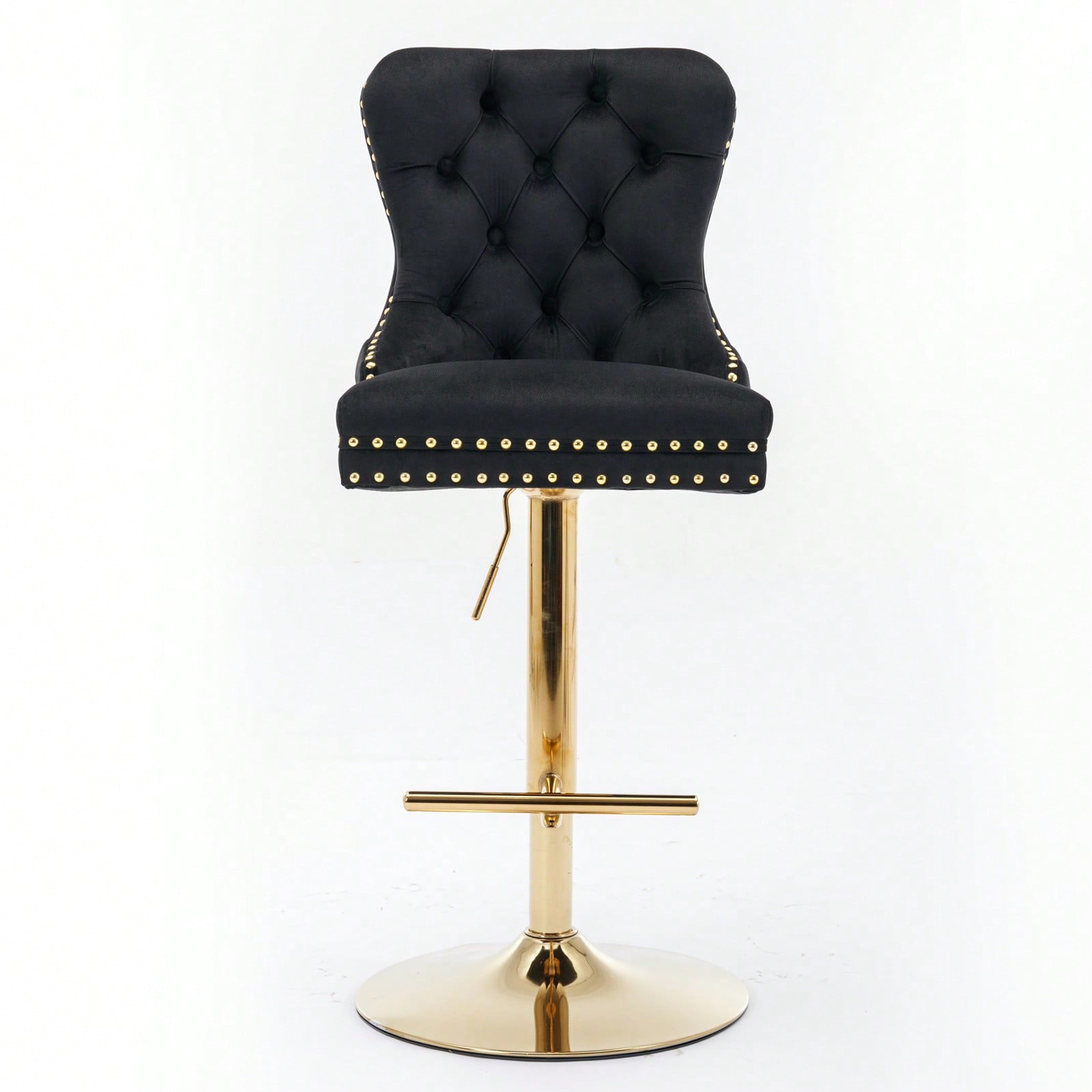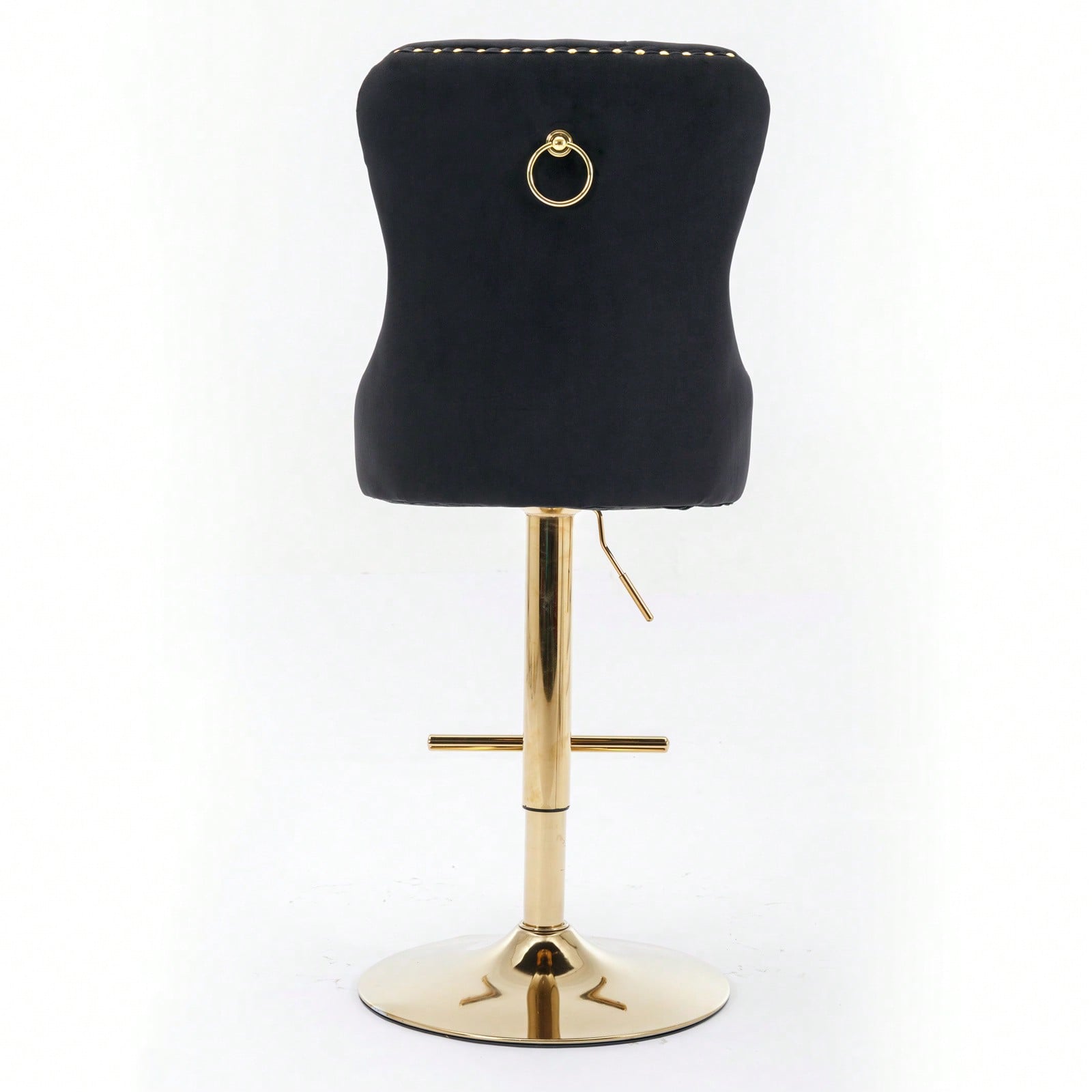 This set of two bar stools brings a touch of modern elegance to any kitchen or bar area. Upholstered in luxurious velvet, the stools feature a tufted design and a curved back for optimal comfort. The golden swivel base adds a touch of glamour and allows for easy maneuverability, while the adjustable height ensures a perfect fit for any counter height. These stools are ideal for enjoying casual meals, entertaining guests, or simply relaxing with a drink.