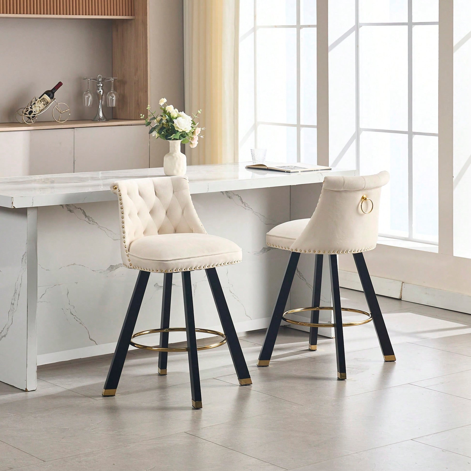 Set Of 2 Velvet Bar Chairs With 360 Degree Rotation And Detachable Back Pull Loop, Square Foot Wooden Base And Rivet Decoration