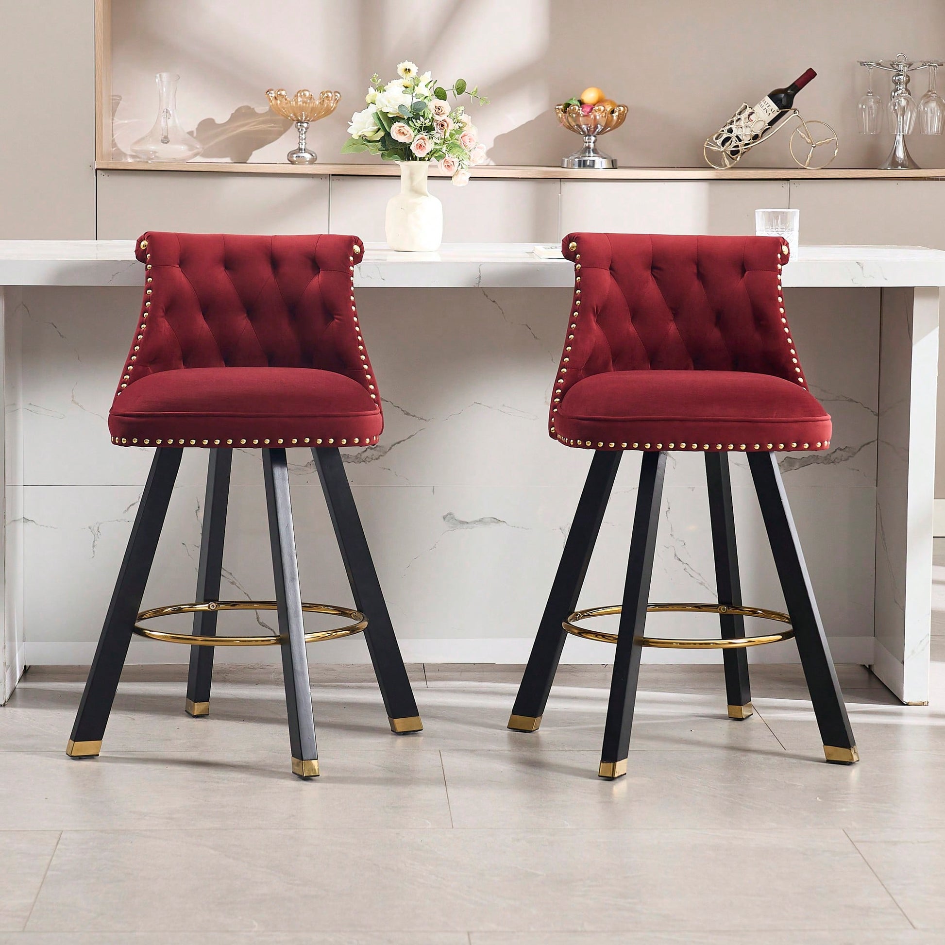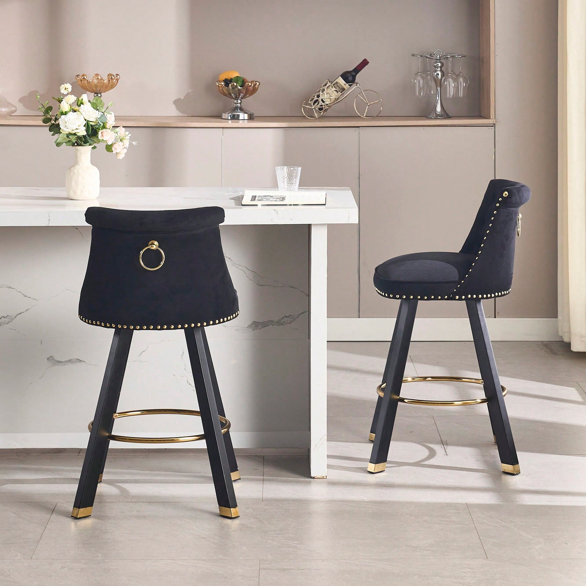 These square foot wooden bar chairs feature a unique and simple design that blends fashion with functionality. Crafted from high-quality wood, they offer a natural texture that enhances their appeal while ensuring durability for long-term use. The backrest pull point design adds an elegant touch, showcasing exquisite craftsmanship that elevates the overall aesthetic. The swan suede velvet fabric provides a super soft, breathable surface that ensures comfort during extended sitting. With the ability to rotate 360 degrees, these chairs allow for easy movement and adaptability to various settings. The stylish back pull ring design enhances practicality, making them easy to reposition. The rivet decoration contributes a vintage flair, making these chairs a delightful addition to any space.