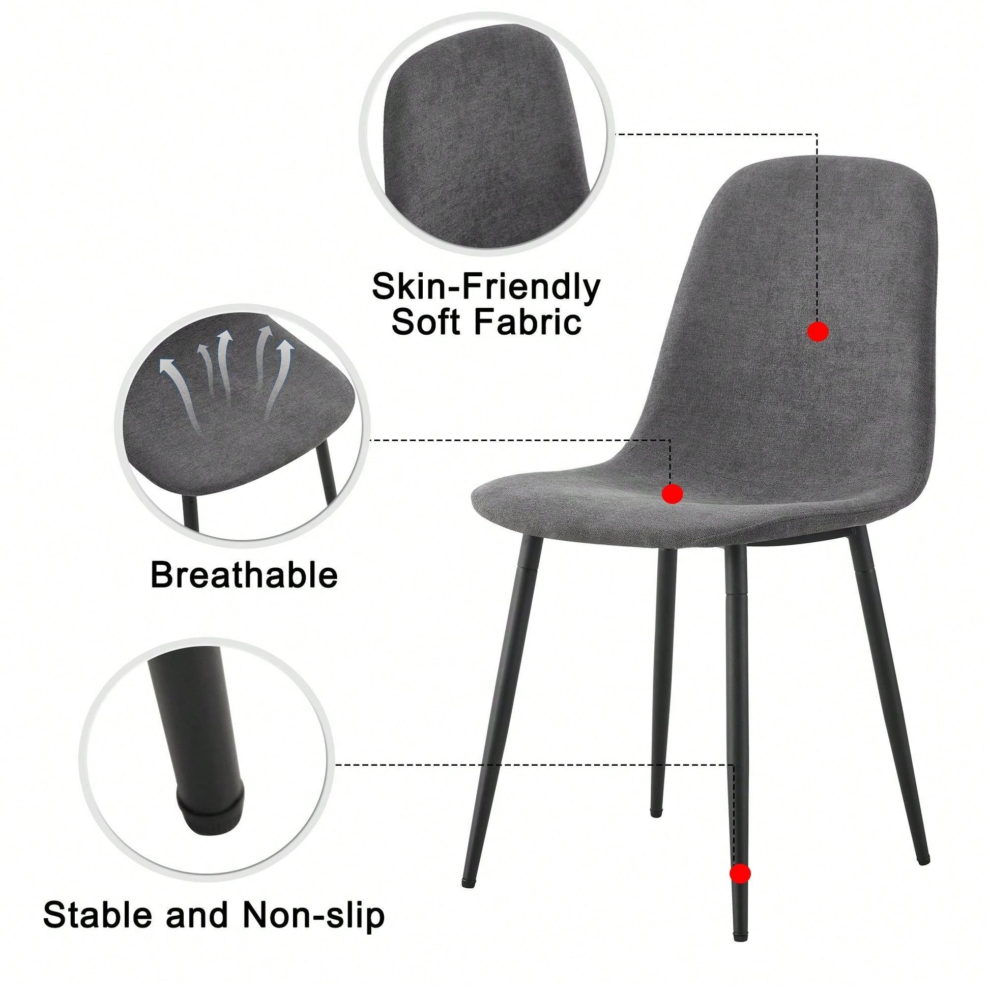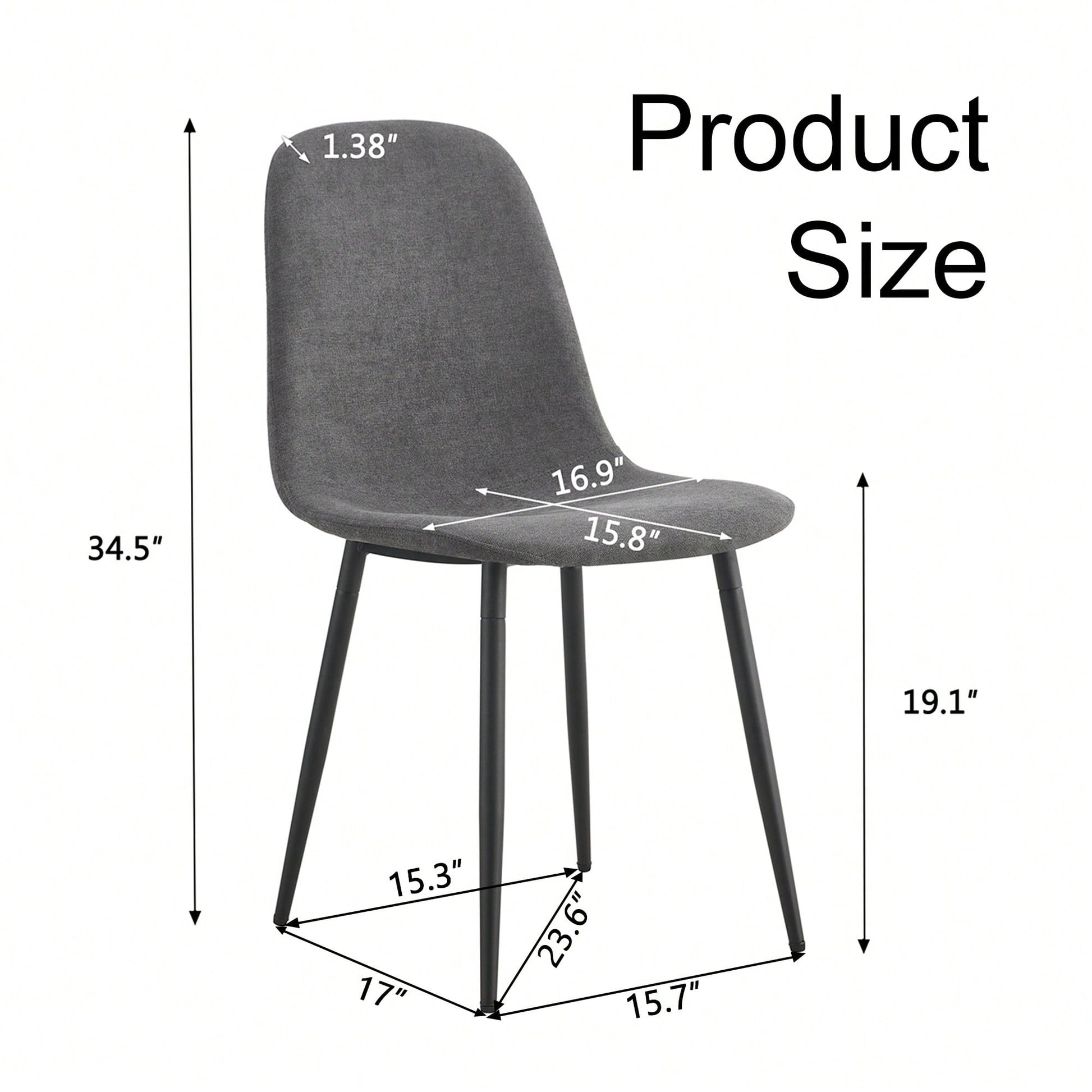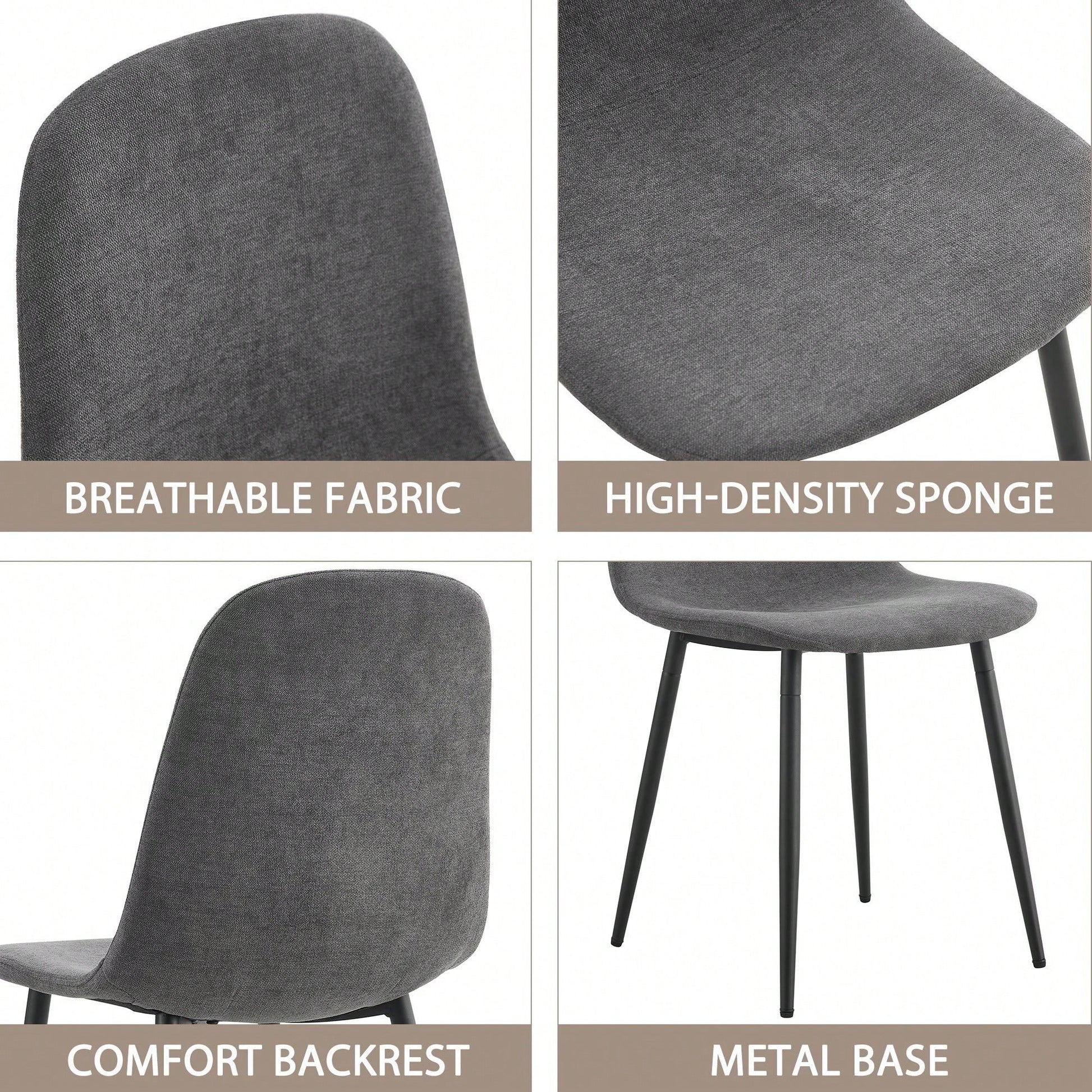 1. Key Features - Set of 4 modern dining chairs with mid-century style - Upholstered in soft light gray linen-cotton fabric for comfort - Durable black metal legs with adjustable anti-slip feet - Ergonomic rounded backrest design for extended use - Easy to clean and maintain, ensuring longevity 2. Product Description These dining chairs feature a sleek and modern design, perfect for enhancing your kitchen or dining room. Upholstered in soft linen-cotton fabric, they offer a breathable and comfortable seating experience. The rounded backrest and integrated seat design provide excellent support, making them ideal for long meals or gatherings. Sturdy black metal legs add a stylish contrast and ensure durability, while adjustable anti-slip feet protect your floors and enhance stability. With easy assembly instructions included, these chairs can be set up in just 15-20 minutes, bringing elegance and comfort to your home. Specifications - Material: Linen-cotton - Leg material: Black metal - Assembly time: 15-20 minutes - Color: Light gray with dark gray texture options - Design: Integrated seat and backrest, ergonomic rounded backrest