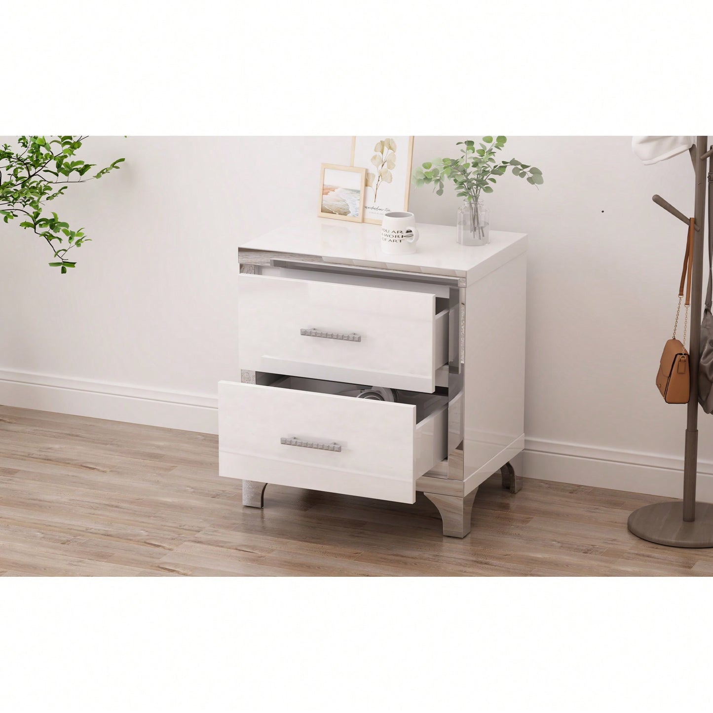 **Key Features** - Sturdy construction with MDF and metal handles and feet for durability - Two spacious drawers for ample bedside storage - Elegant high gloss finish adds a sophisticated touch to your space - Easy assembly with included hardware and clear instructions - Dimensions: 22.4" L x 15.7" W x 23.6" H **Product Description** This elegant high gloss nightstand combines style and functionality, making it an ideal addition to any bedroom or living room. Constructed from sturdy MDF with metal handles and feet, this bedside table ensures long-lasting reliability. The two drawers provide ample storage for books, eyeglasses, and personal items, keeping your space organized and clutter-free. Its high gloss surface creates a unique sense of space and elegance, enhancing the overall aesthetic of your room. Assembly is straightforward, with all necessary hardware included and clear instructions provided. **Specifications** - Overall Product Dimension: 22.4" x 15.7" x 23.6" (L x W x H) - Number of Packages: 1 - Assembly Required: Yes