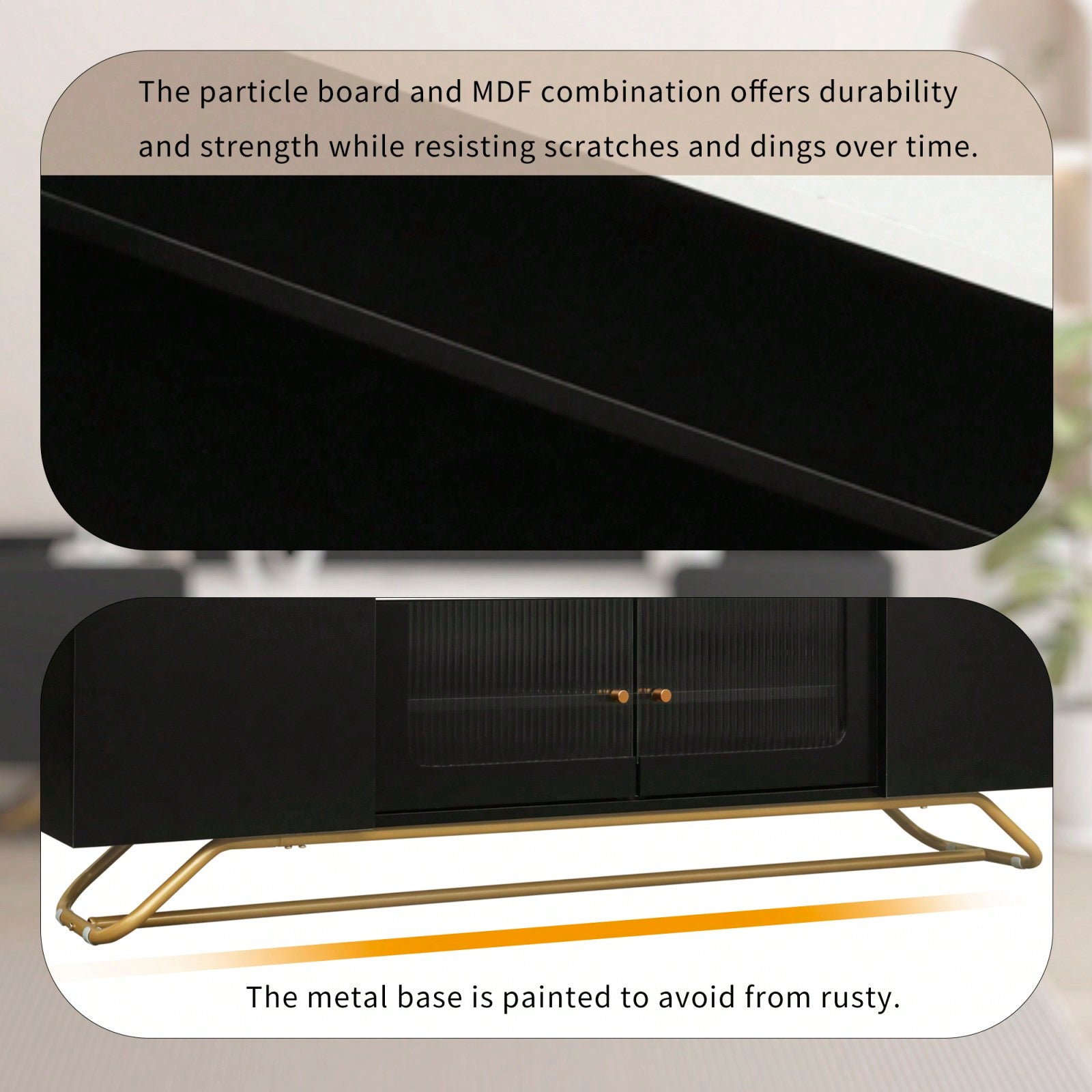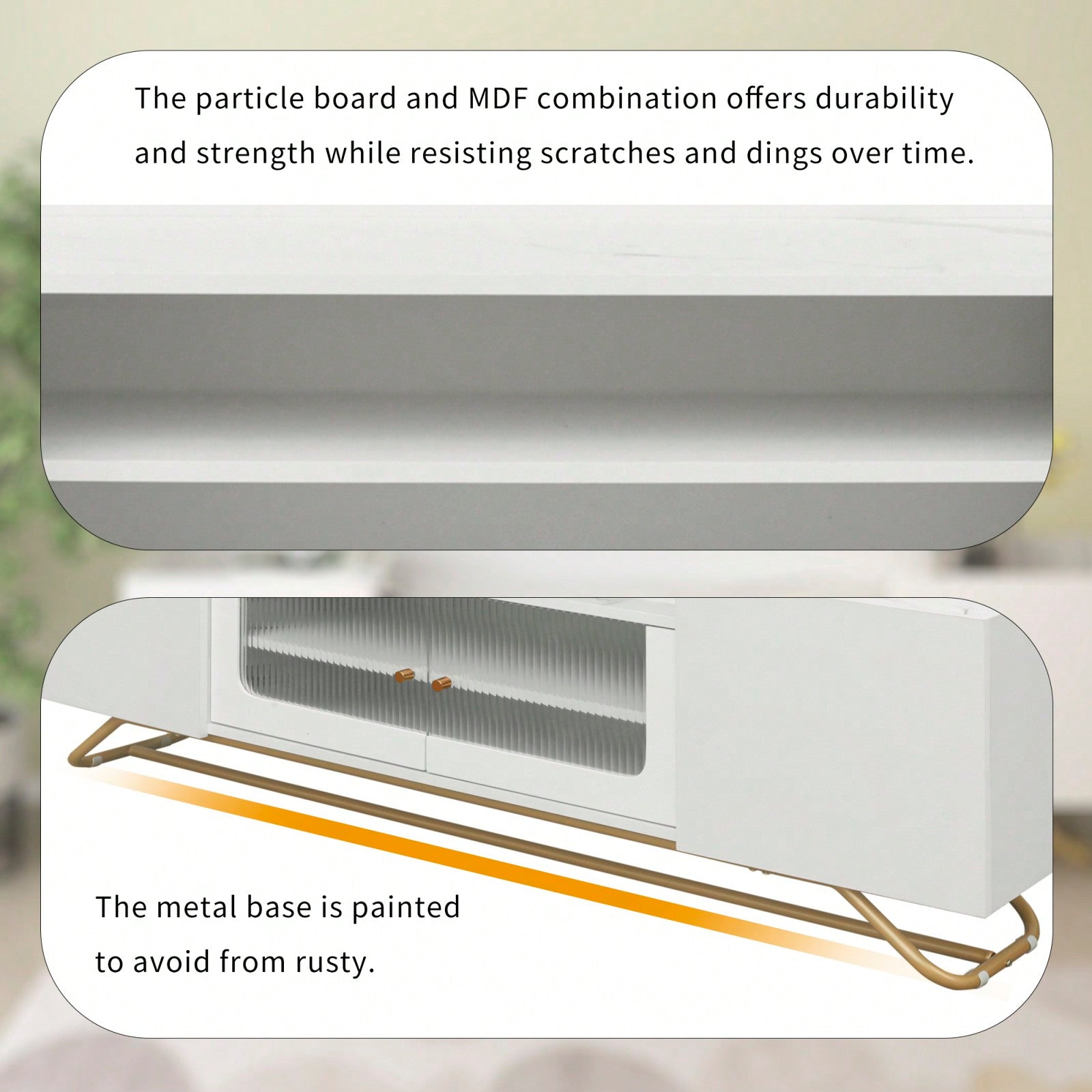 This sleek and stylish TV stand features a luxurious faux marble table top and a gold metal frame base, adding an elegant touch to your living room decor. The standout feature of this stand is the central cabinet with fluted glass doors, providing a unique visual appeal and an element of privacy. The spacious cabinets offer ample storage space for audio/visual components and other home essentials, allowing for easy organization. The durable particle board and MDF construction ensures long-lasting strength and resistance to scratches.