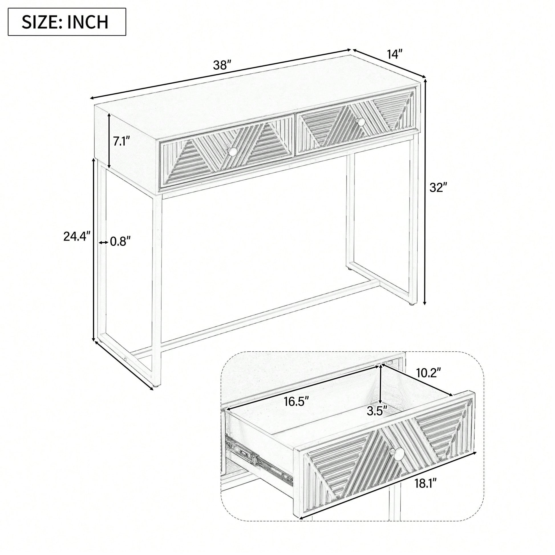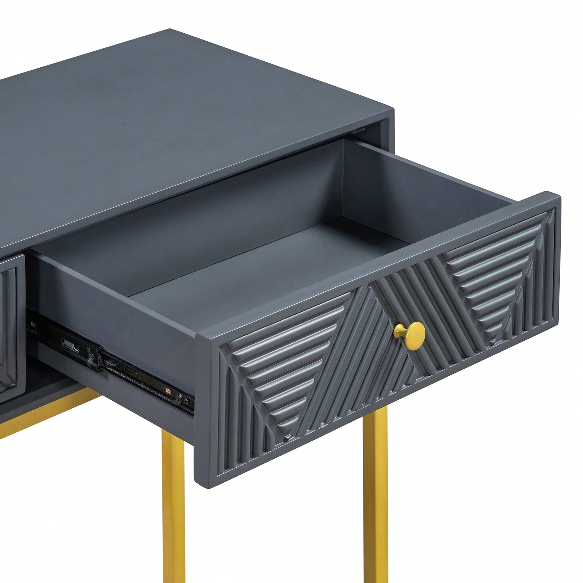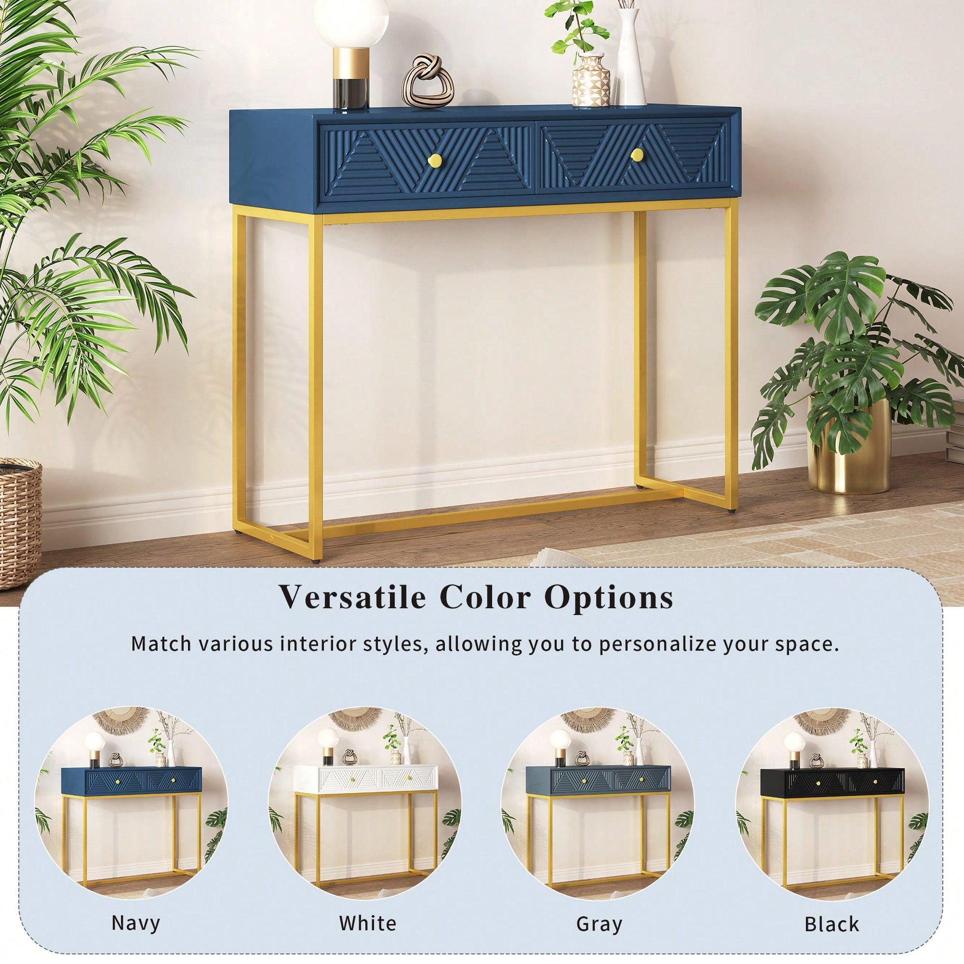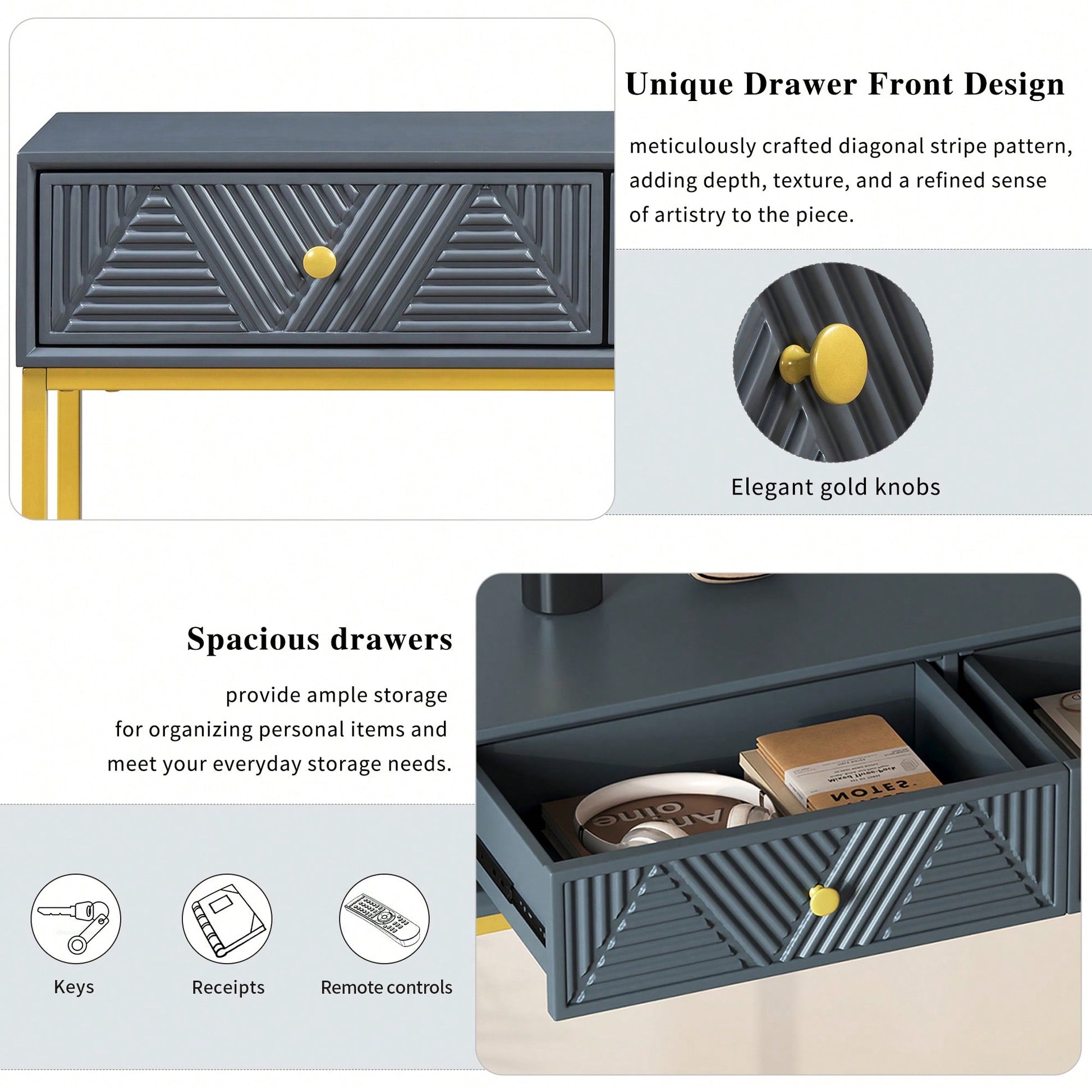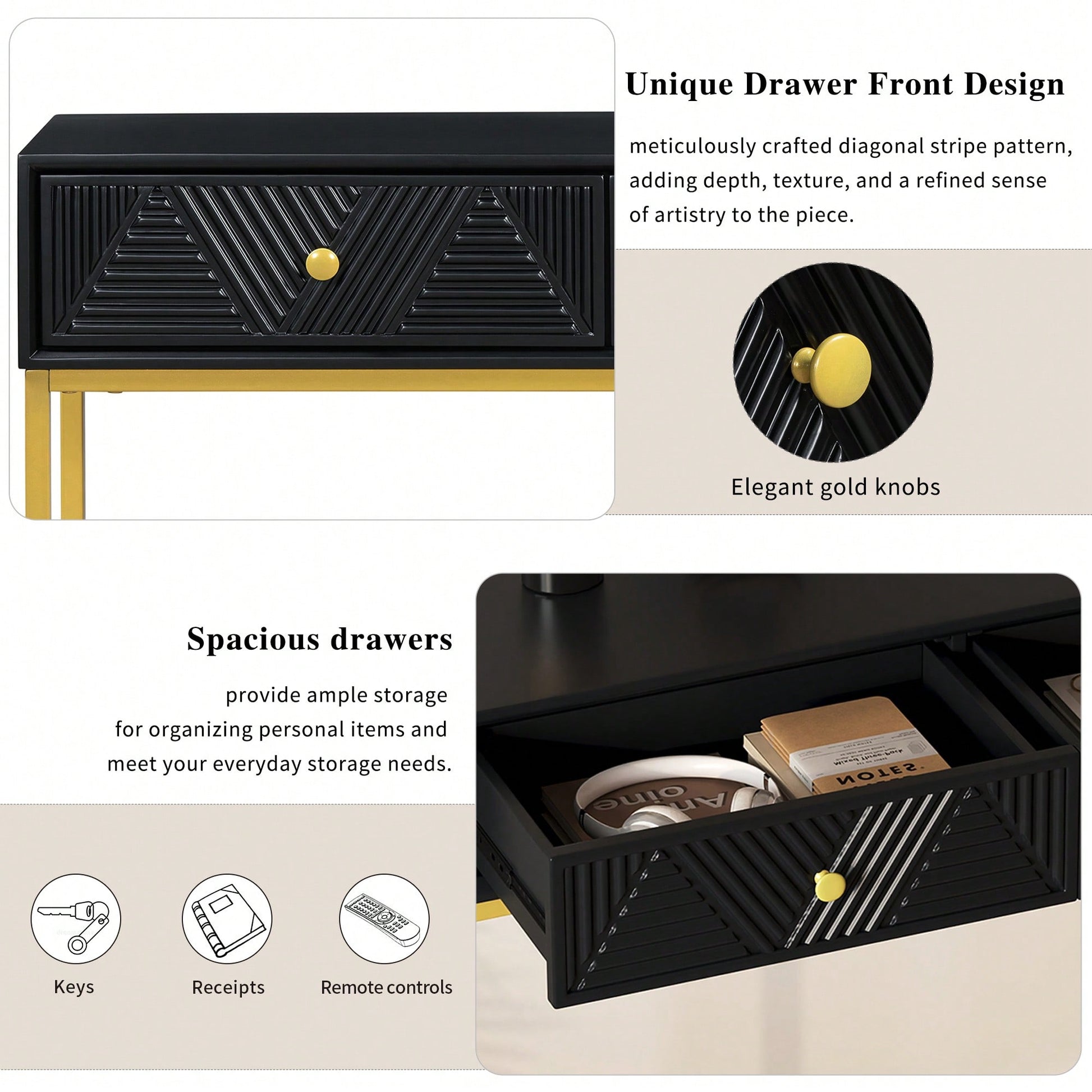 This sleek console table combines contemporary elegance with functionality, making it a perfect addition to any living room, dining area, or entryway. The minimalist design features a polished black tabletop that contrasts beautifully with the bold gold metal base, creating an eye-catching focal point. Crafted from high-quality MDF, the table is built for durability and long-lasting use. The two spacious drawers, adorned with a meticulously crafted diagonal stripe pattern and elegant gold knobs, provide ample storage while adding a refined sense of artistry. With adjustable foot pads, this console table ensures stability on uneven surfaces and is available in four elegant colors to complement various interior styles.