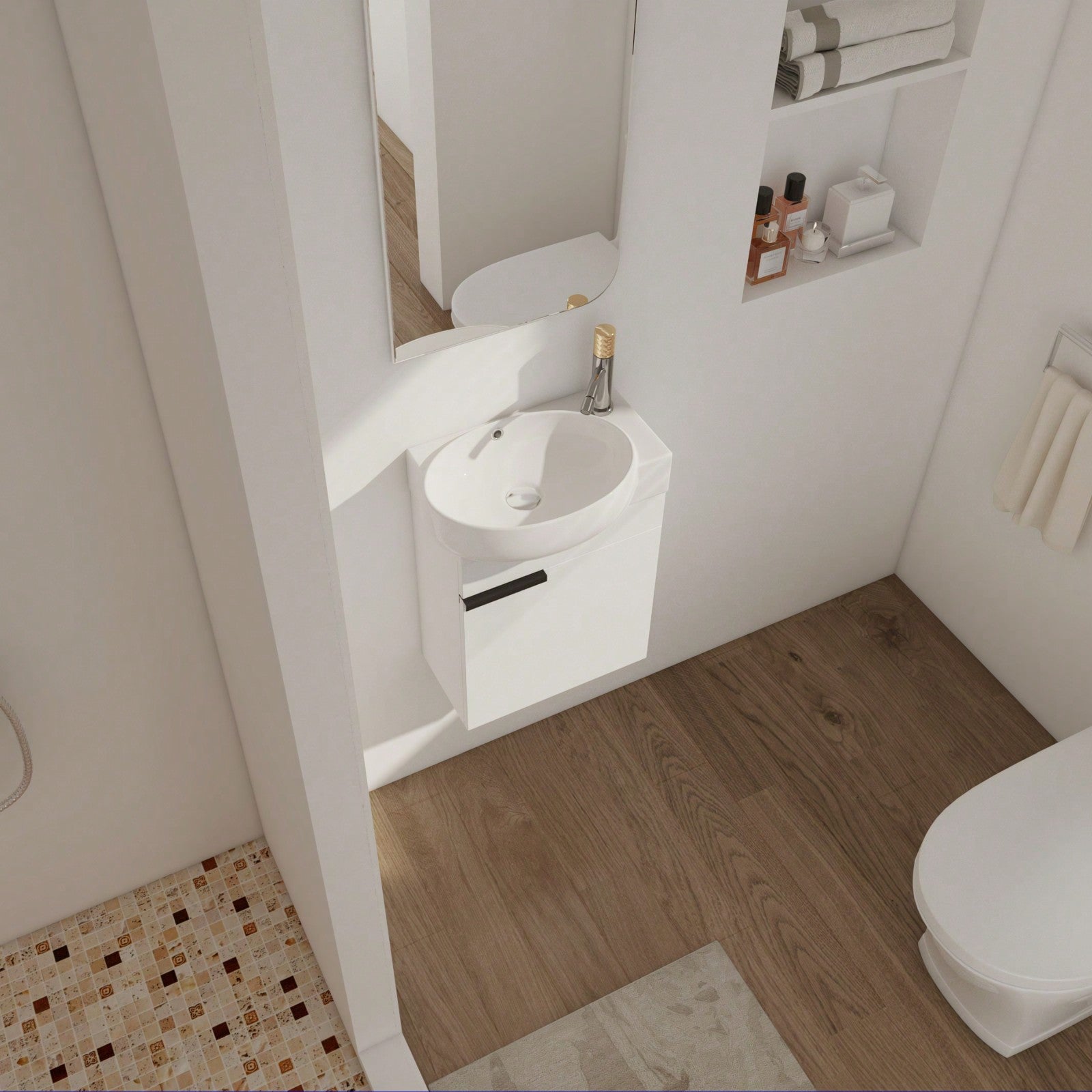 1.Maximize Small Bathroom Space: This compact, wall-mounted bathroom vanity with sink (16 inches) is perfect for small bathrooms and powder rooms, offering both style and functionality without sacrificing valuable floor space.