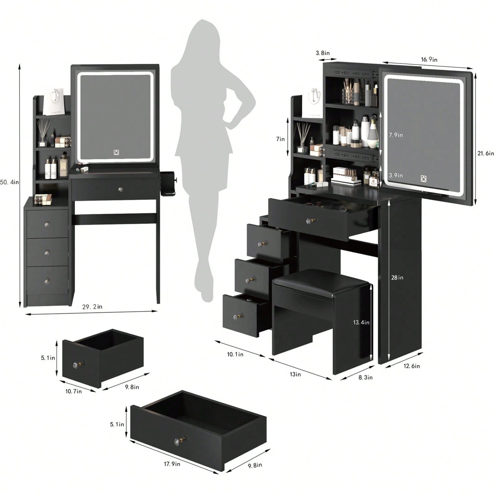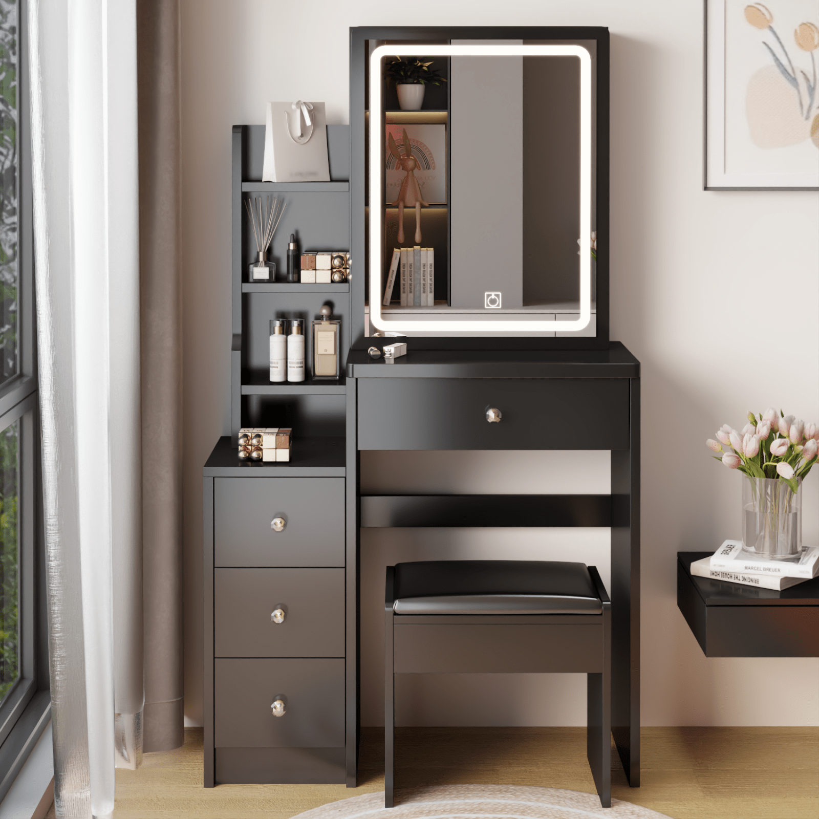 Compact Vanity Table with Cushioned Stool and LED Touch Control Mirror Tri-Color Brightness Adjustable