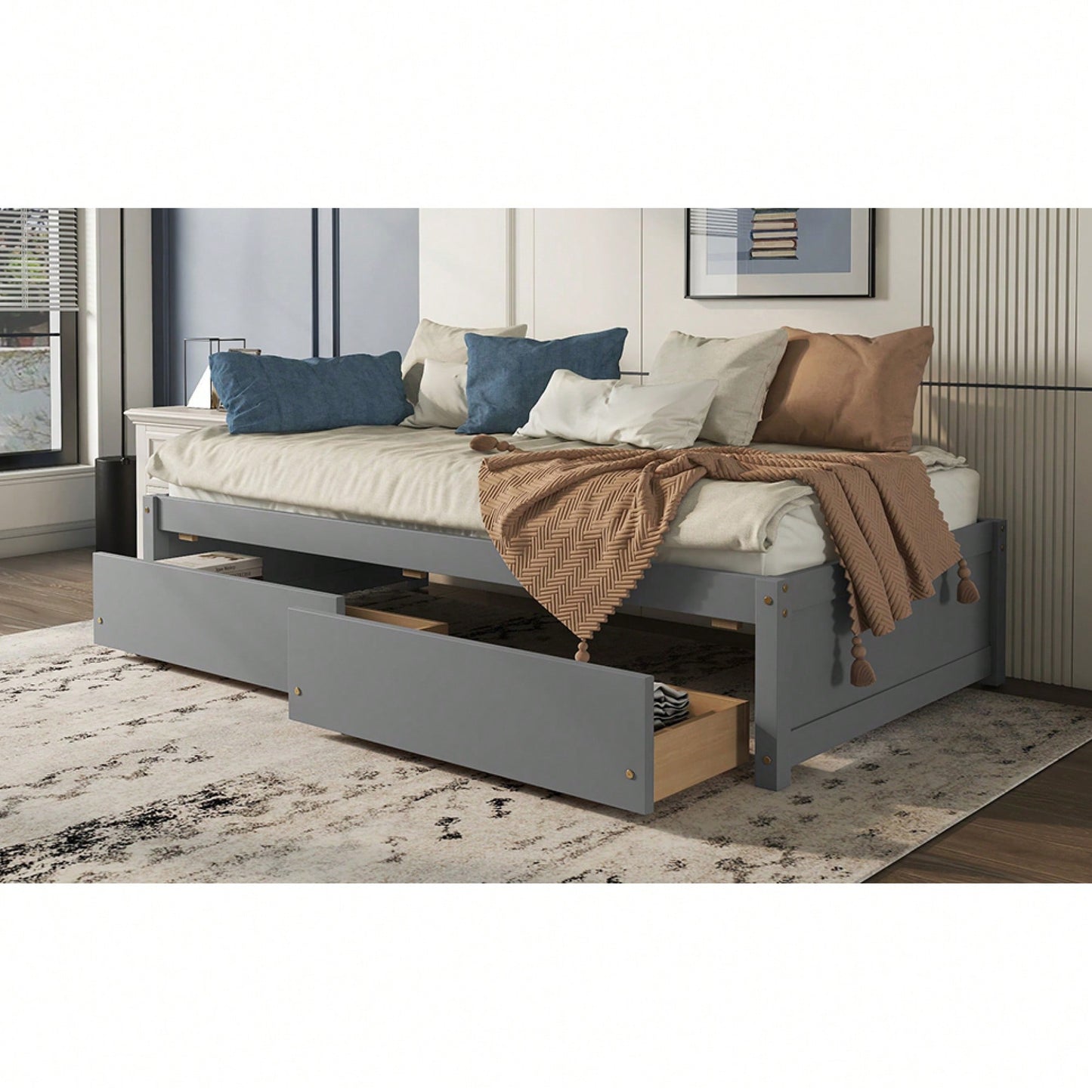Queen Size Bed Frame with Storage Headboard Charging Station and Drawers Easy Assembly No Box Spring Needed