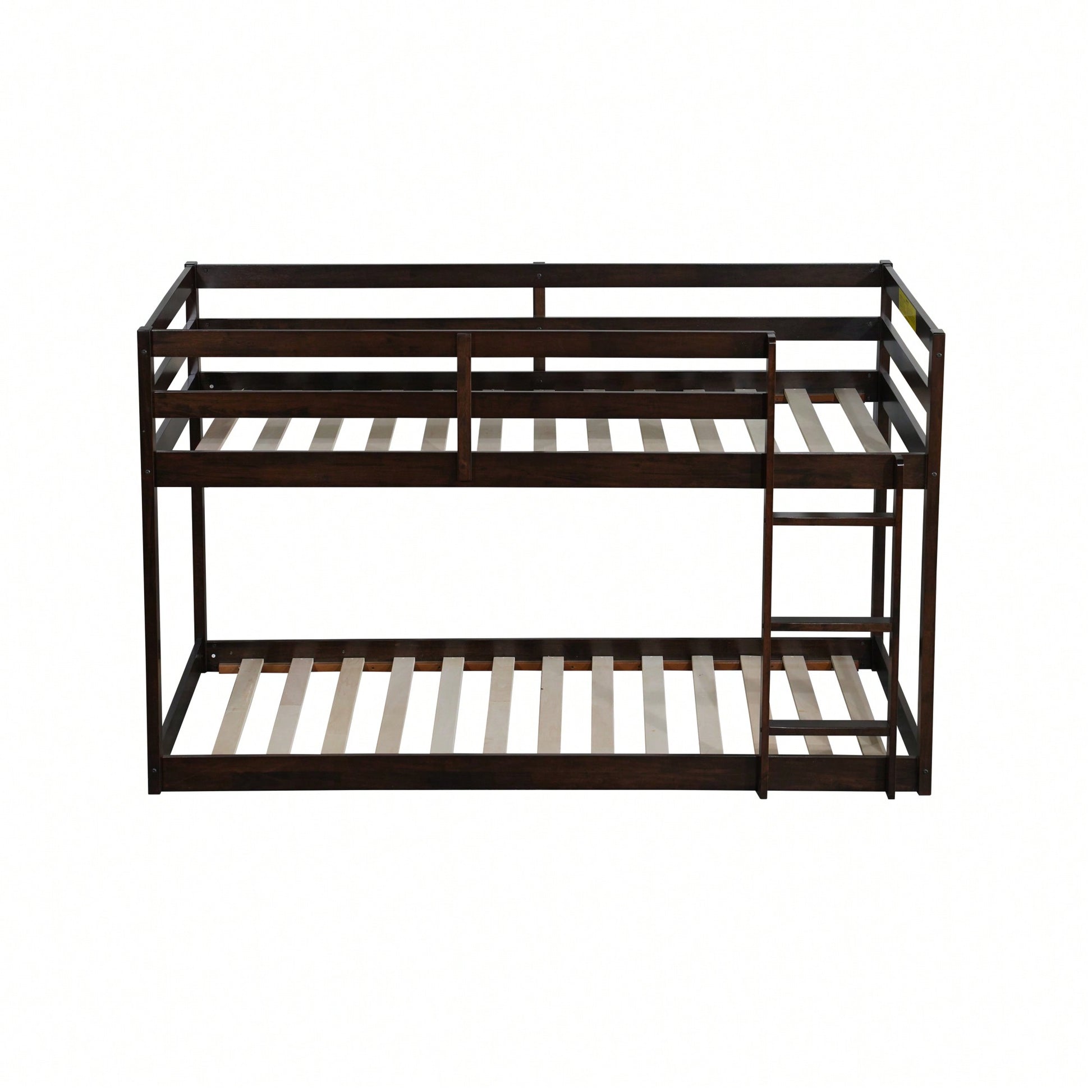 This solid wooden twin over twin loft bed combines functionality with style. Its low height design ensures stability while offering versatile sleeping options and maximizing storage space. The wide ladder provides easy access to the upper bed, making it convenient for all ages. The generous space underneath the loft bed can be utilized for organizing toys, bookshelves, or decorative cushions, keeping your bedroom tidy. Constructed from high-quality rubber wood and composite wood, this loft bed guarantees lasting sturdiness and safety, featuring 13 premium plywood slats and high guard rails for added protection. The contemporary minimalistic design allows it to seamlessly blend into any bedroom decor, with various classic color options available.