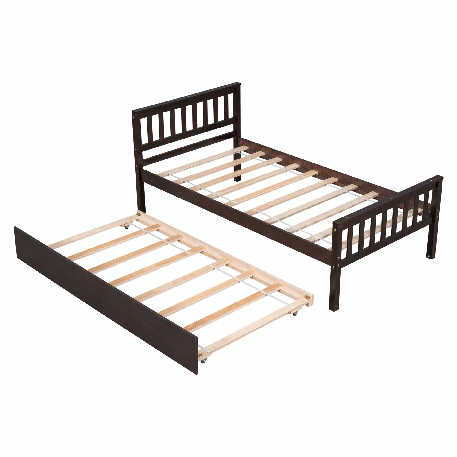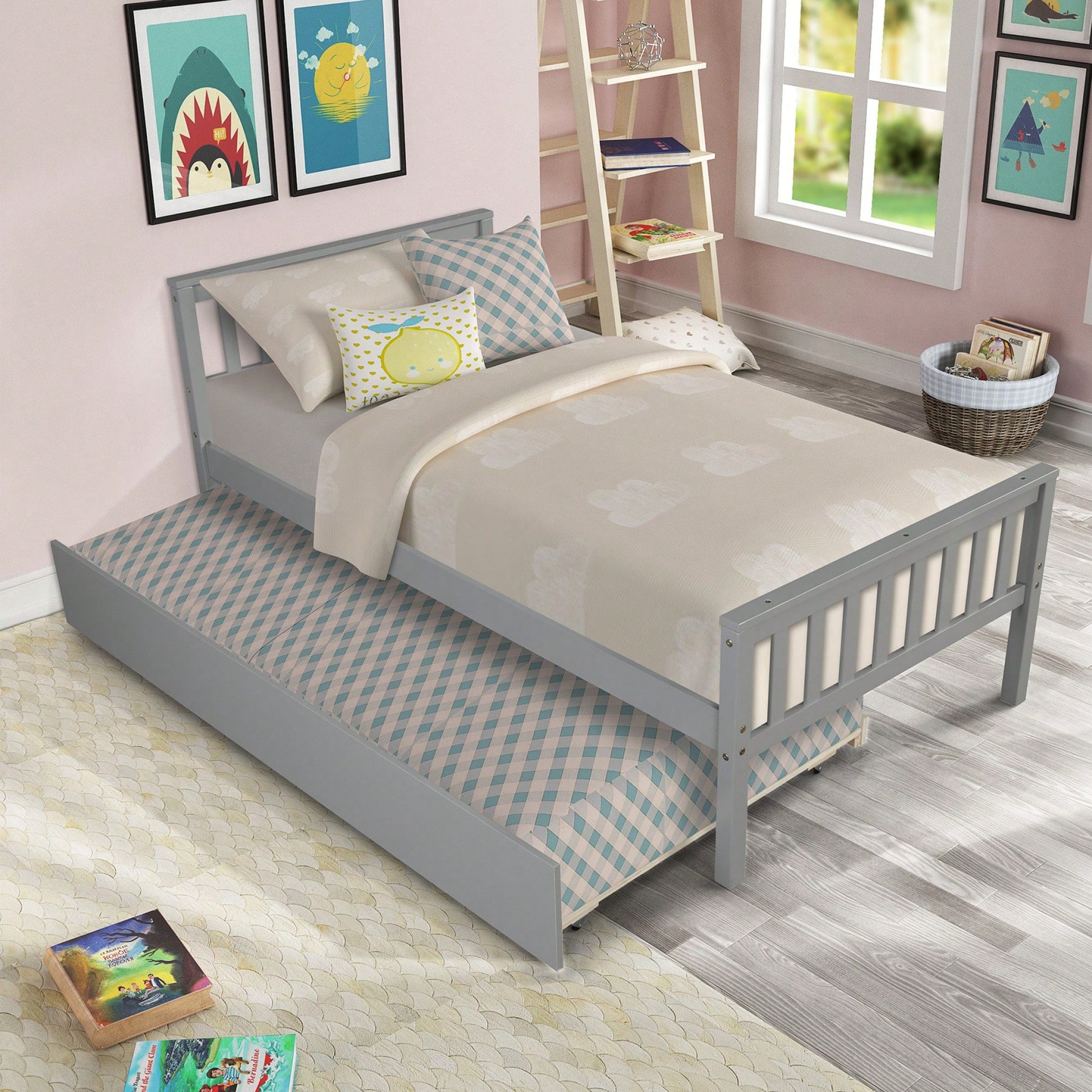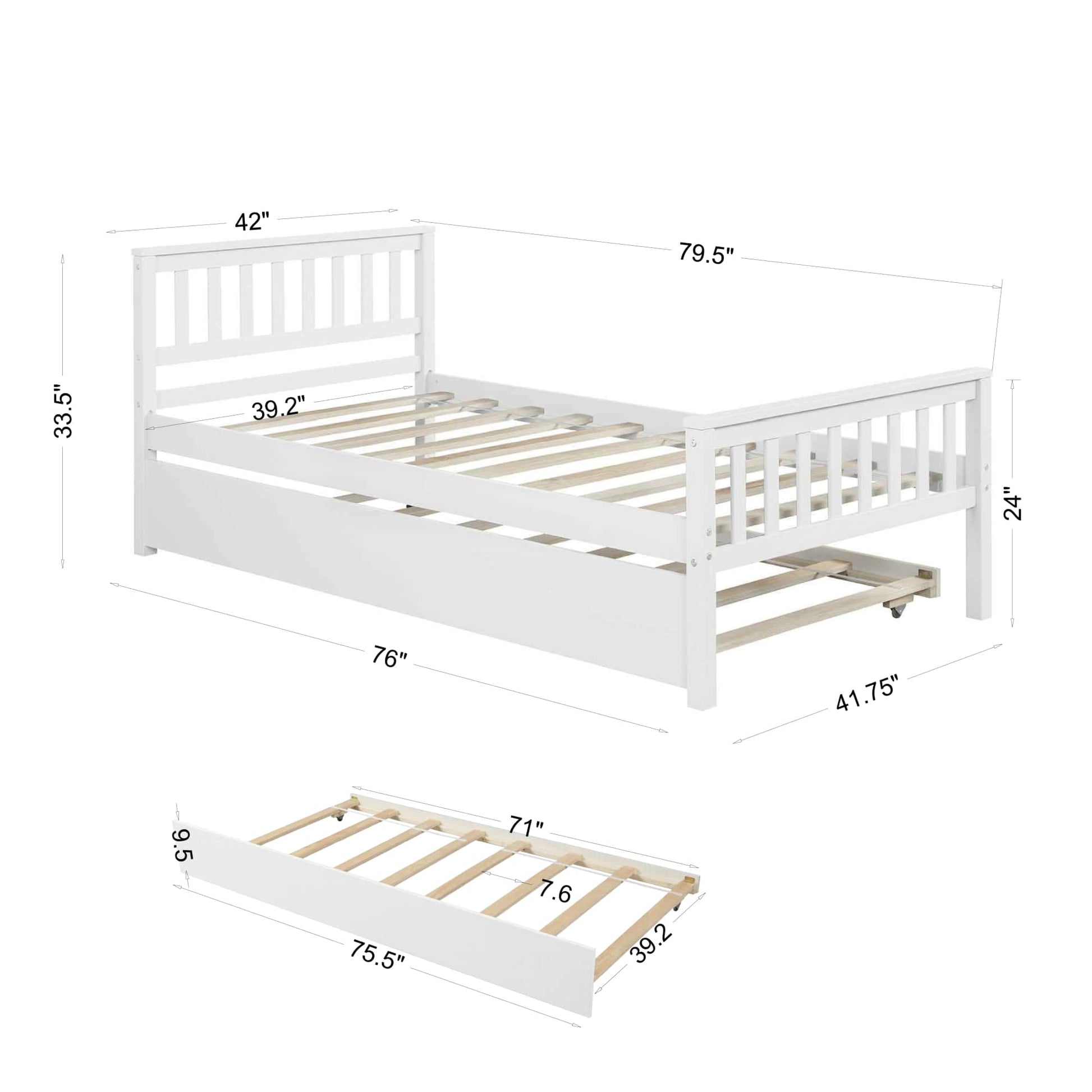 This twin bed with trundle is designed for small living spaces, providing a practical solution for accommodating guests. The trundle can be effortlessly pulled out from either side of the bed, allowing for versatile placement in different room layouts. Made from high-quality pine wood, this bed ensures lasting sturdiness and comfort with its securely slatted headboard and footboard. Its elegant design complements various interior styles, and it is available in multiple classic colors to suit any children's bedroom. The bed comes with an easy assembly manual and all necessary hardware, making setup convenient.