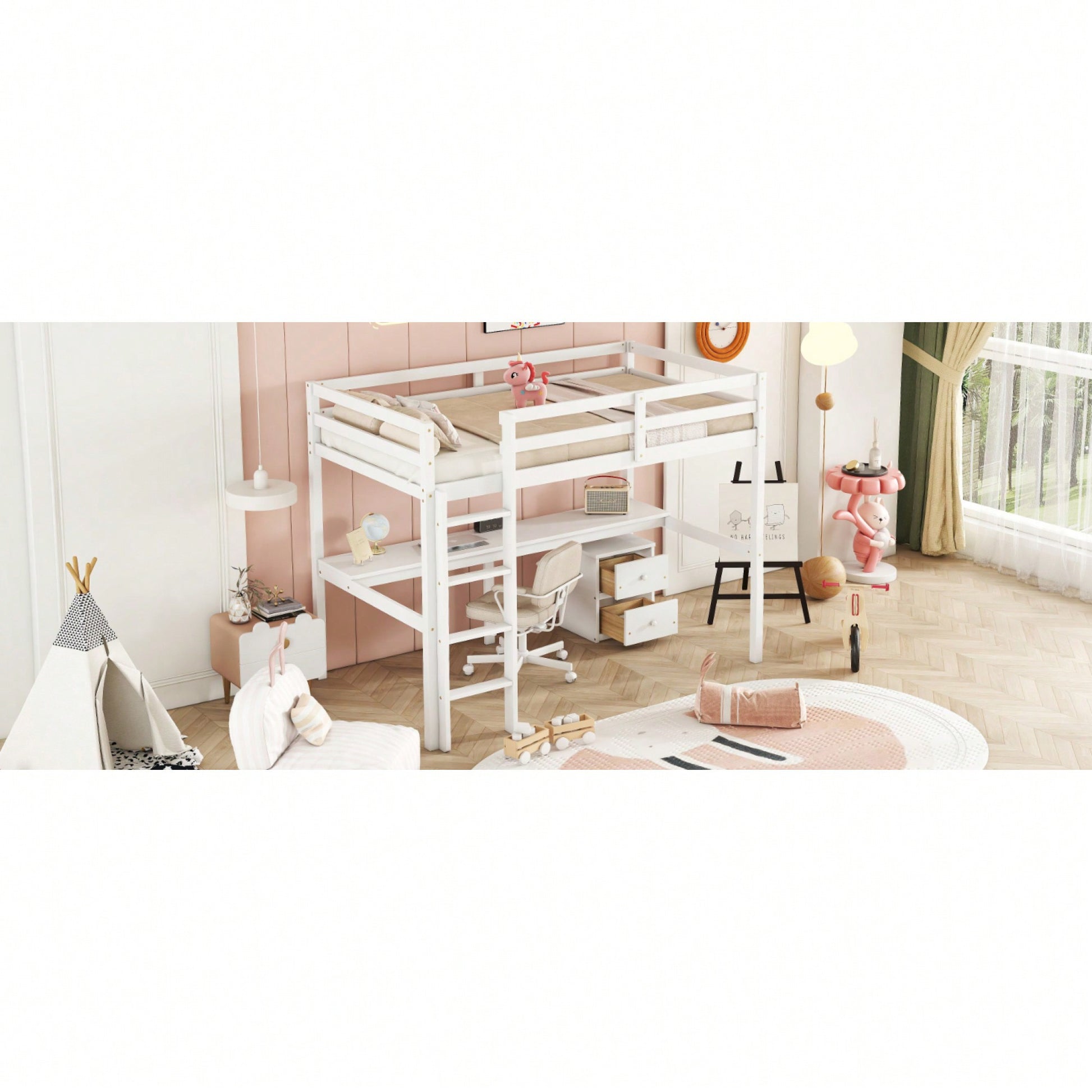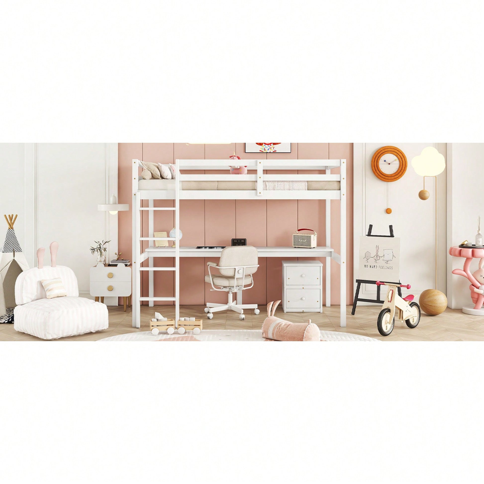 **Key Features:** - Under-bed built-in desk and storage cabinet with 2 drawers for organized space - Sturdy construction with safety features including high guard rails and a wide ladder - Crafted from premium pine wood for durability and stability - Contemporary minimalistic design available in various classic colors - Easy assembly with included manual and hardware **Product Description:** This Twin Loft Wood Bed is designed to maximize space and functionality in your bedroom. It features a spacious under-bed area that includes a built-in desk and a storage cabinet with two drawers, perfect for creating a study and leisure nook. The loft bed is constructed from high-quality pine wood, ensuring lasting sturdiness and safety, with 14 securely positioned slats providing strong stability. The wider ladder design enhances safety and ease of access to the upper bunk, while the high guard rails offer additional protection for sleepers. Its contemporary minimalistic design allows it to fit seamlessly into any room decor, and it comes in a variety of classic colors to suit your personal style. Assembly is straightforward with the included manual and hardware. **Specifications:** - Material: Premium pine wood - Number of slats: 14 - Storage cabinet: 2 drawers - Design: Twin loft bed with built-in desk and ladder - Color options: Various classic colors available