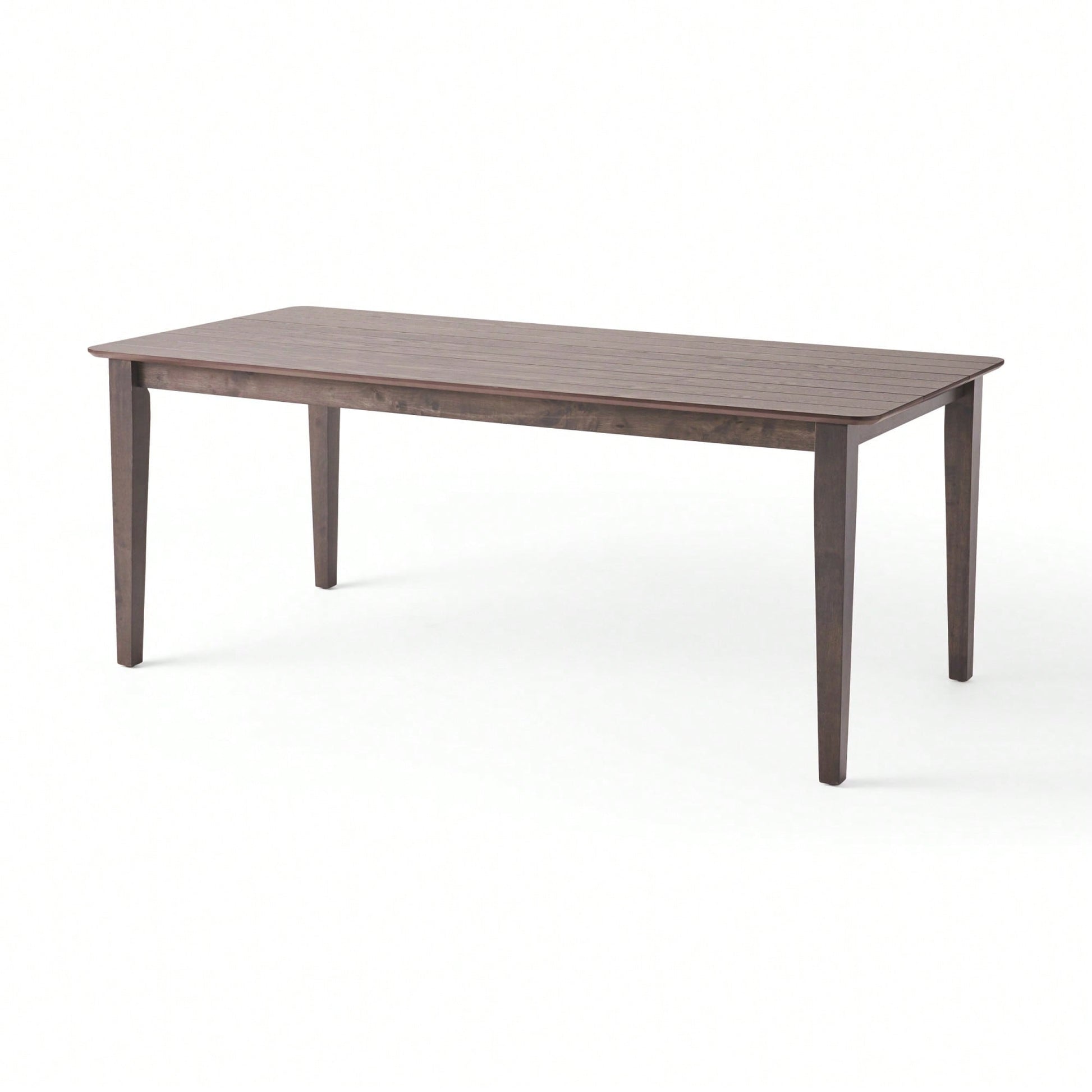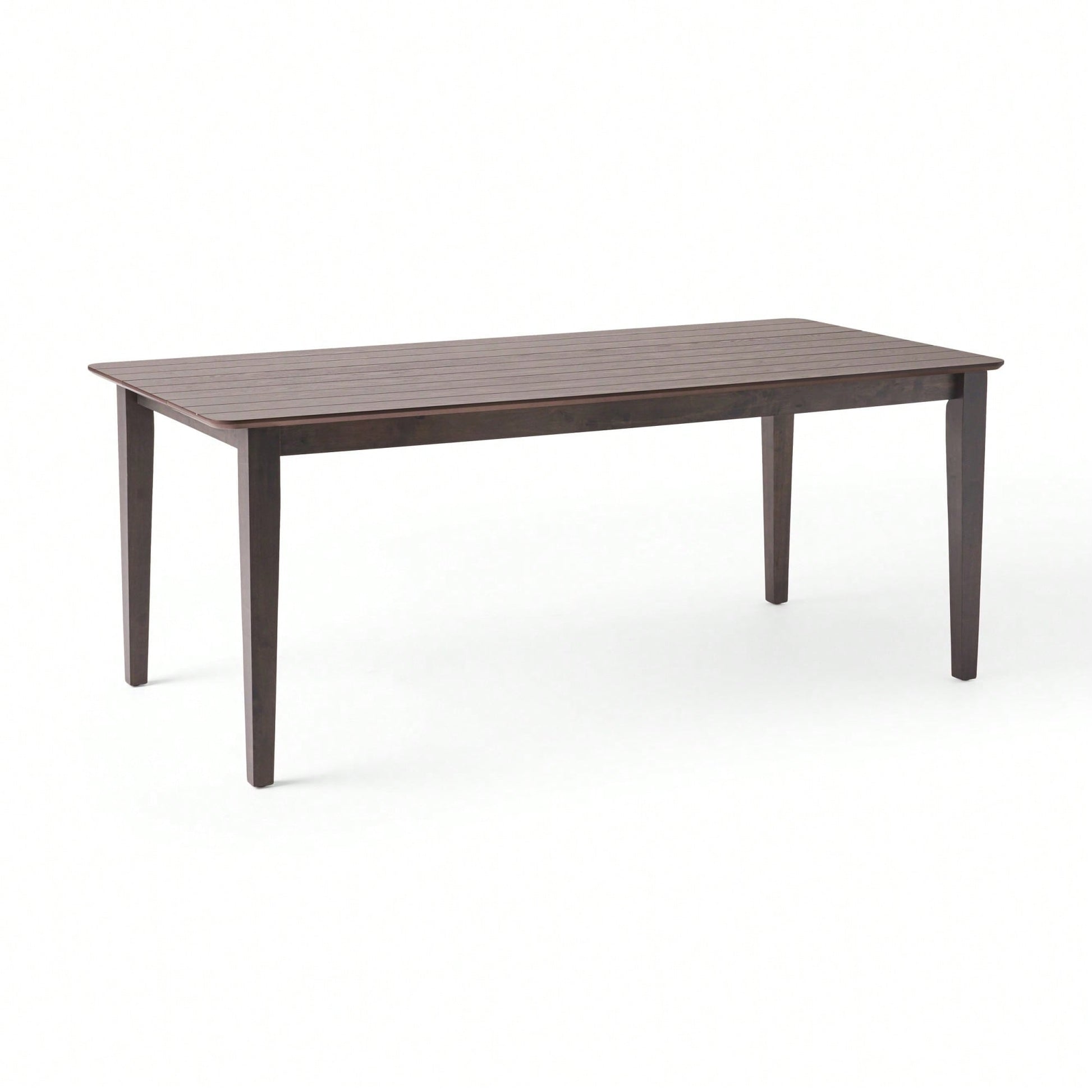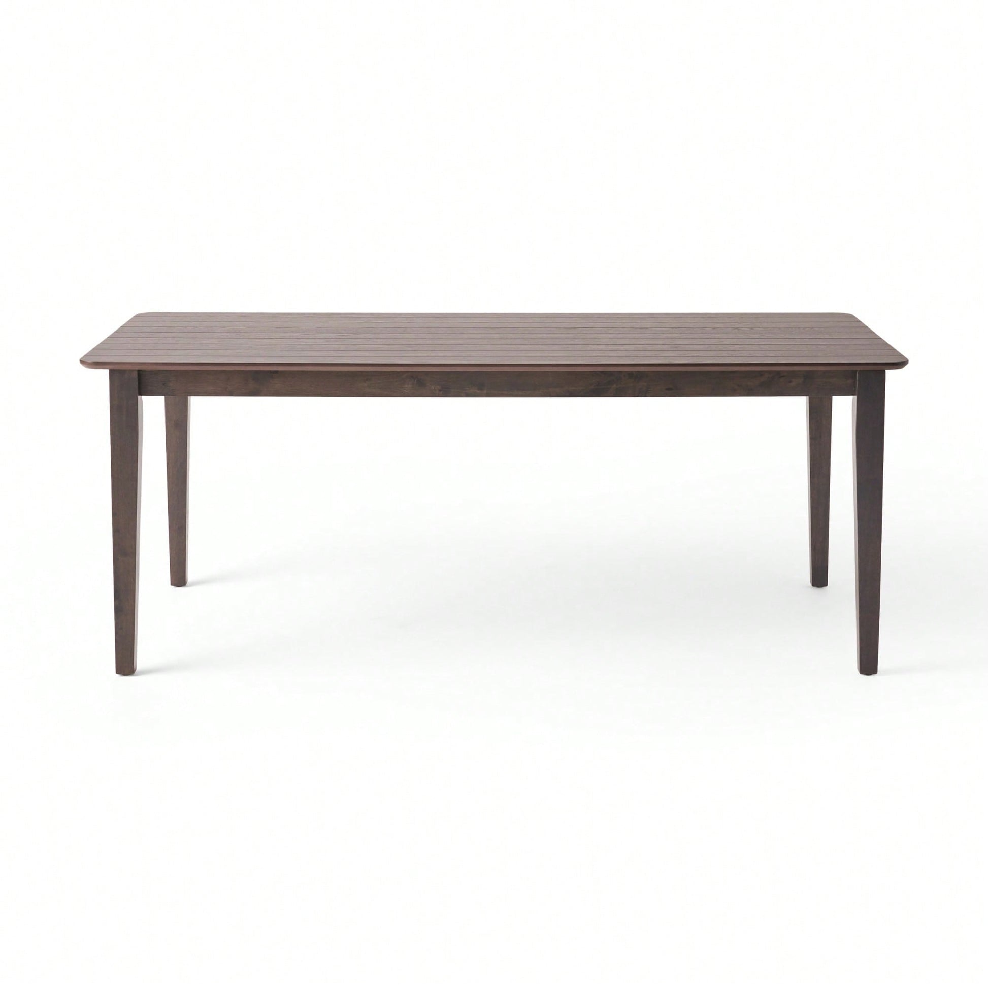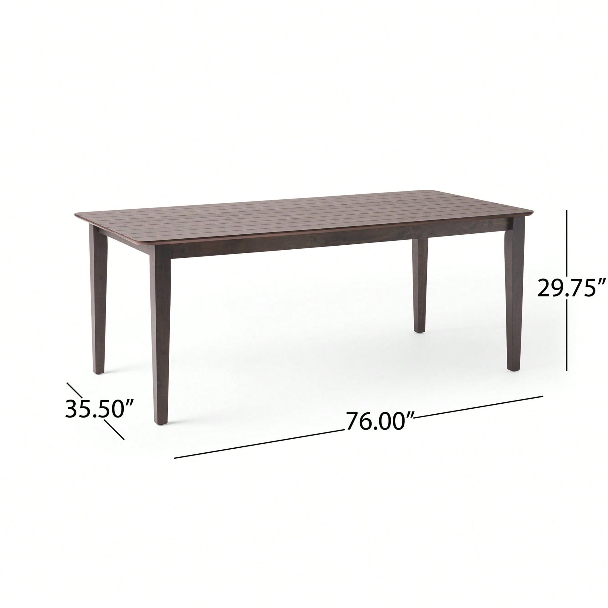 1. Features - Farmhouse design with an organic look and slatted table top - Made from durable, friendly rubberwood - Clean, precise slatting for an upgraded classic style - Four elegantly tapered square legs for stability and aesthetic appeal - Dimensions: 76.00" L x 35.50" D x 29.75" H 2. Product Description This dining table showcases a charming farmhouse design, combining rustic elements with a minimalistic aesthetic. Crafted from durable rubberwood, it features a beautiful natural grain and a stunning finish that enhances any room. The table's slatted top offers a clean, precise look, while the tapered square legs provide both stability and a snug appearance. Perfect for transforming your dining space, this table is a versatile addition to various decor styles. Specifications: - Dimensions: 76.00" L x 35.50" D x 29.75" H - Assembly required: Yes, instructions and tools included