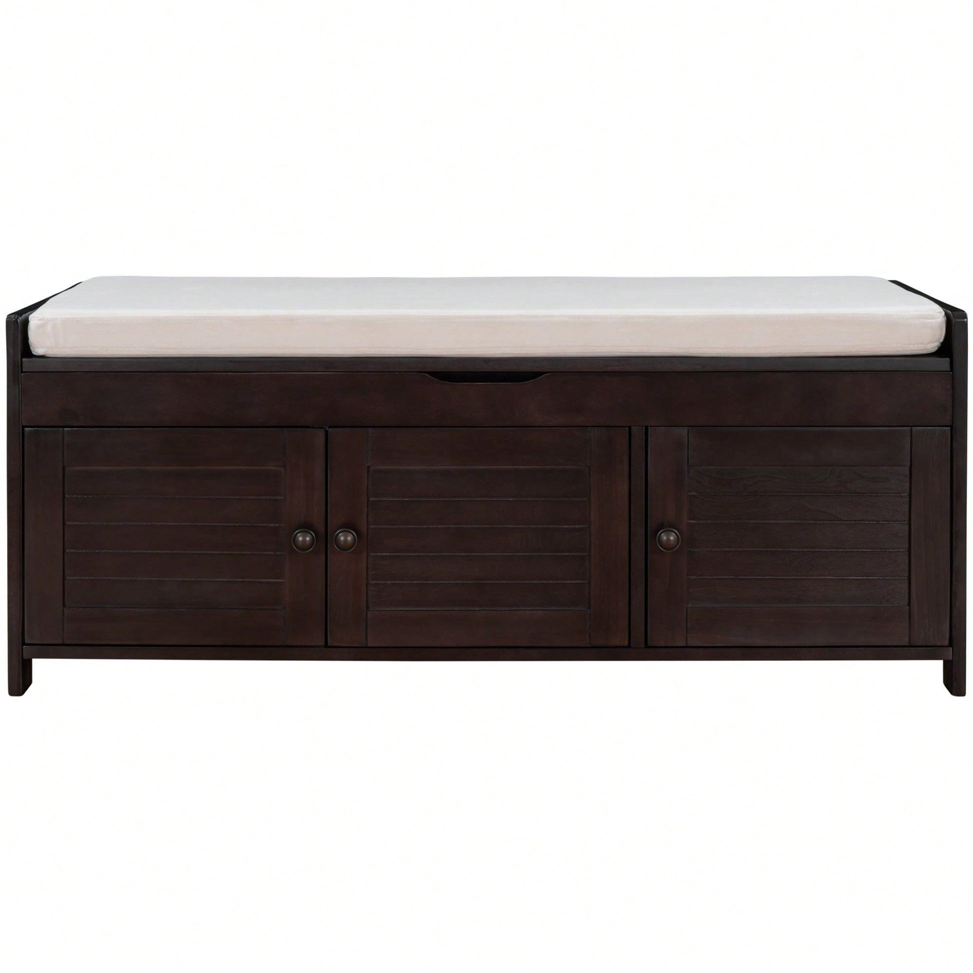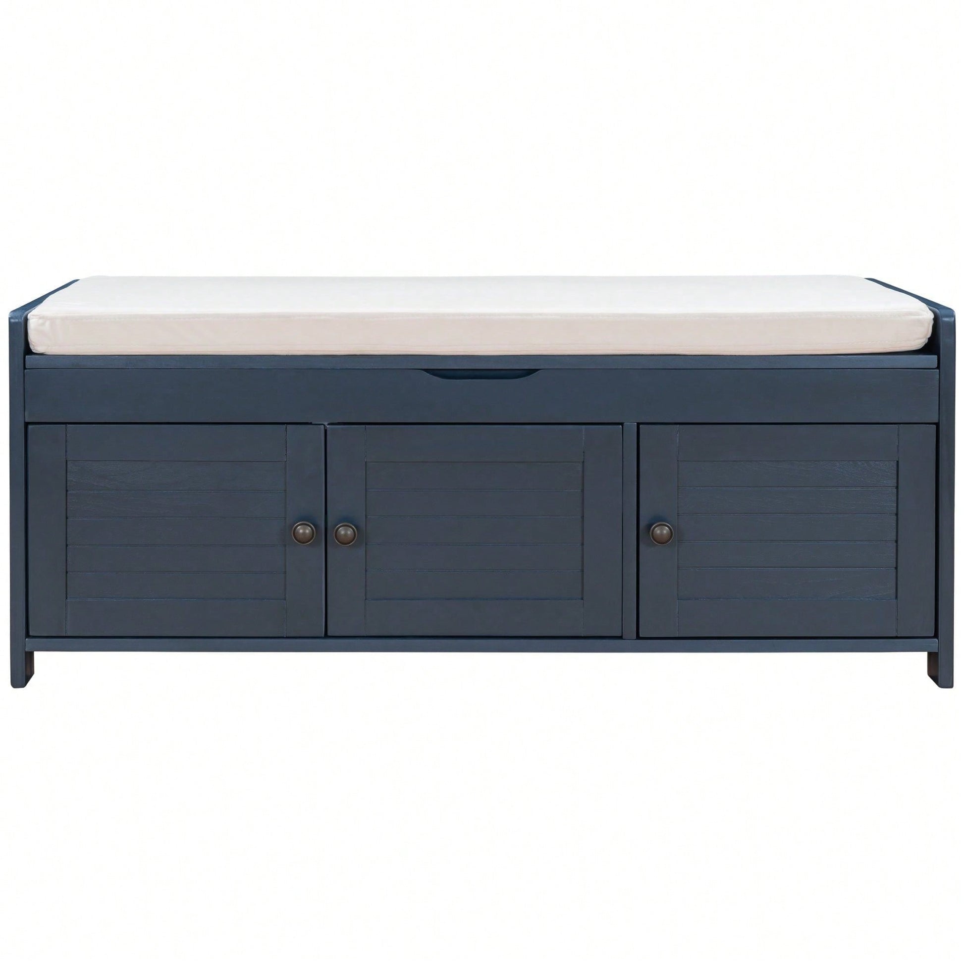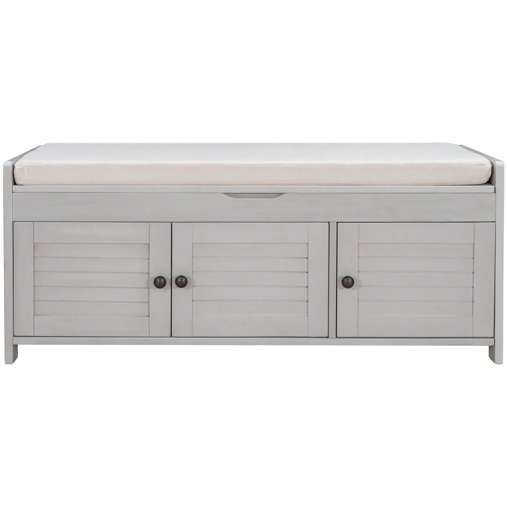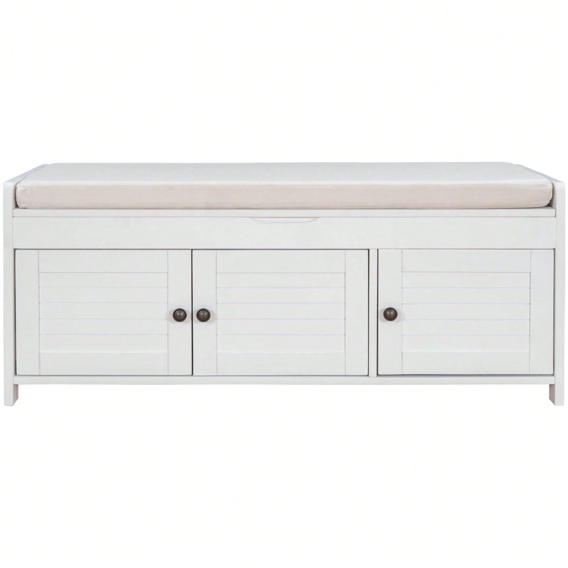 Storage Bench With 3 Shutter-Shaped Doors, Shoe Bench With Removable Cushion And Hidden Storage Space