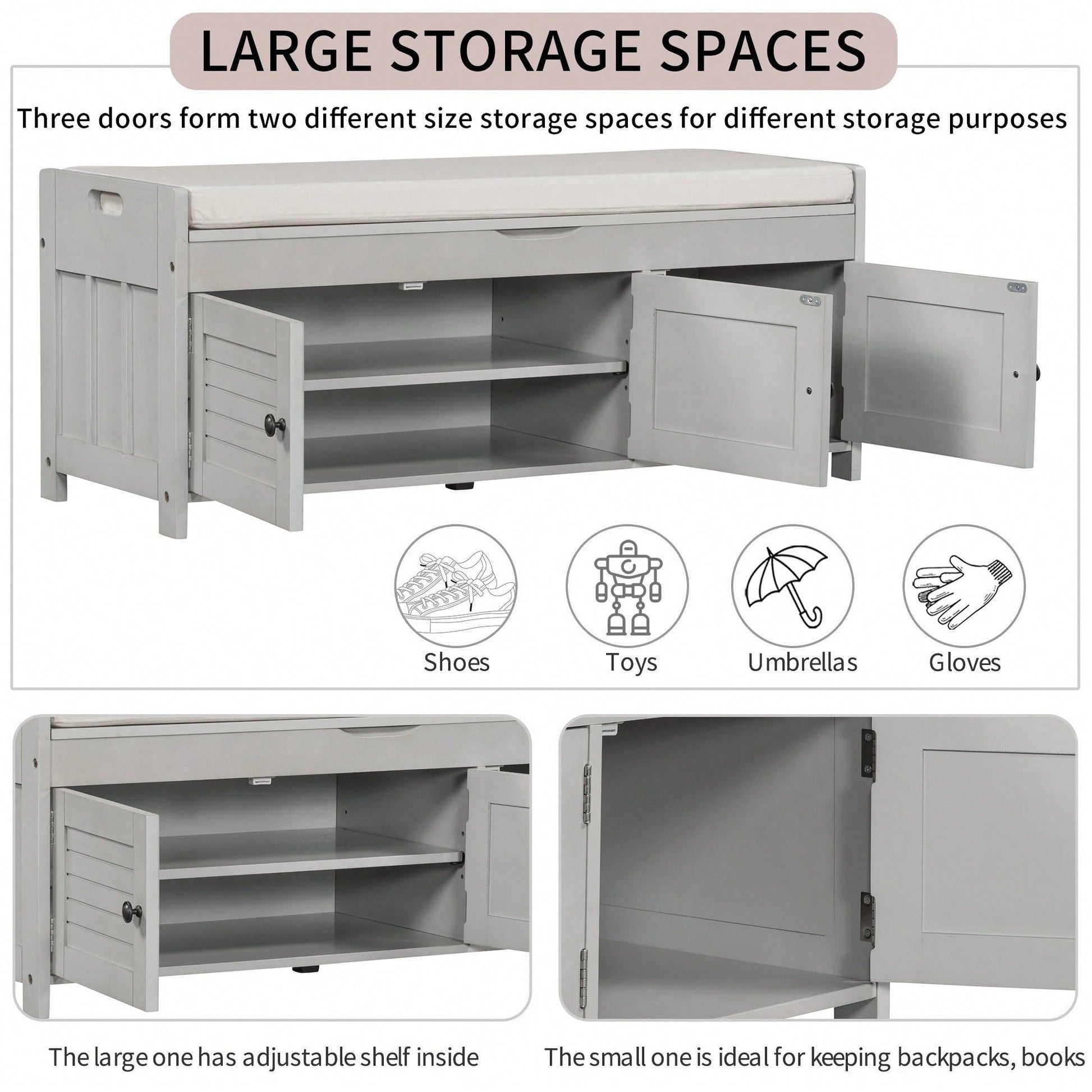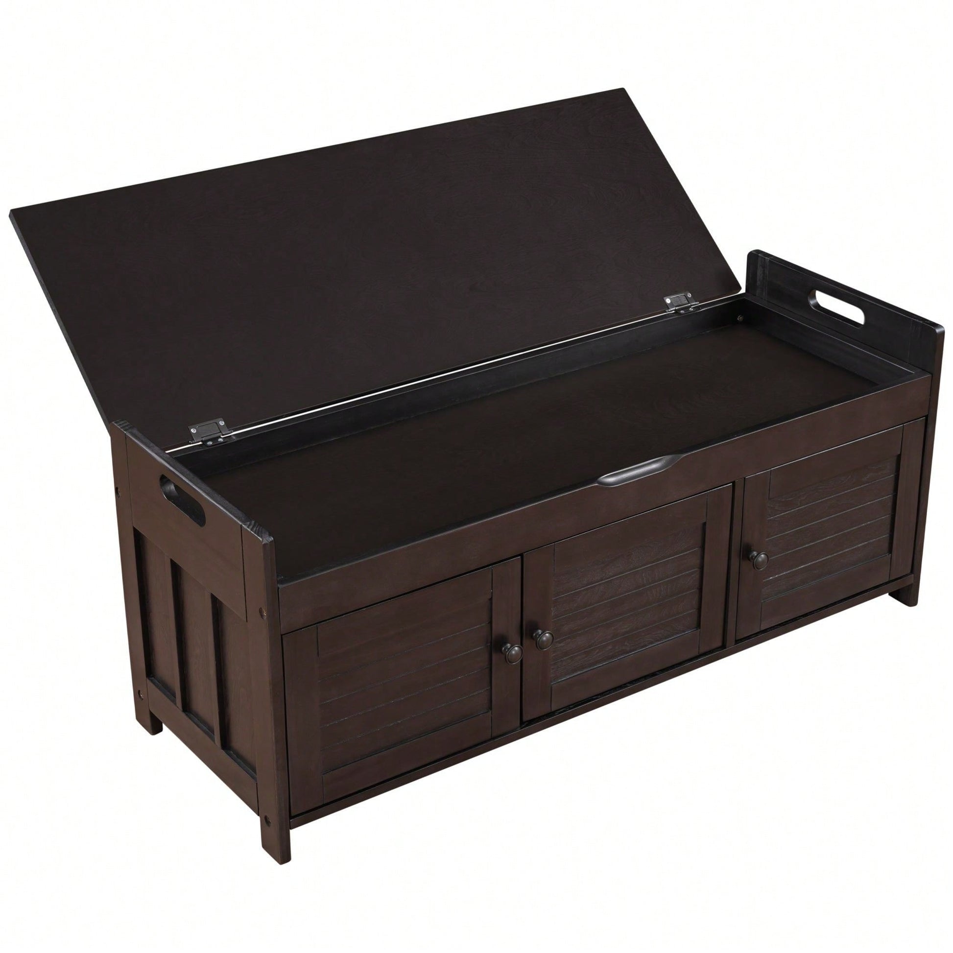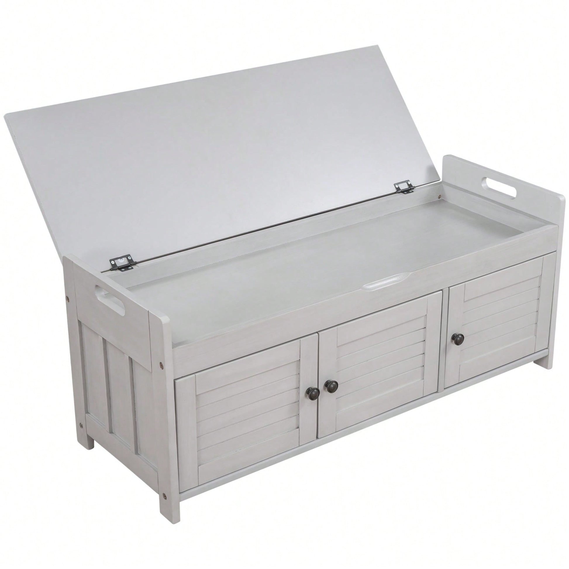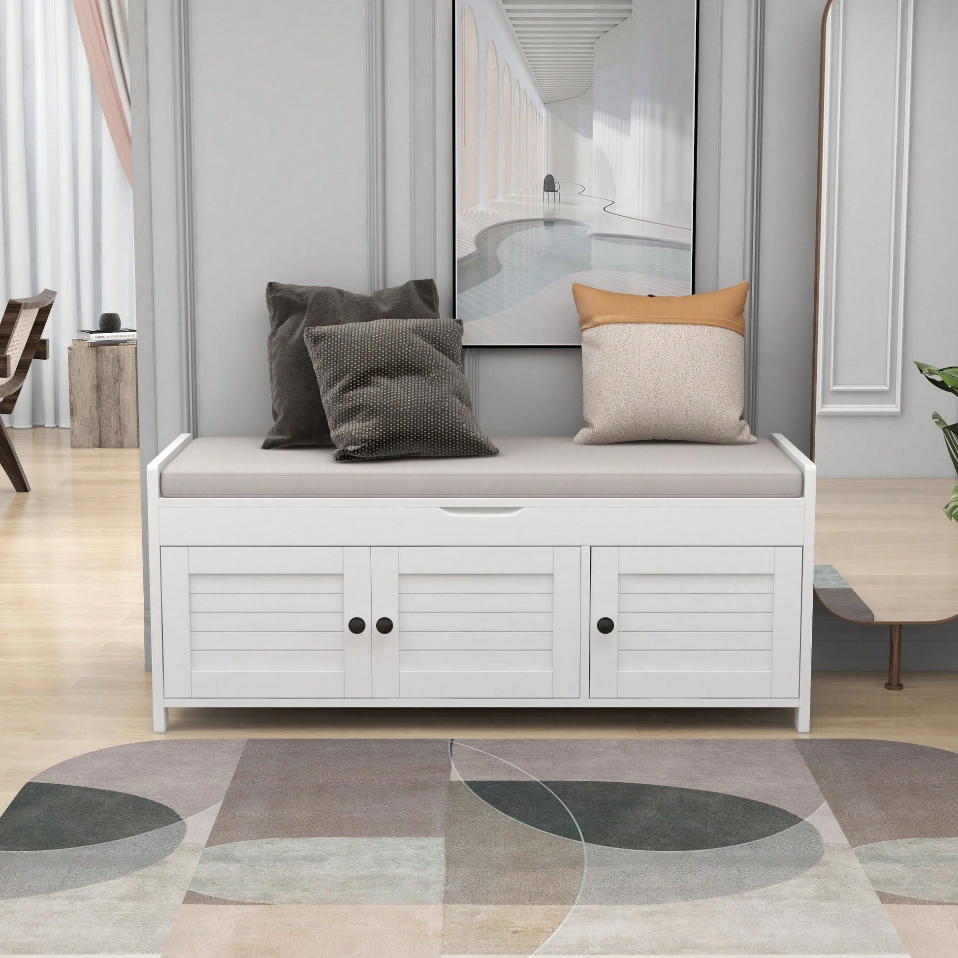 Storage Bench With 3 Shutter-Shaped Doors, Shoe Bench With Removable Cushion And Hidden Storage Space