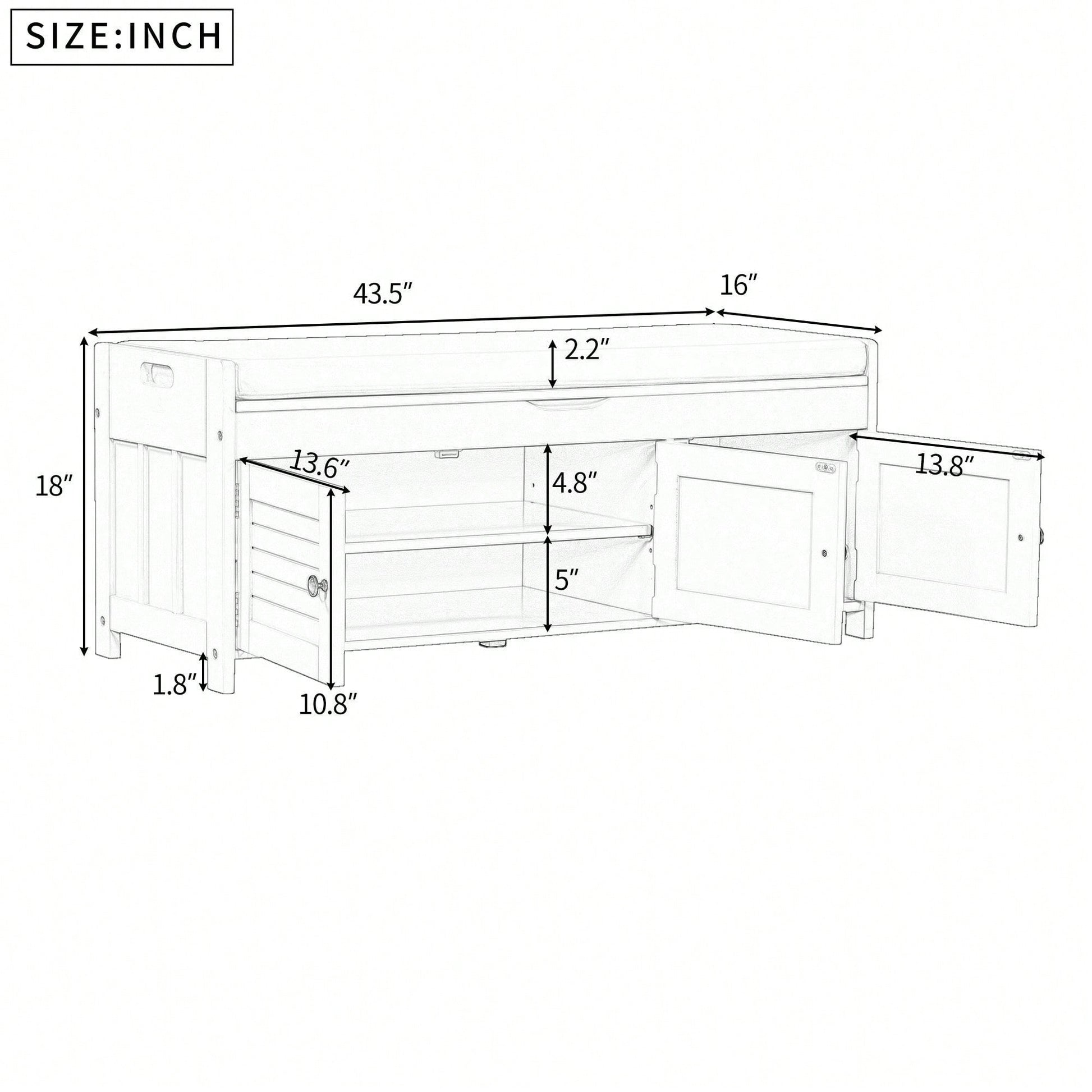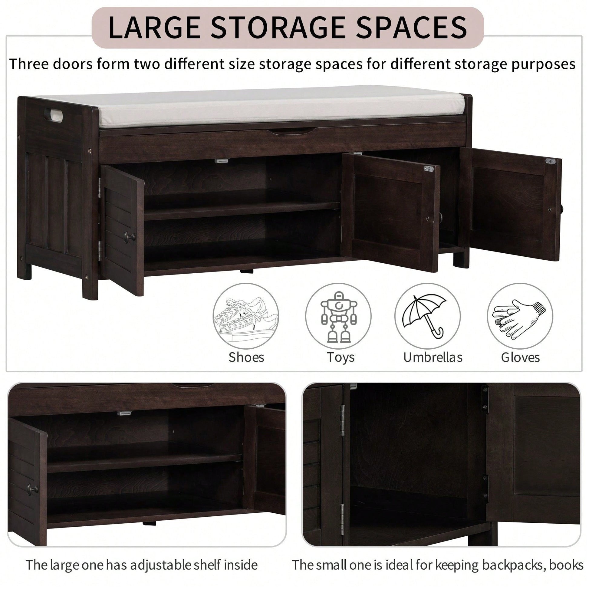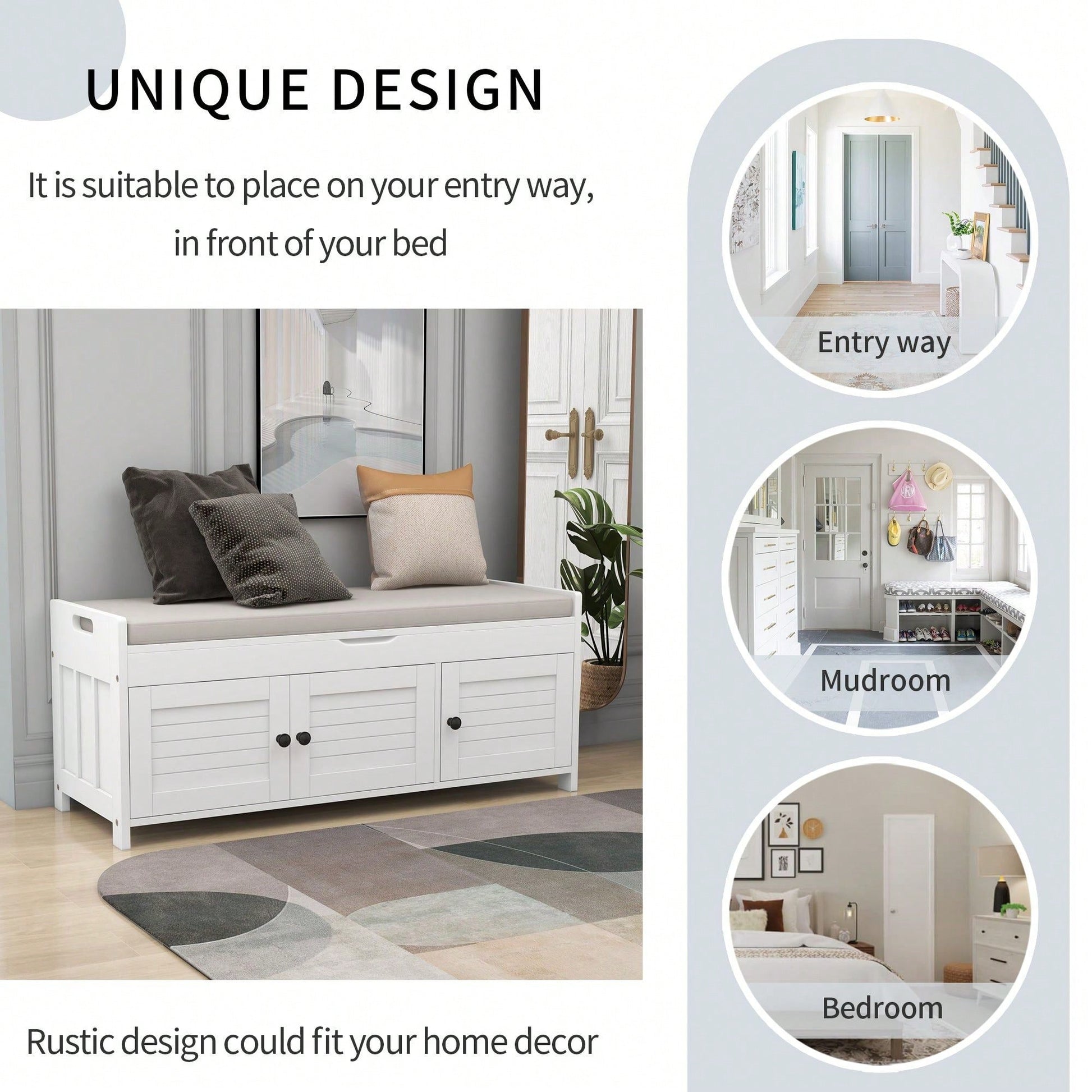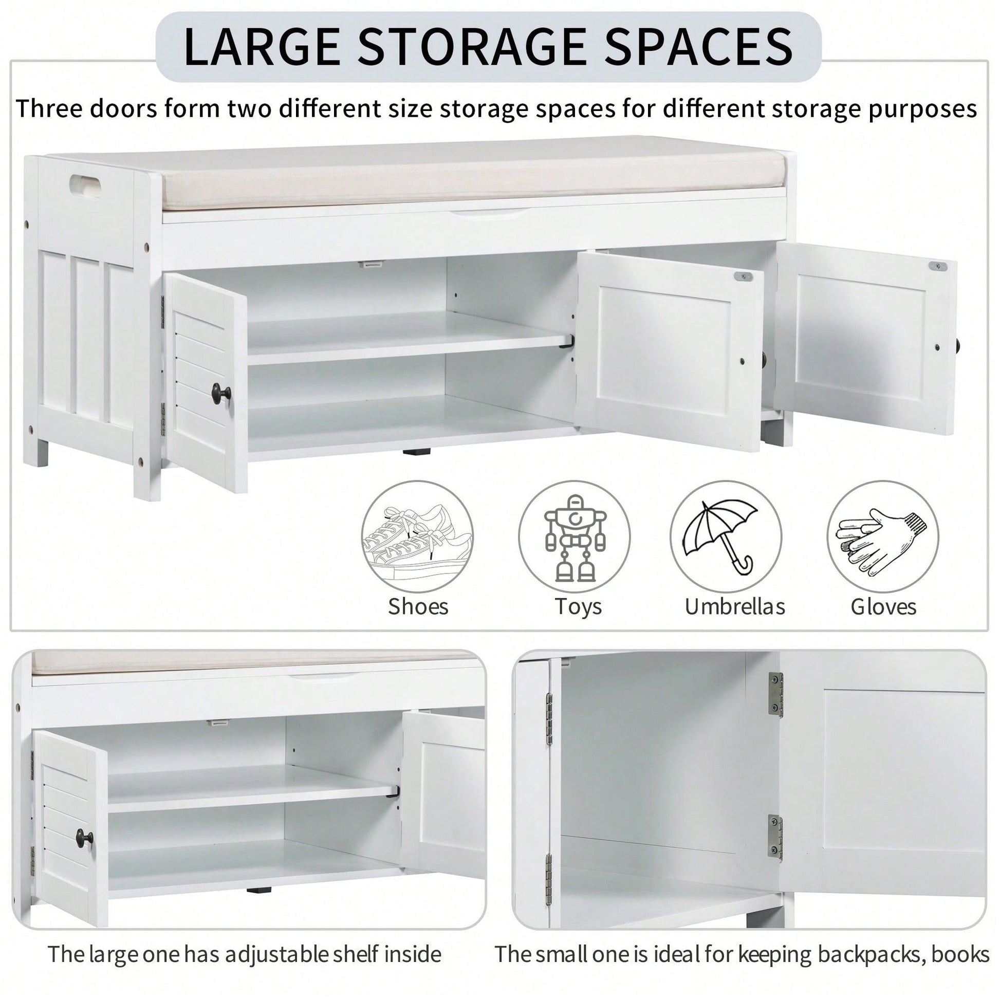 Storage Bench With 3 Shutter-Shaped Doors, Shoe Bench With Removable Cushion And Hidden Storage Space