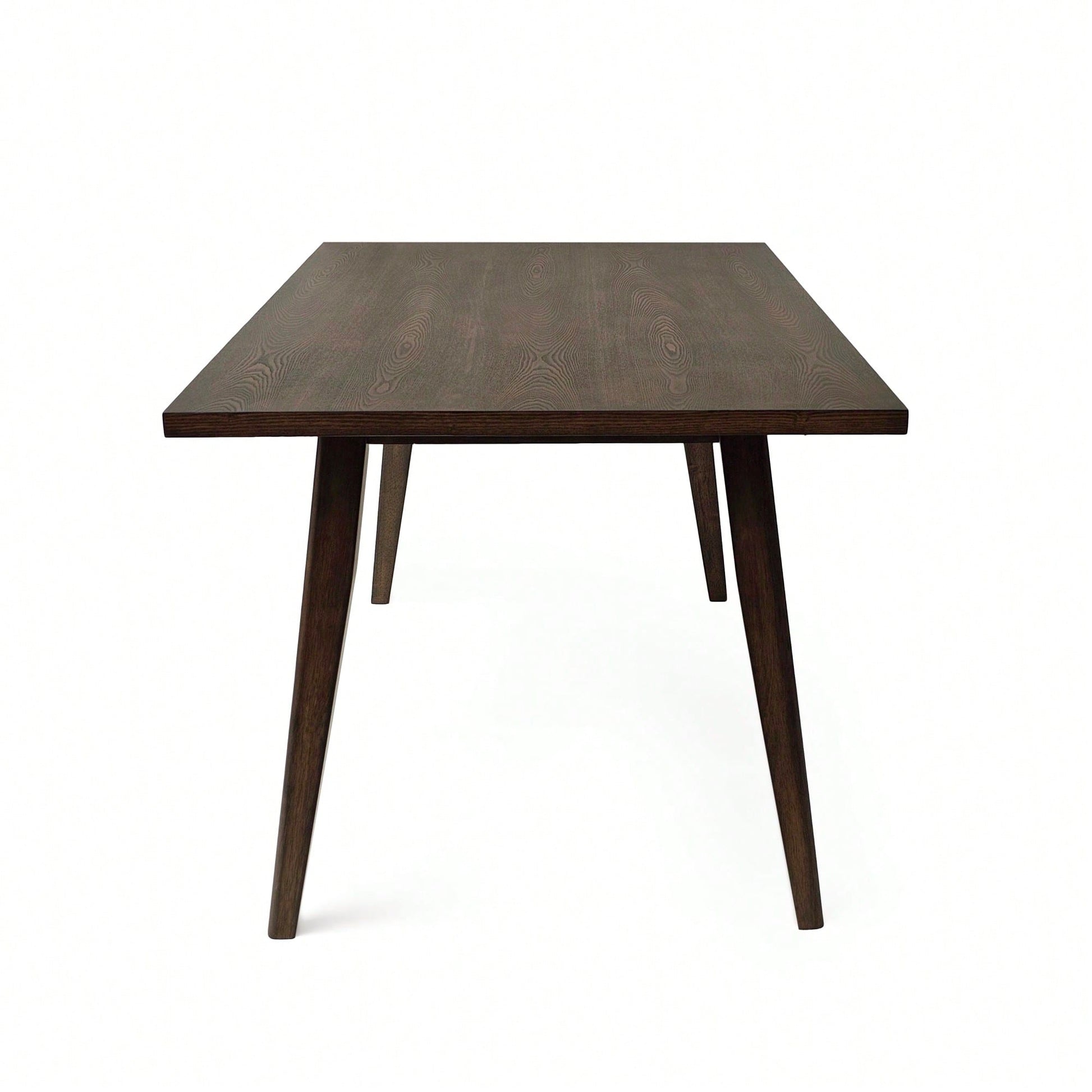 **Key Features** - Timeless mid-century design with stylish splayed legs for a classic look - Constructed from durable and friendly rubberwood - Faux wood tabletop made from engineered wood, combining beauty with low maintenance - Generous dimensions: 59.06" W x 35.43" D x 30.00" H, ideal for various dining spaces - Straightforward 2-step assembly process with included hardware and instructions **Product Description** Enhance your dining area with this exquisite wood dining table that showcases a perfect blend of style and durability. The mid-century design features iconic splayed legs and a clean, understated look that suits both classic and contemporary decor. Crafted from high-quality rubberwood, this table not only offers remarkable durability but also highlights a beautiful natural grain, making it a standout piece in any room. The tabletop is constructed from a faux wood material that mimics the appearance of real wood while requiring minimal upkeep. This low-maintenance option retains the aesthetic appeal without the associated high maintenance. With its generous dimensions, this dining table can accommodate family and friends comfortably, creating an inviting atmosphere for meals and gatherings. Assembly is quick and easy, requiring only two simple steps to set up, allowing you to enjoy your new centerpiece in no time. **Specifications** - Dimensions: 59.06" W x 35.43" D x 30.00" H - Material: Rubberwood legs and faux wood tabletop - Assembly: Easy 2-step assembly (hardware and instructions included)
