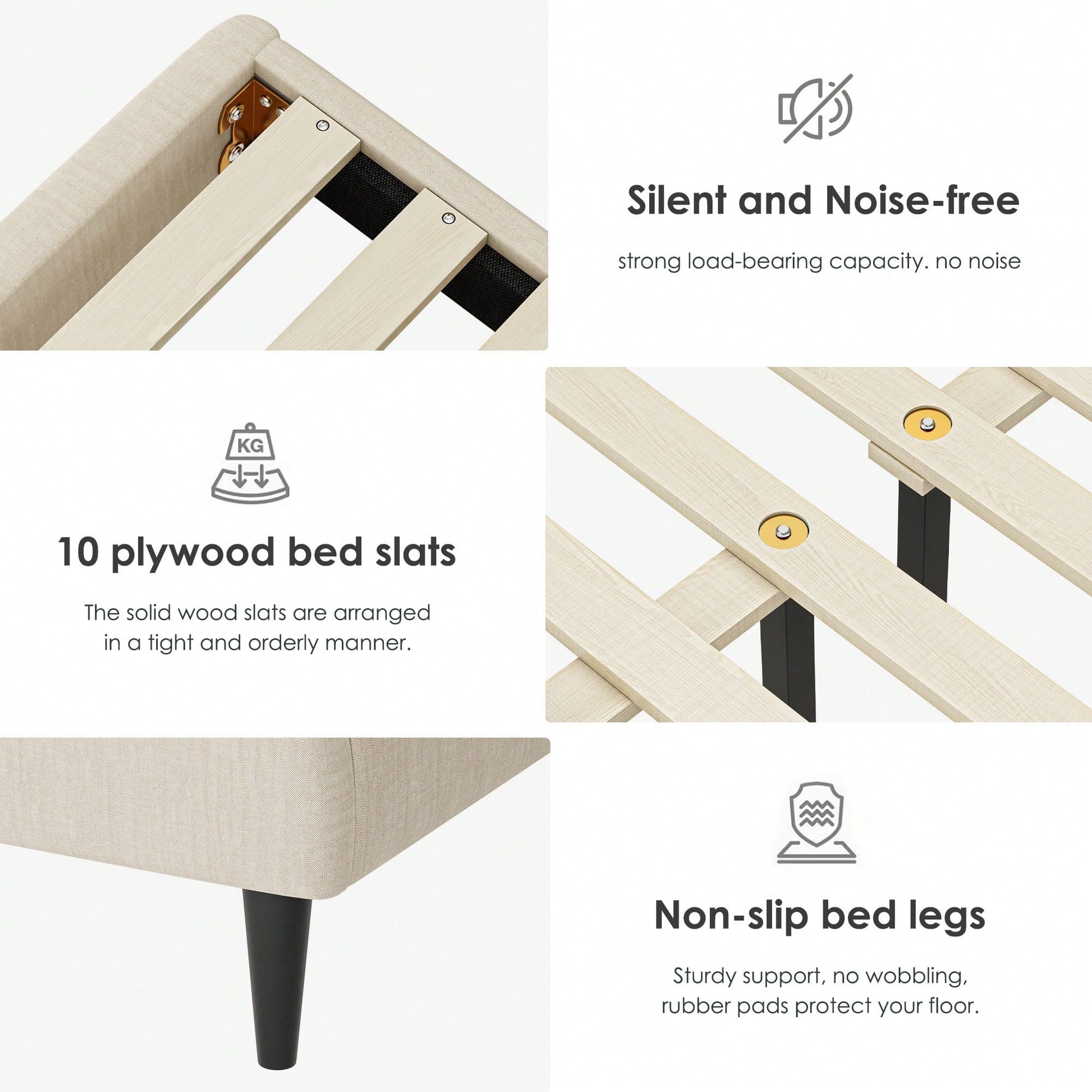 **Key Features** - Supports up to 705 lbs with sturdy wooden slats and center support legs. - Noiseless design includes plastic mats to protect the floor and eliminate friction. - Adjustable RGB LED lighting on the headboard with over 60,000 color options. - Efficient assembly with clear instructions; can be set up by two people in under an hour. - Easy to disassemble and transport, fitting conveniently in a car trunk. **Product Description** This queen size bed frame combines functionality and style, featuring a sturdy metal structure with a noiseless design. The bed frame eliminates the need for a box spring by using 15 heavy-duty metal slats and 11 support legs to provide optimal support for any mattress type. Its innovative design incorporates a silent sponge bar on the center beam to prevent noise during use, ensuring an uninterrupted sleep experience. The included RGB LED-lit headboard adds a modern touch, allowing you to customize the ambiance with over 60,000 color options, brightness settings, and various light modes, all easily controlled via a remote or mobile app. Assembly is straightforward, with all necessary components conveniently packed in a single box. The clear instructions lead to a setup that can be completed by two people in less than an hour. For those moving homes, the frame disassembles easily for transport in the car trunk. **Specifications** - Maximum Load Capacity: 705 lbs - Number of Slats: 15 - Number of Support Legs: 11 - LED Light Options: 60,000+ colors, adjustable brightness, multiple modes - Assembly: Requires 2 people, takes under 1 hour - Packing: Efficient, single box for easy shipping and handling