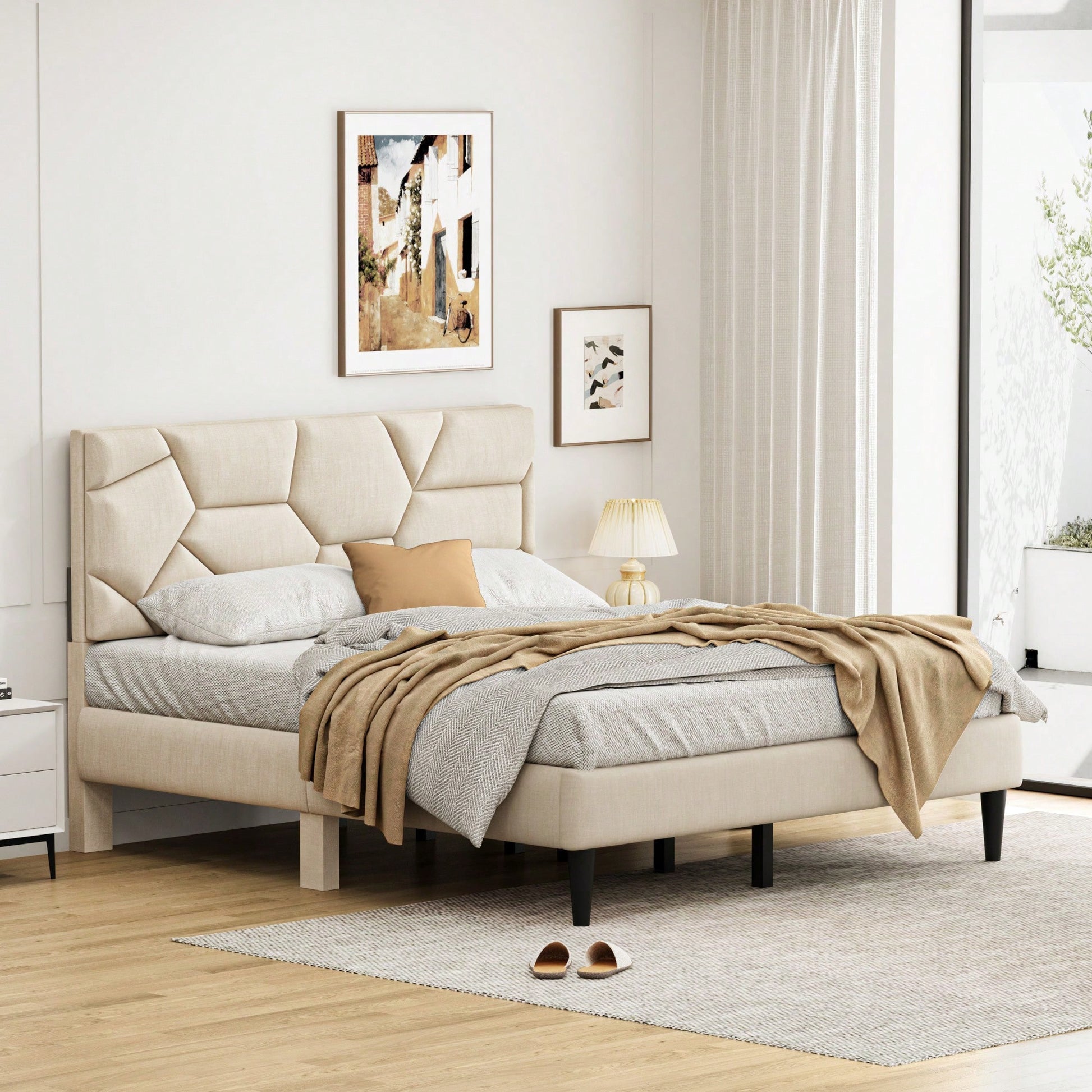 Sturdy Queen Size Metal Bed Frame With Storage Headboard – No Noise, Supportive Slats, No Box Spring Required