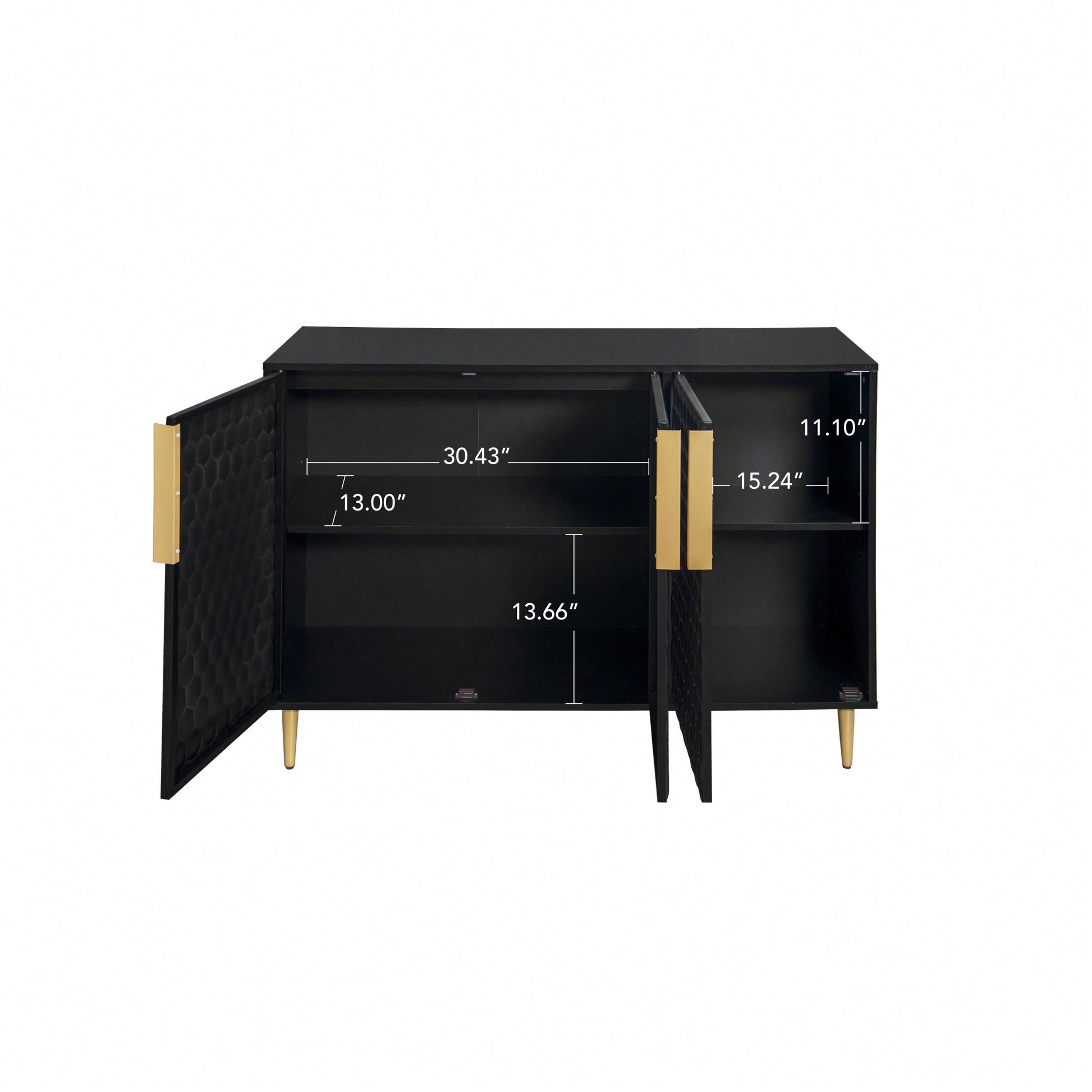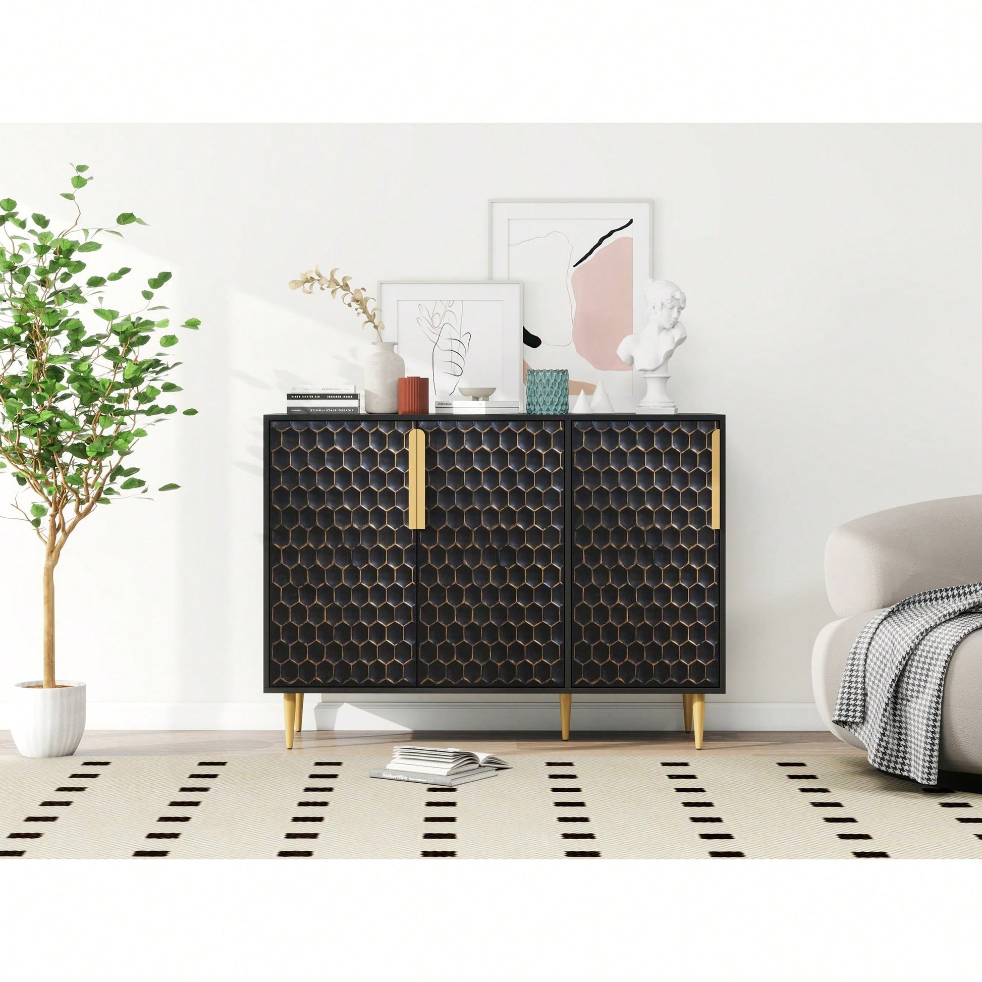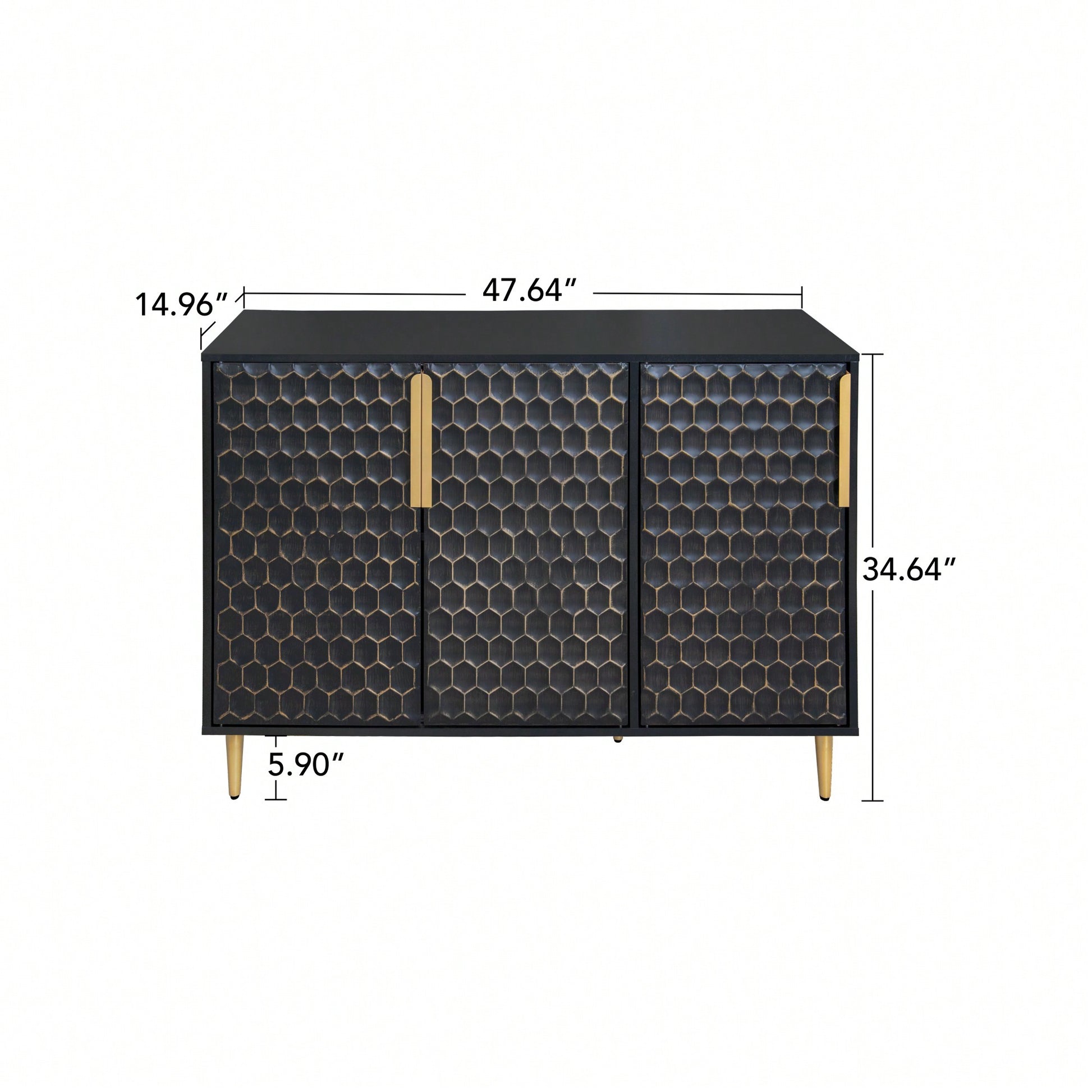 This 3-door storage cabinet offers ample storage space and features adjustable shelves to meet your daily organization needs. The metal doors showcase a distinctive honeycomb seamless hexagonal pattern that adds a touch of modern aesthetics to any living room, dining room, kitchen, or entrance. The elegant golden metal handle complements the design while providing a comfortable grip. The tapered metal feet ensure stability, and the additional support feet along with adjustable foot pads allow for easy leveling on uneven surfaces. The spacious countertop is perfect for display and operational use, making it a versatile addition to your home.