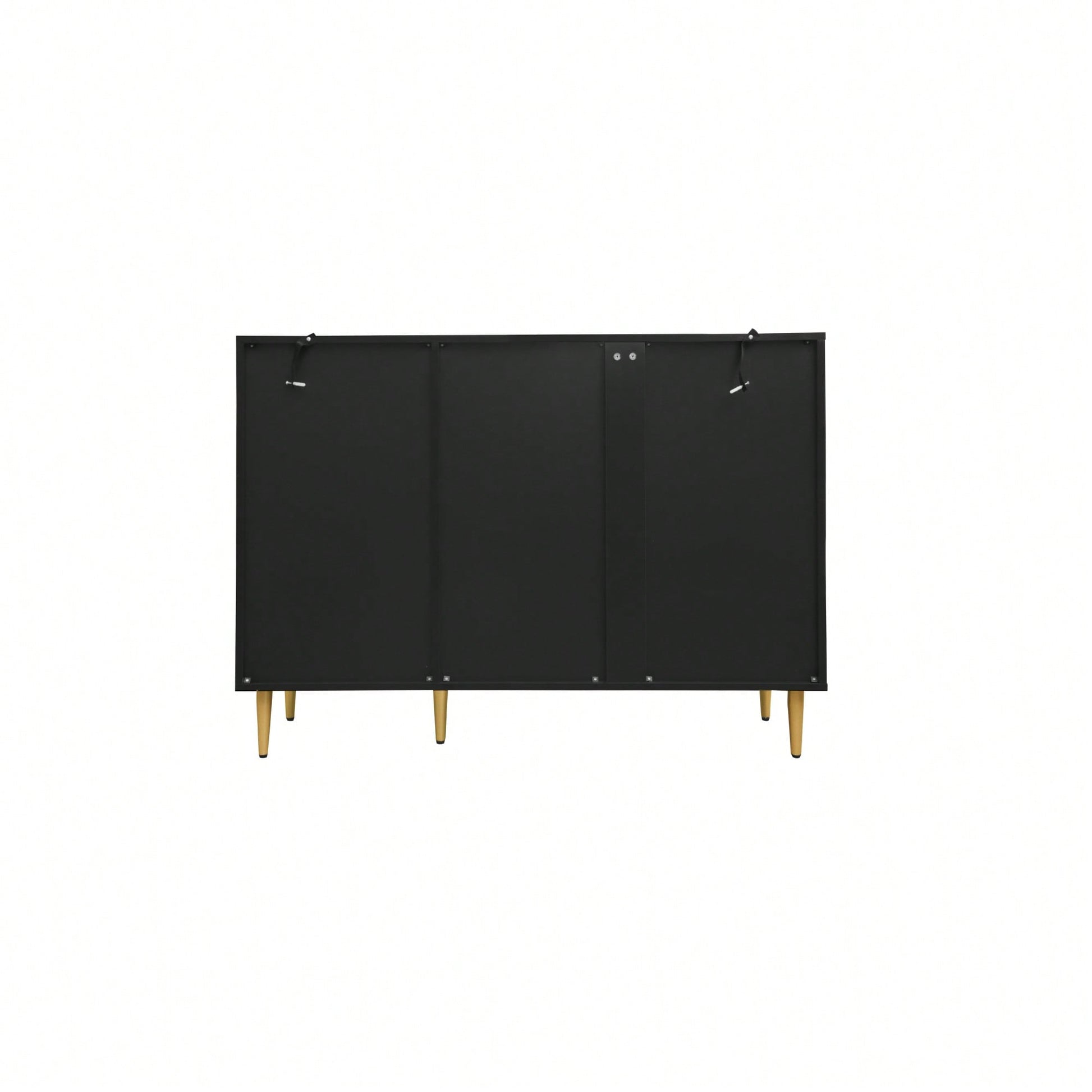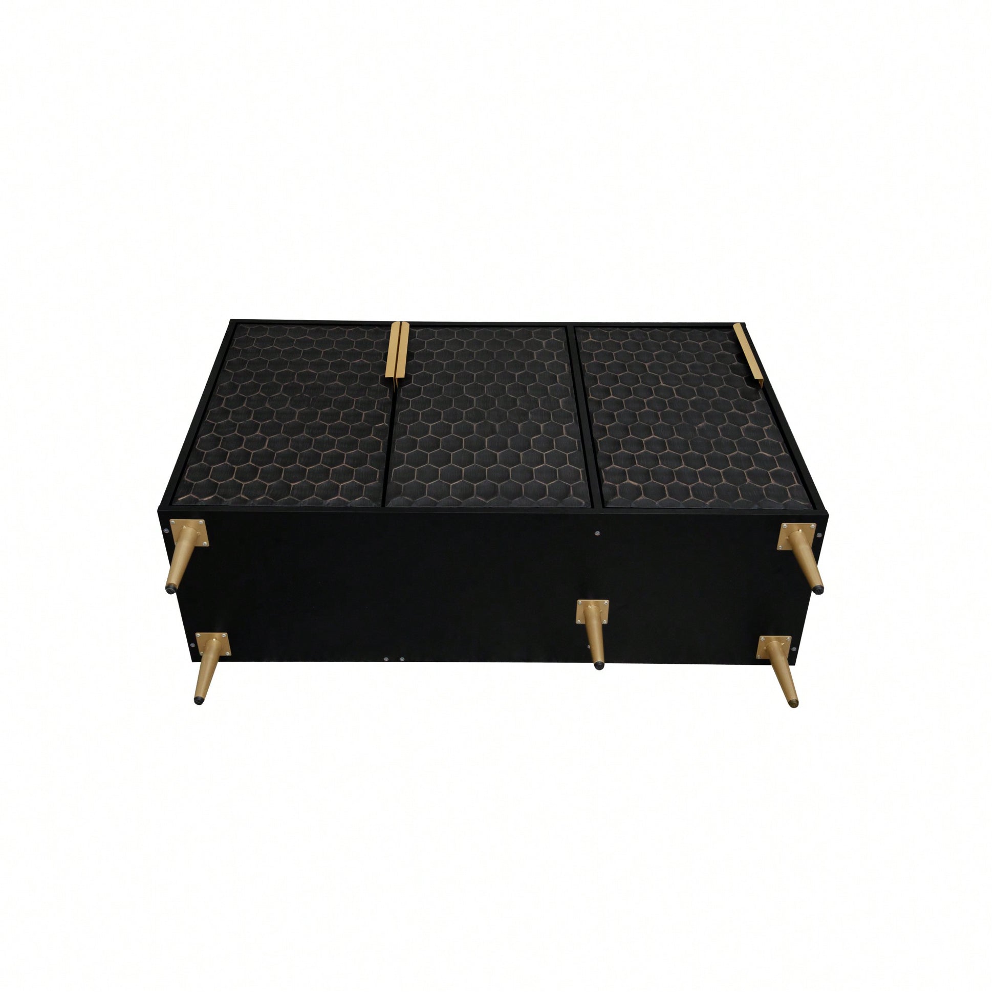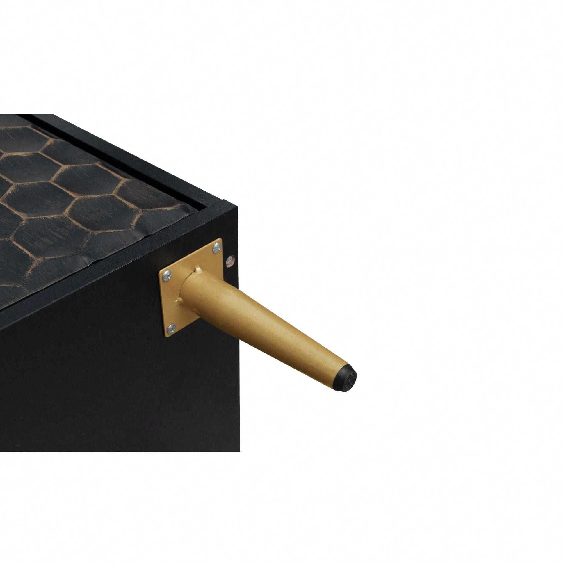 This 3-door storage cabinet offers ample storage space and features adjustable shelves to meet your daily organization needs. The metal doors showcase a distinctive honeycomb seamless hexagonal pattern that adds a touch of modern aesthetics to any living room, dining room, kitchen, or entrance. The elegant golden metal handle complements the design while providing a comfortable grip. The tapered metal feet ensure stability, and the additional support feet along with adjustable foot pads allow for easy leveling on uneven surfaces. The spacious countertop is perfect for display and operational use, making it a versatile addition to your home.
