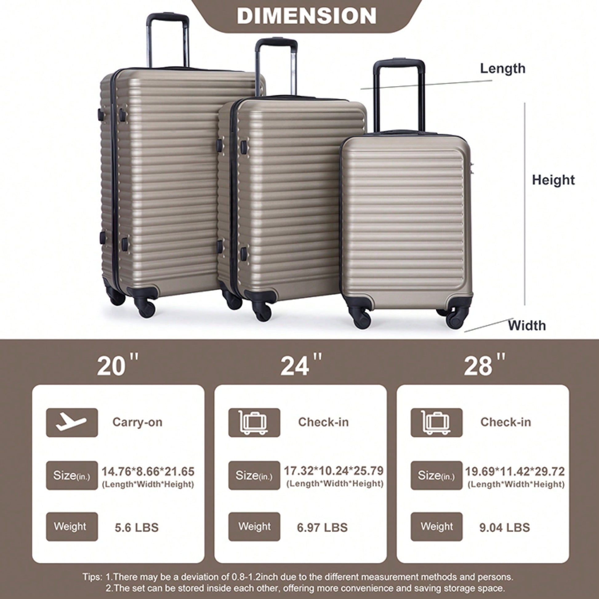 - Sizes: 20" (carry-on), 24" (check-in), 28" (check-in)