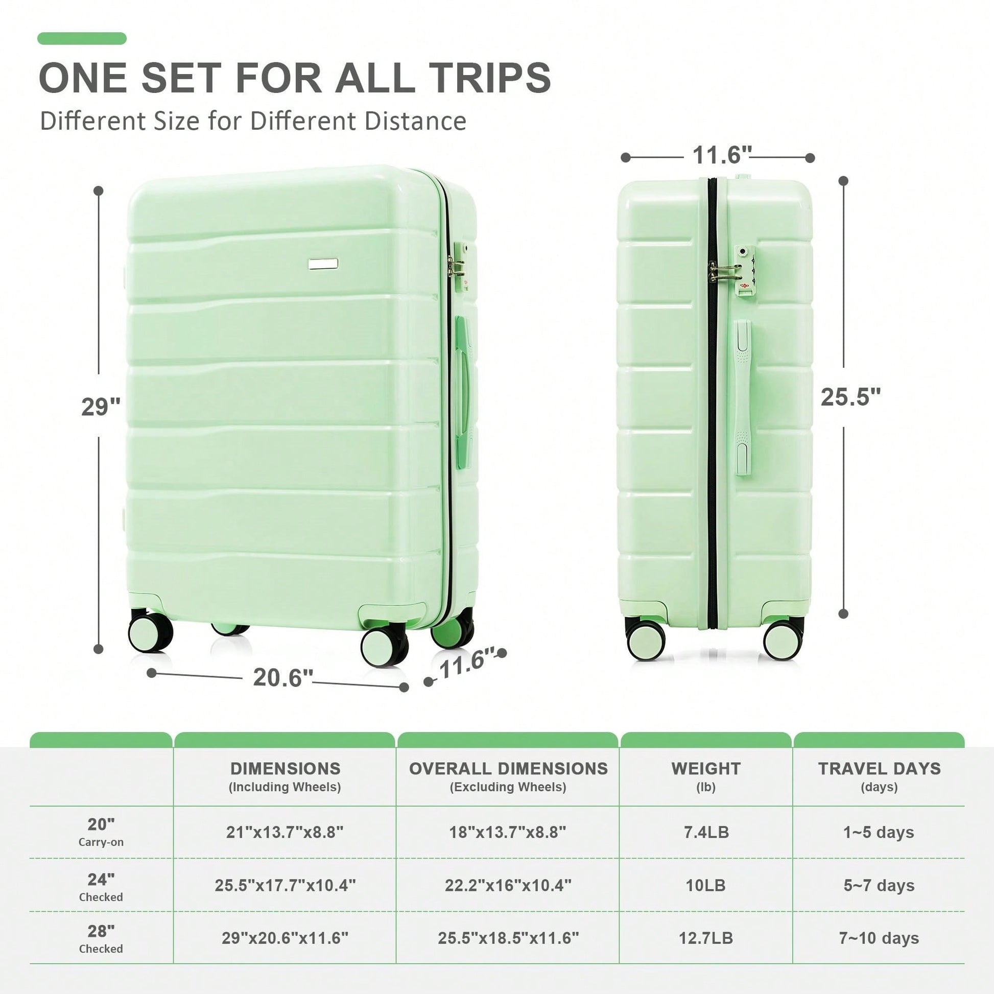 - Includes three suitcase sizes: 20, 24, and 28 inches.