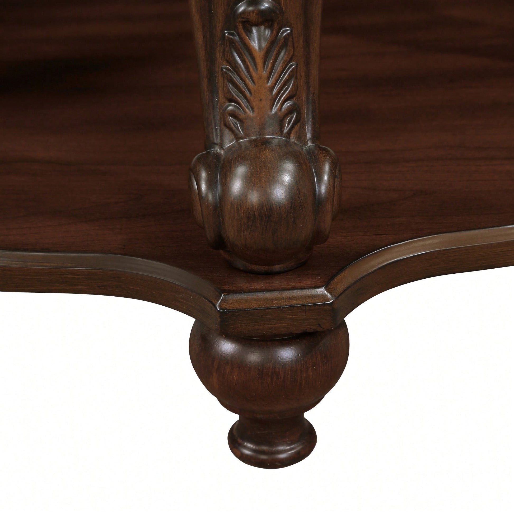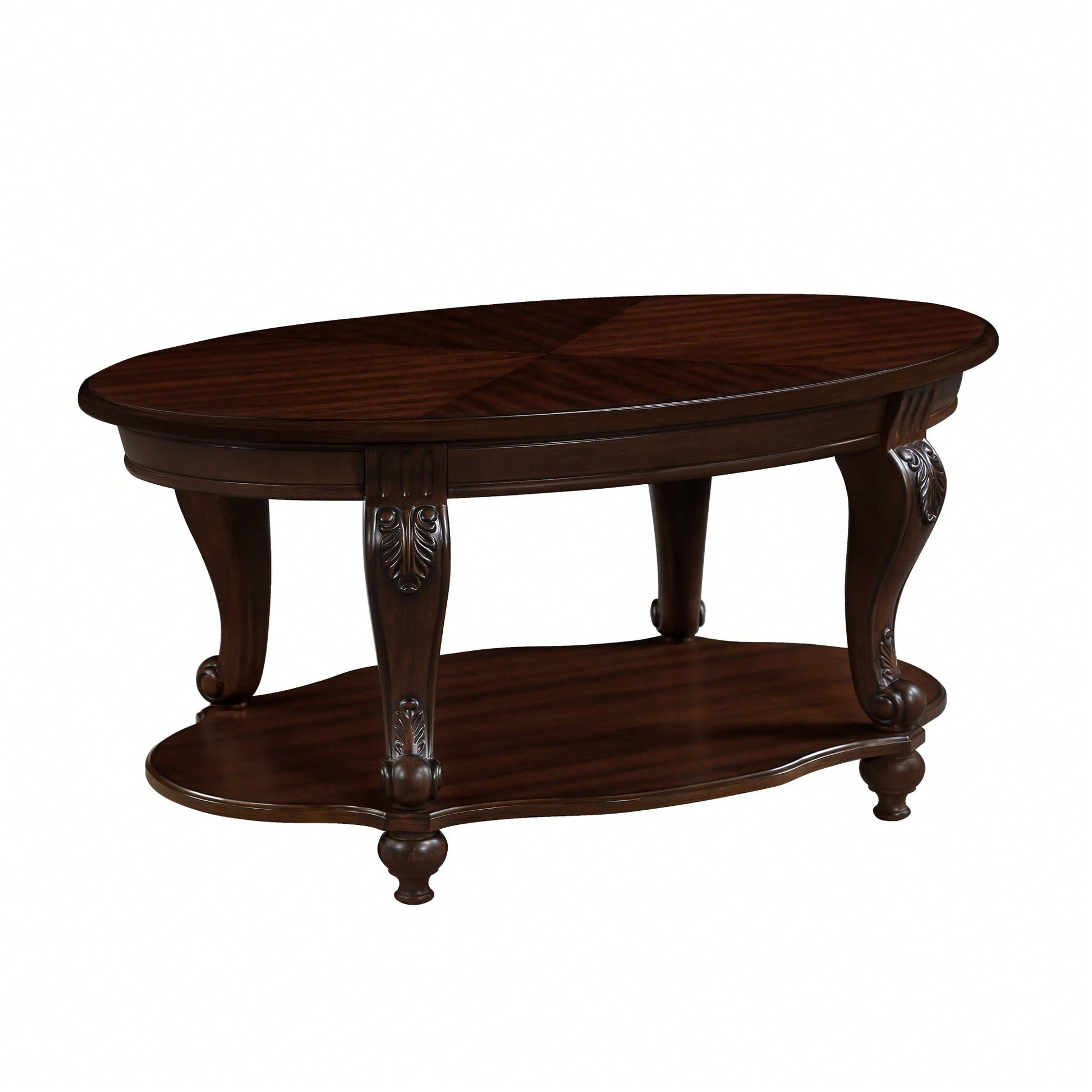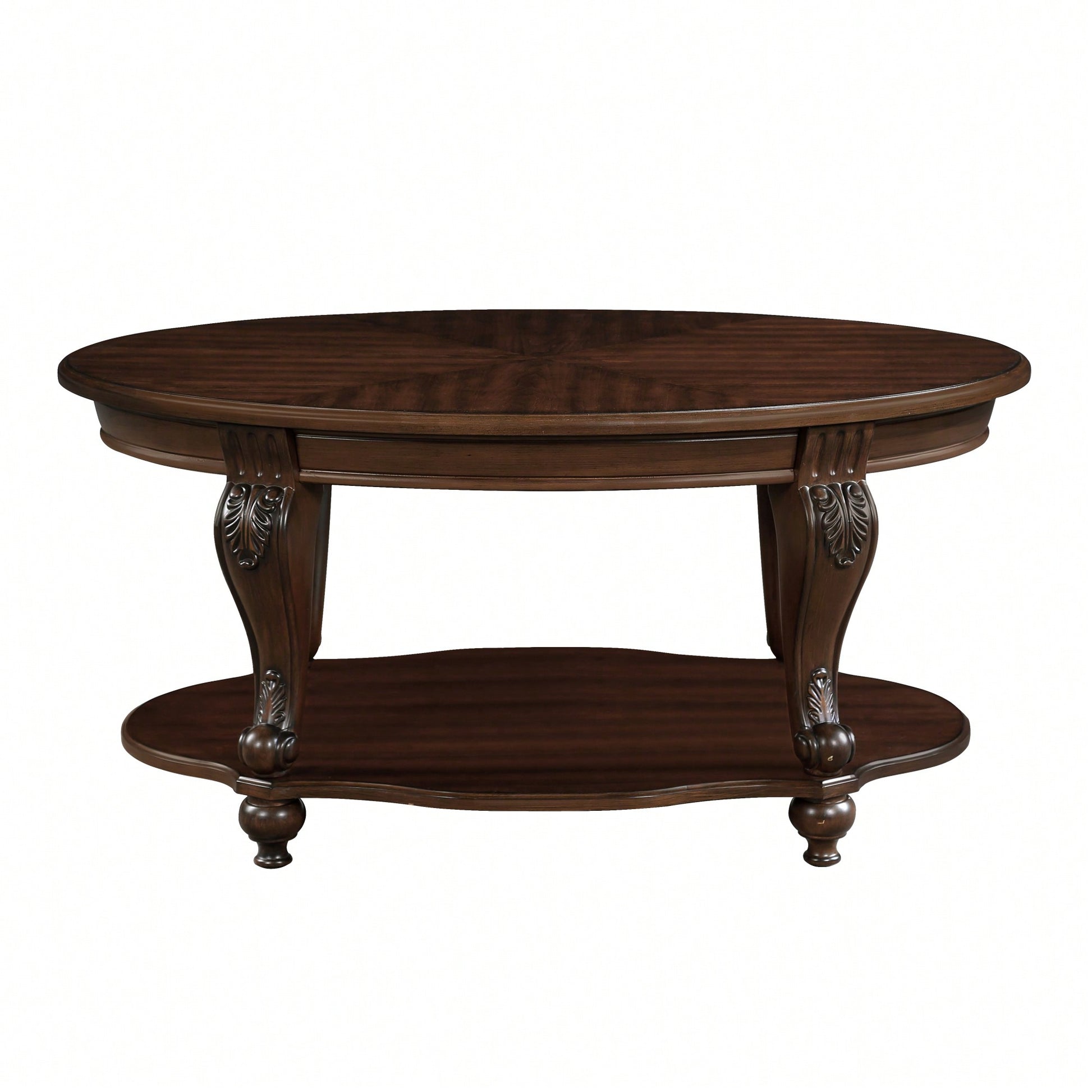 **Key Features** - Made of solid wood veneers and engineered wood with cast resin components. - Designed with a fixed lower shelf and an antiqued two-tone finish for a classic look. - Round corners and clean lines enhance safety and style. - Stable construction with solid rubber wood feet for durability and strong load-bearing capacity. - Easy assembly with included hardware and instructions. **Product Description** This elegant oval coffee table is designed to bring a touch of classical charm to your living space. Crafted from a combination of solid wood veneers, engineered wood, and cast resin components, it features a stunning antiqued two-tone finish and beautiful floral carvings that elevate its aesthetic appeal. The rounded corners not only contribute to its graceful design but also ensure safety, especially in homes with children. With ample storage space, this cocktail table measures 42" W x 26" D on the top and 37.4'' W x 24.4'' D on the lower shelf, making it suitable for both compact and spacious living rooms. The sturdy tabletop can support up to 397 lbs, while the lower shelf has a capacity of 132 lbs, providing versatile options for displaying books, decor, or storing essentials. The table is constructed to last, featuring solid rubber wood feet that offer stability and durability, far superior to standard particle board. The surfaces of the top and shelf are made from medium-density fiberboard (MDF) with a high-quality wood veneer finish, ensuring they are scratch-resistant and heat-resistant, so you can confidently place hot items on the table. Assembly is a breeze with easy-to-follow instructions, and all necessary hardware and tools are included, allowing you to enjoy your new coffee table in no time. **Specifications** - Tabletop dimensions: 42" W x 26" D - Lower shelf dimensions: 37.4'' W x 24.4'' D - Height: 20.5'' - Weight capacity of the tabletop: 397 lbs - Weight capacity of the lower shelf: 132 lbs