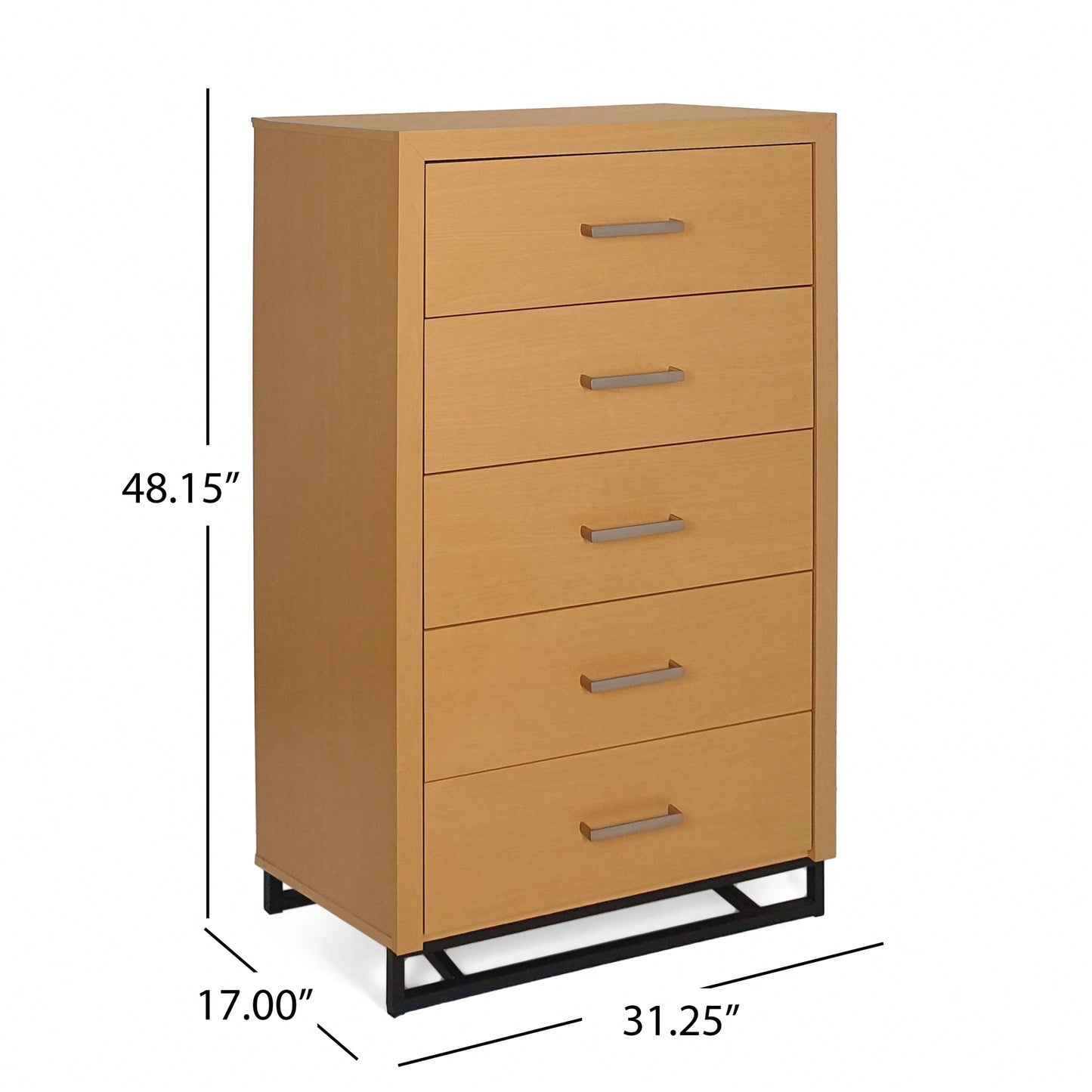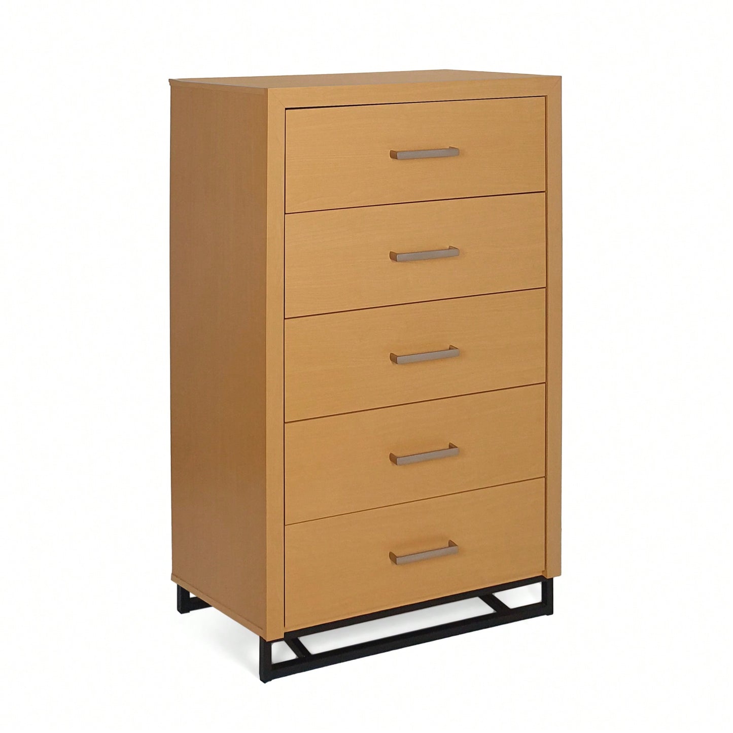 This five-drawer chest combines functionality and style, providing a perfect solution for tucking away your wardrobe while also offering a display area for your favorite items. The contemporary design features clean lines and a solid iron base, giving it an industrial touch that enhances any room's decor. With five drawers, you can easily organize your belongings, and the simple silver handles add a touch of elegance. The durable iron construction ensures that this dresser will withstand everyday use, while the black finish makes it a versatile addition to your home.