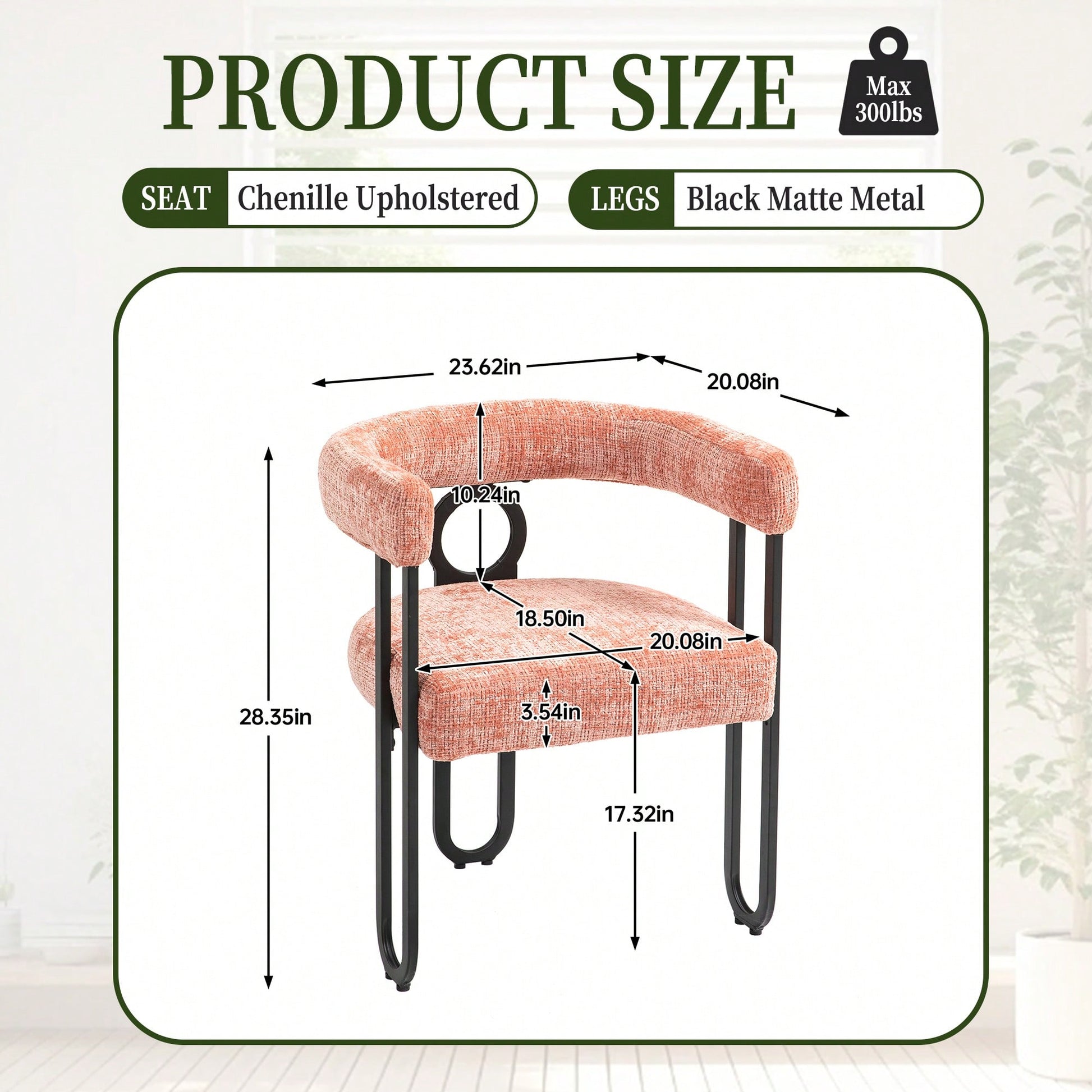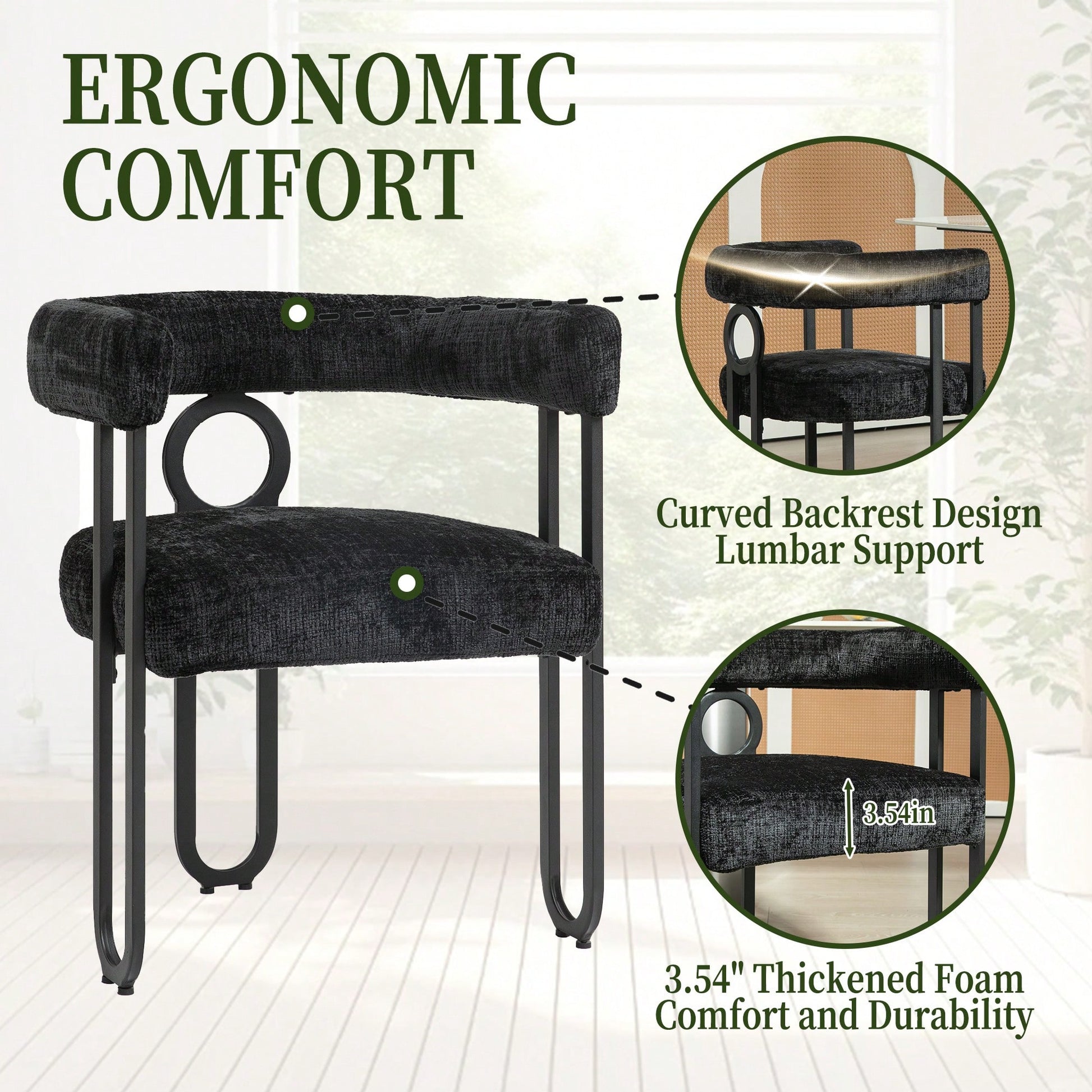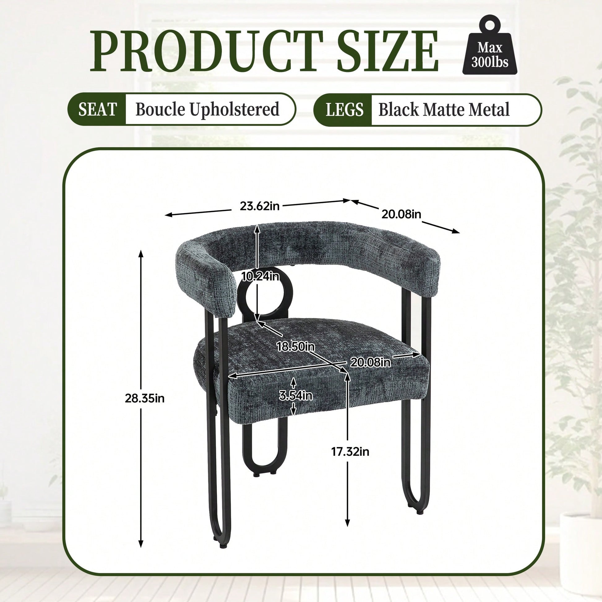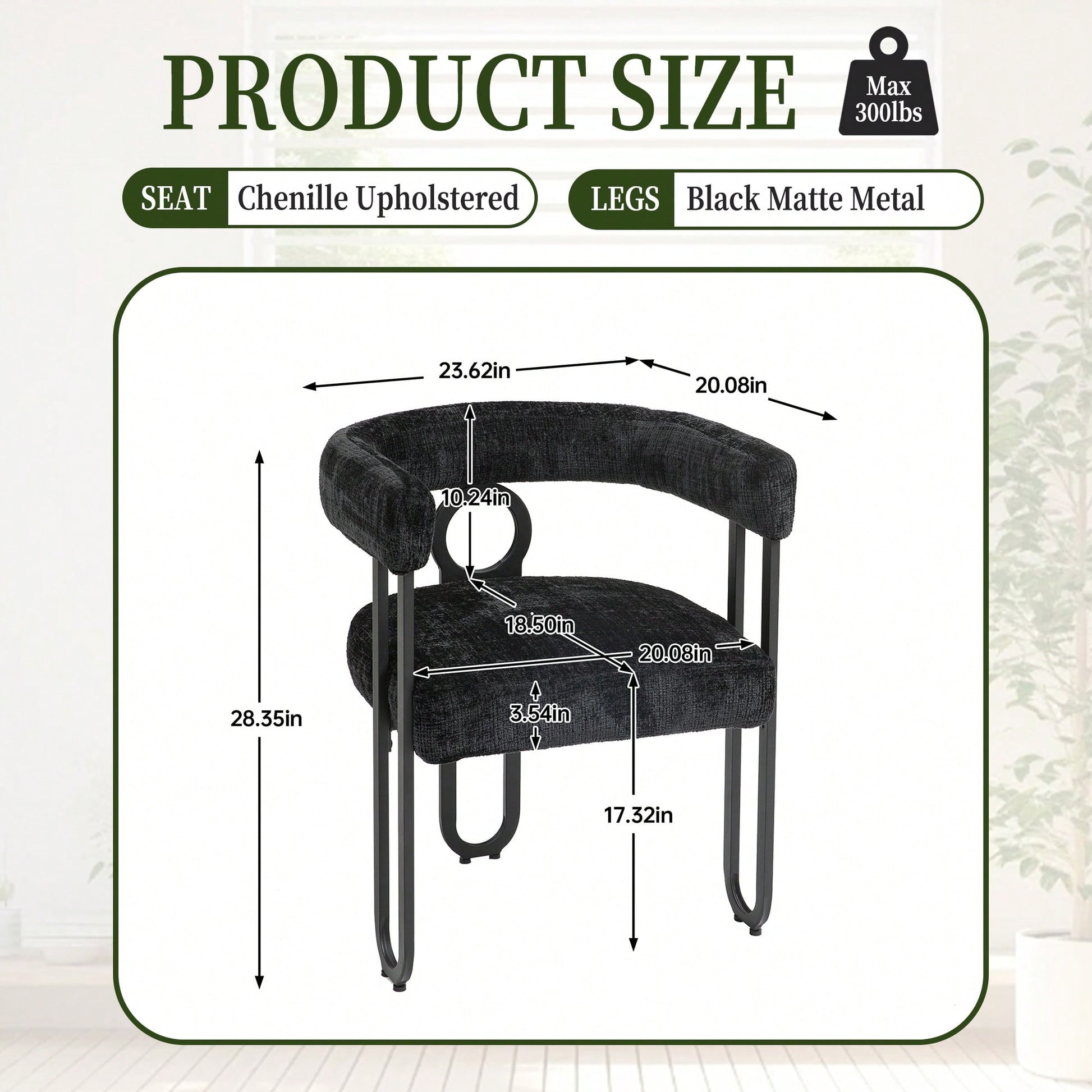 This accent chair showcases a modern design, featuring a unique round back that enhances aesthetic appeal while providing excellent support. The chair is built with a sturdy metal frame, ensuring durability and stability. Its thick round cushion, filled with high-density foam, offers superior comfort for extended seating. The beautifully curved backrest is padded, allowing for a soft and supportive lean when enjoying meals or unwinding. The matte black legs not only add a touch of sophistication but also ensure the chair can seamlessly fit into different decor styles.