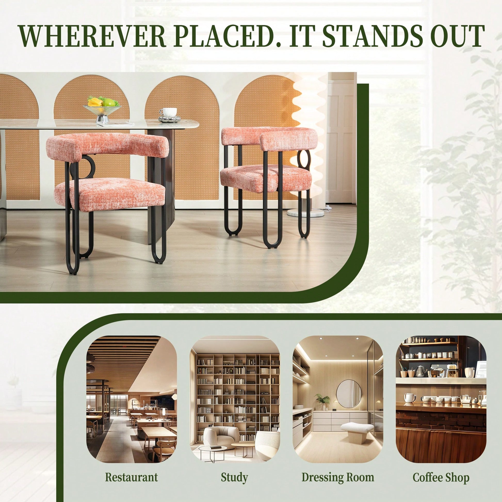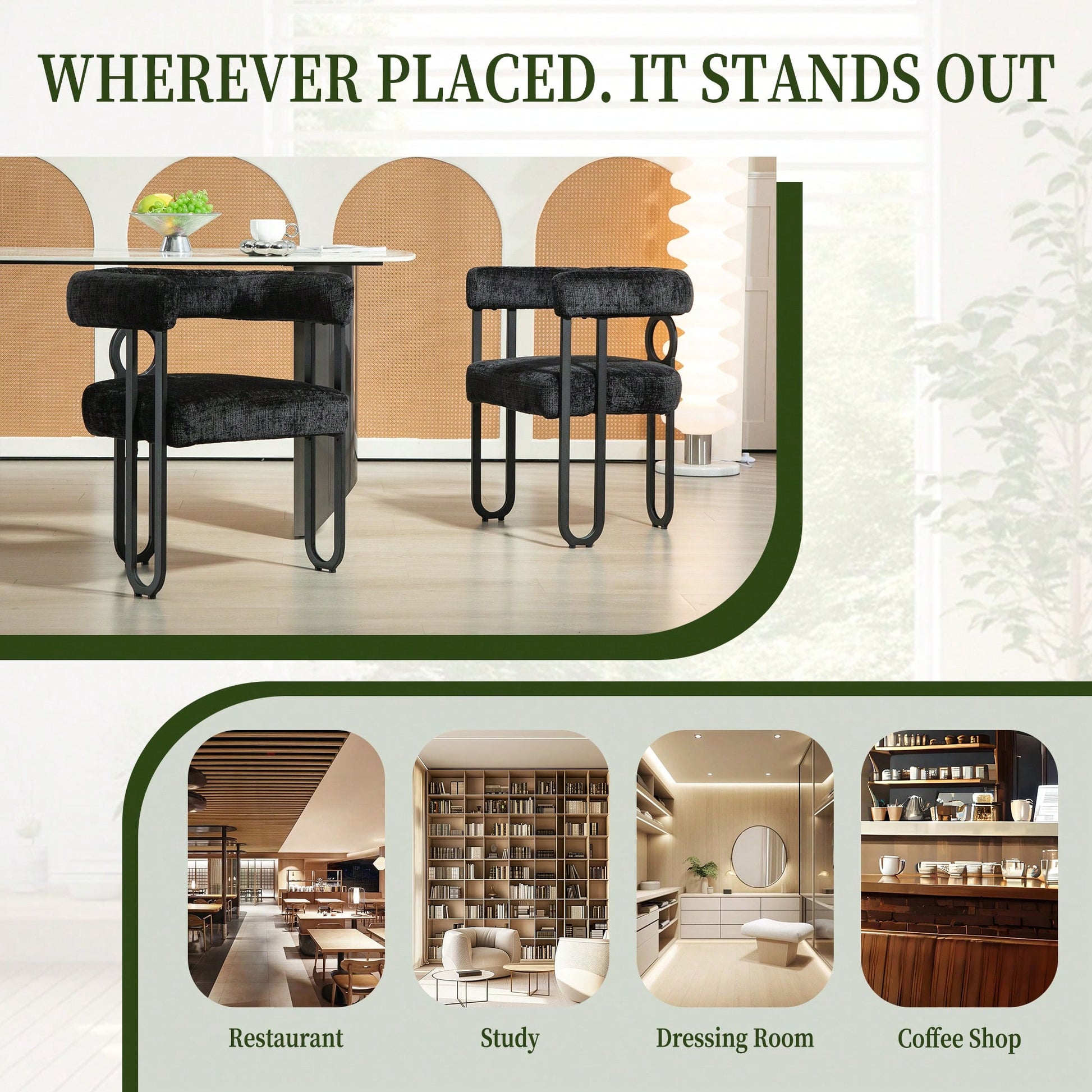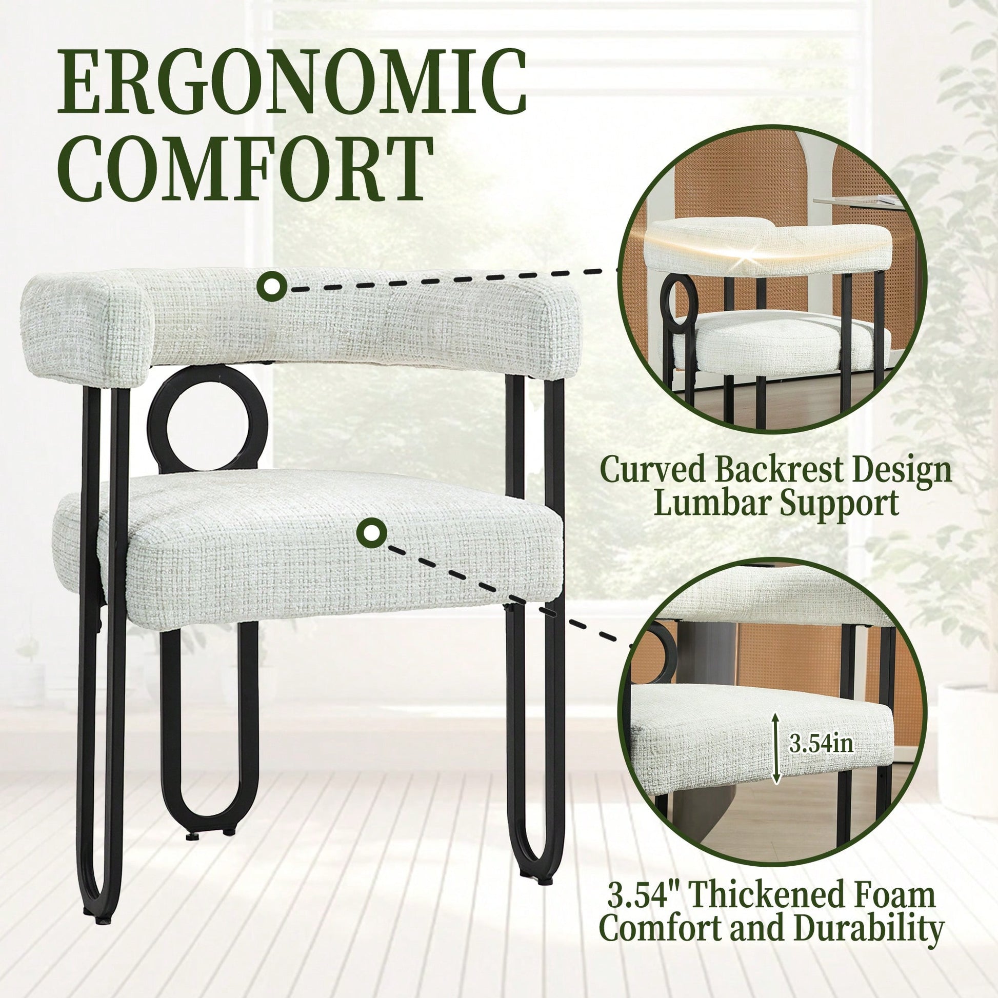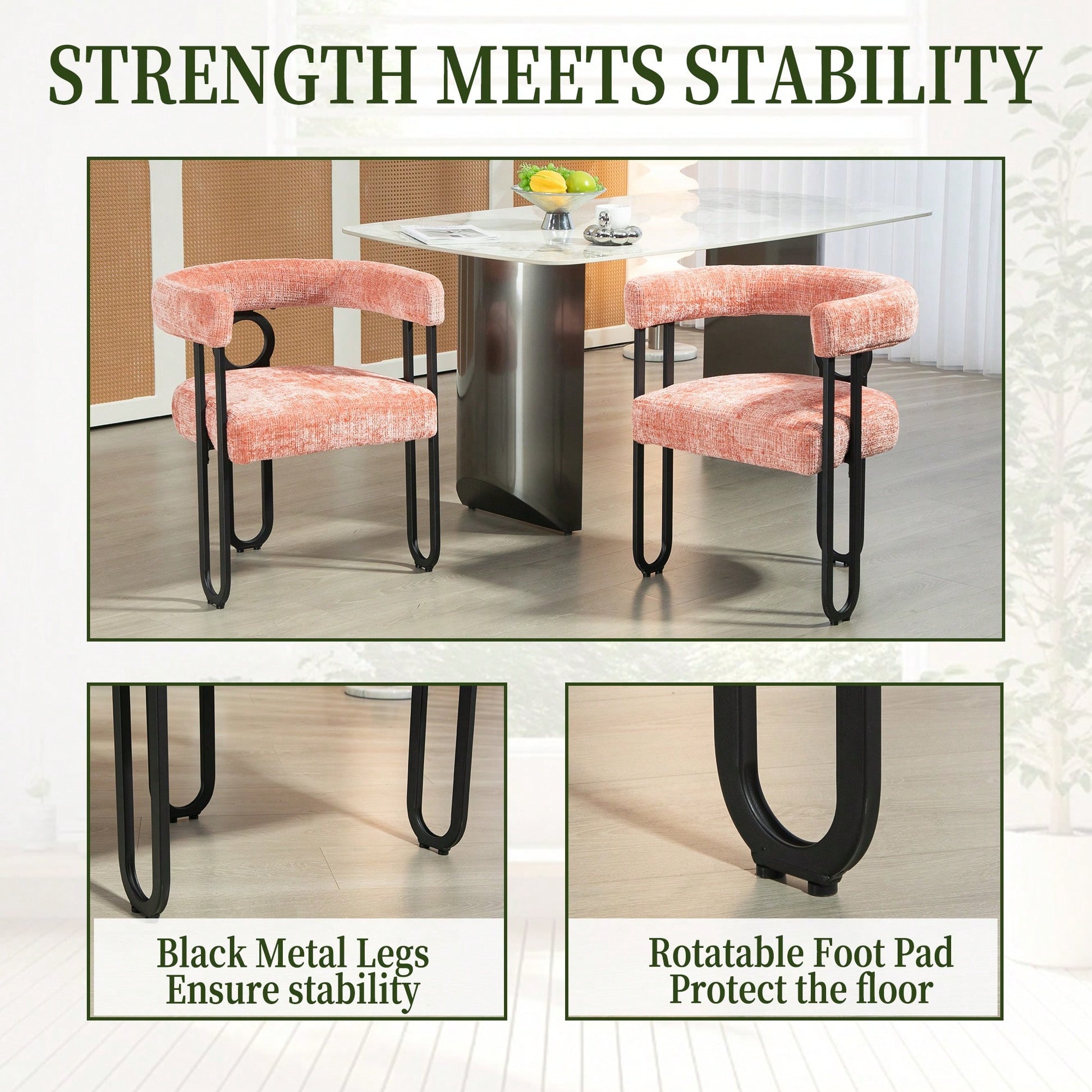 This accent chair showcases a modern design, featuring a unique round back that enhances aesthetic appeal while providing excellent support. The chair is built with a sturdy metal frame, ensuring durability and stability. Its thick round cushion, filled with high-density foam, offers superior comfort for extended seating. The beautifully curved backrest is padded, allowing for a soft and supportive lean when enjoying meals or unwinding. The matte black legs not only add a touch of sophistication but also ensure the chair can seamlessly fit into different decor styles.