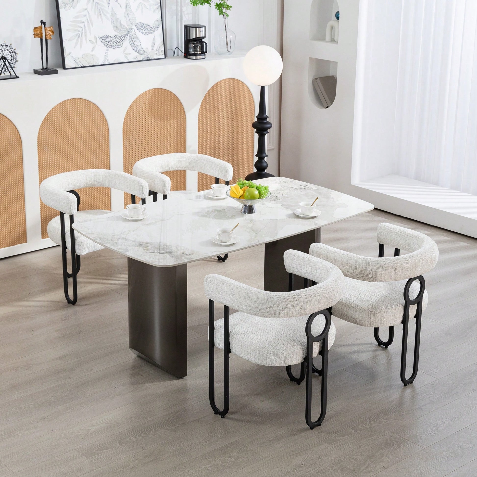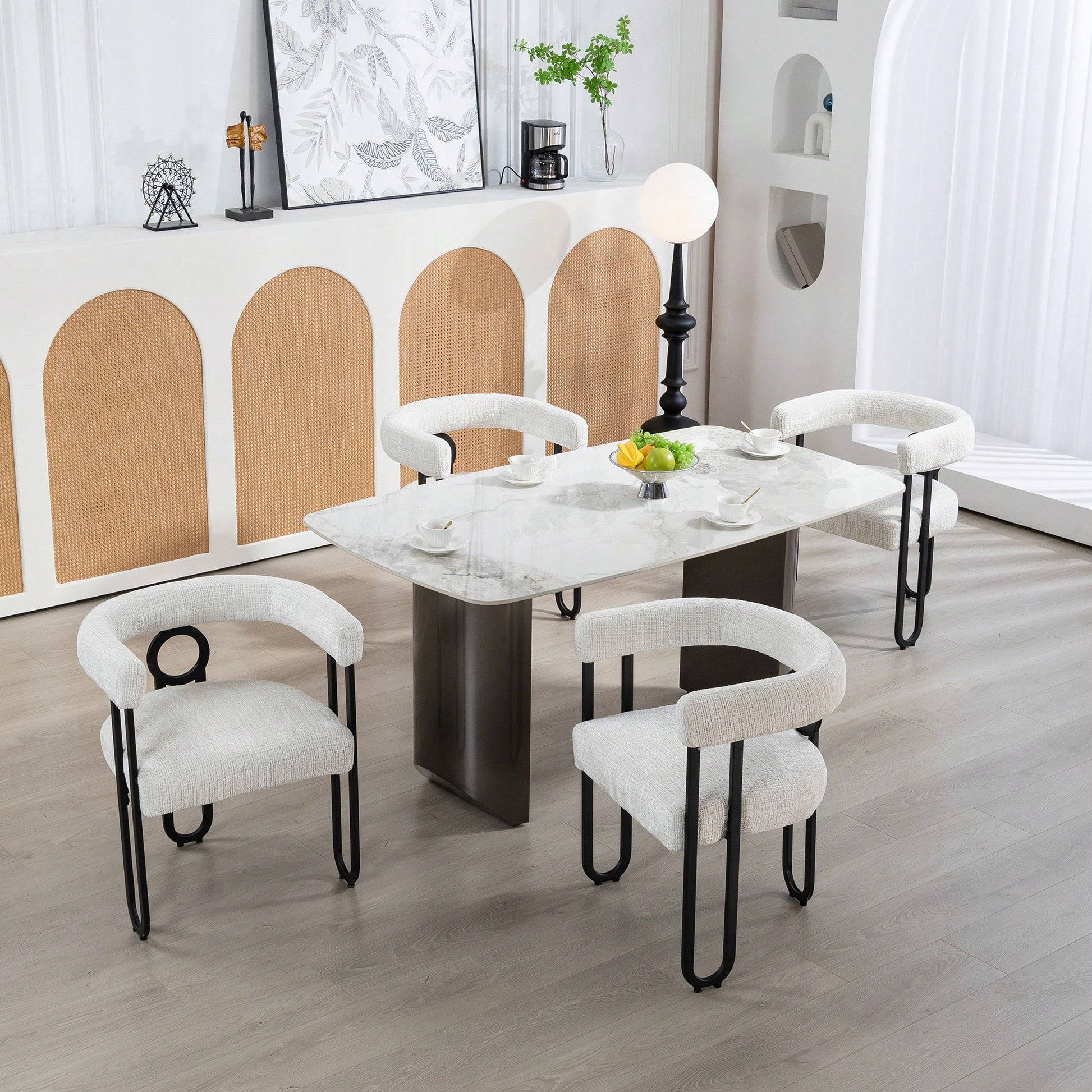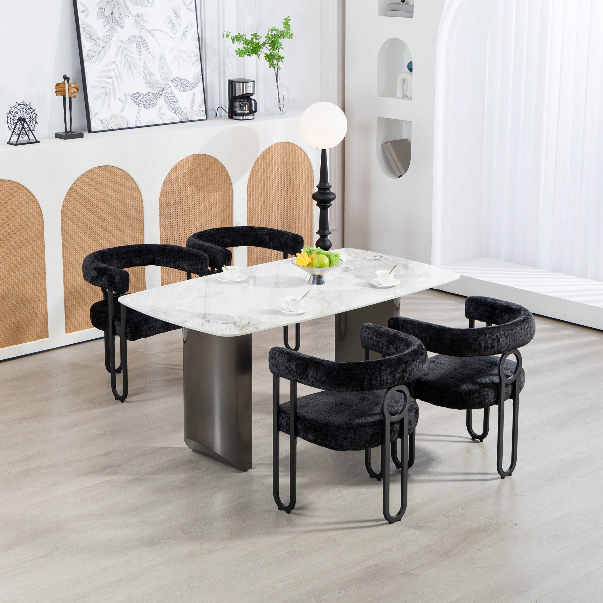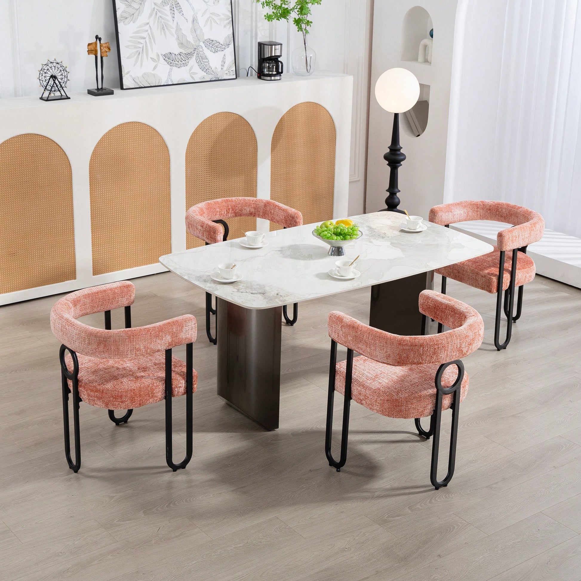 This accent chair showcases a modern design, featuring a unique round back that enhances aesthetic appeal while providing excellent support. The chair is built with a sturdy metal frame, ensuring durability and stability. Its thick round cushion, filled with high-density foam, offers superior comfort for extended seating. The beautifully curved backrest is padded, allowing for a soft and supportive lean when enjoying meals or unwinding. The matte black legs not only add a touch of sophistication but also ensure the chair can seamlessly fit into different decor styles.
