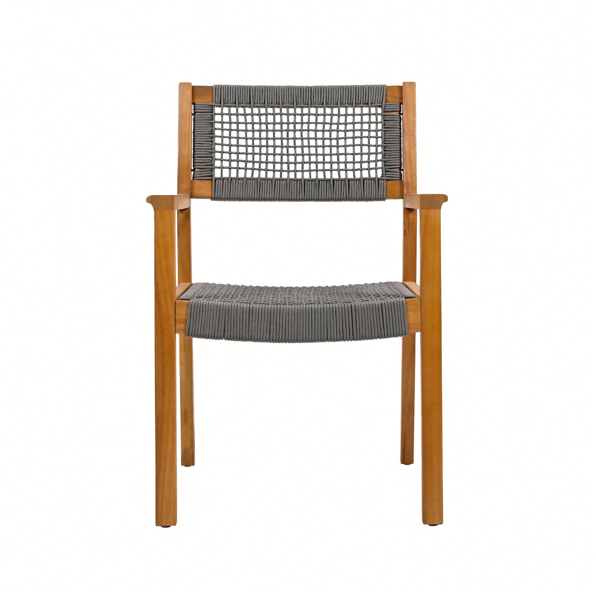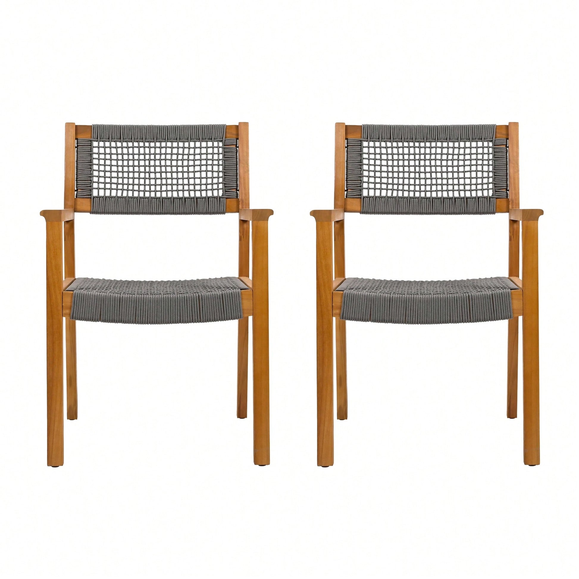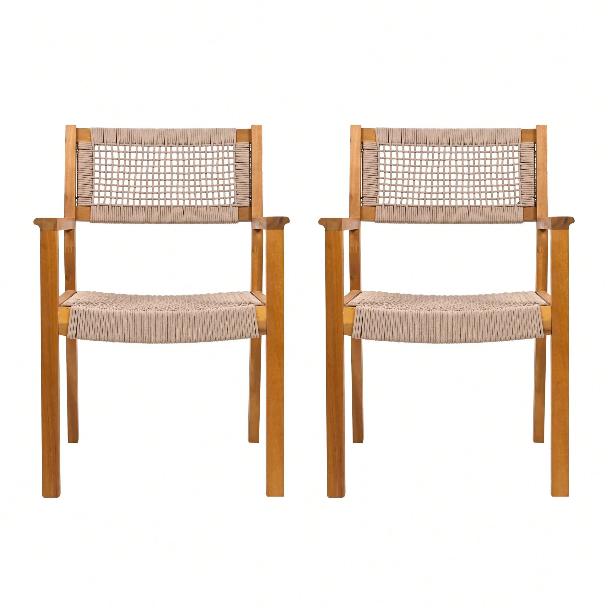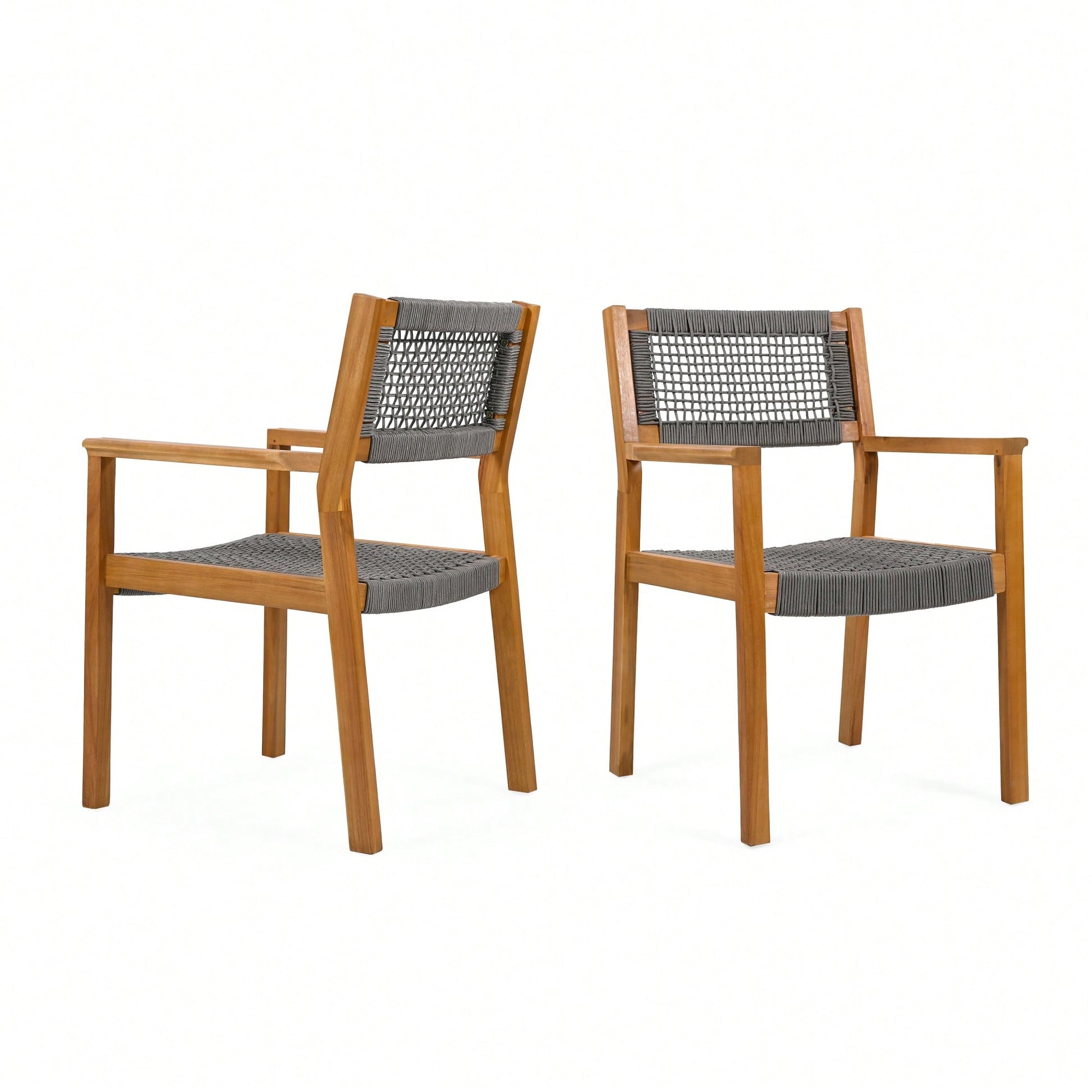 - Set of 2 chairs featuring a teak finish and light brown rope