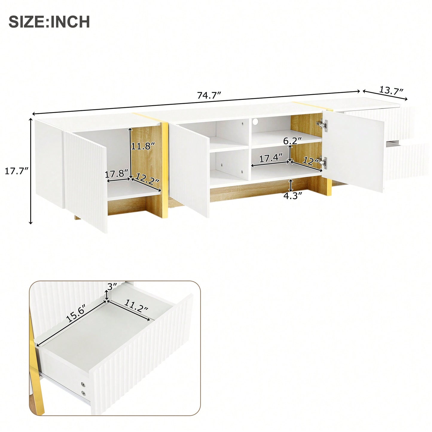 This elegantly designed TV stand combines modern sophistication with practical functionality, accommodating televisions up to 80 inches. The luxurious appearance features smooth fluted panels that exude a contemporary charm, enhanced by golden wood grain legs that add a touch of opulence.